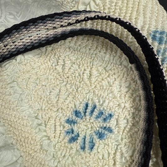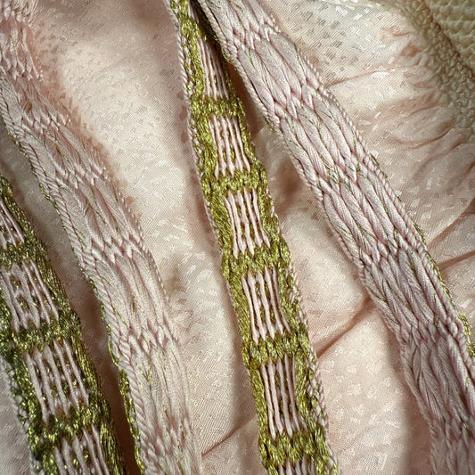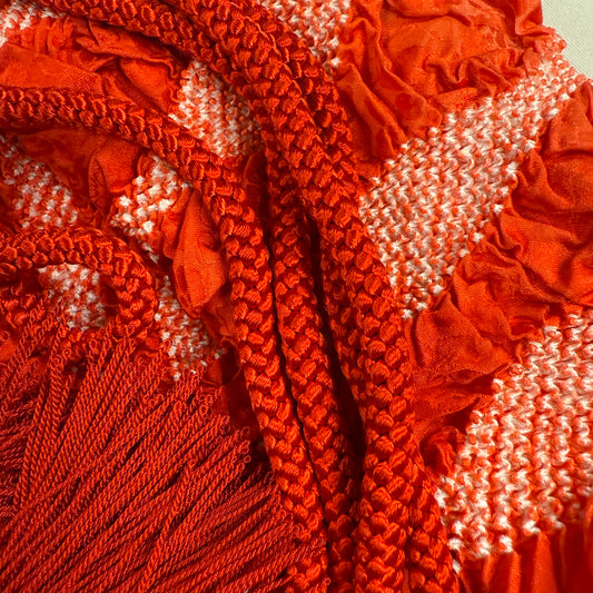 Obi accessories can include dozens of "kitsuke" (traditional kimono dressing) items, but we typically only carry obijime (the braided or woven cord that is tied on top of the obi) and obiage (the scarf-like length of silk that peeks out from behind the obi along the top).