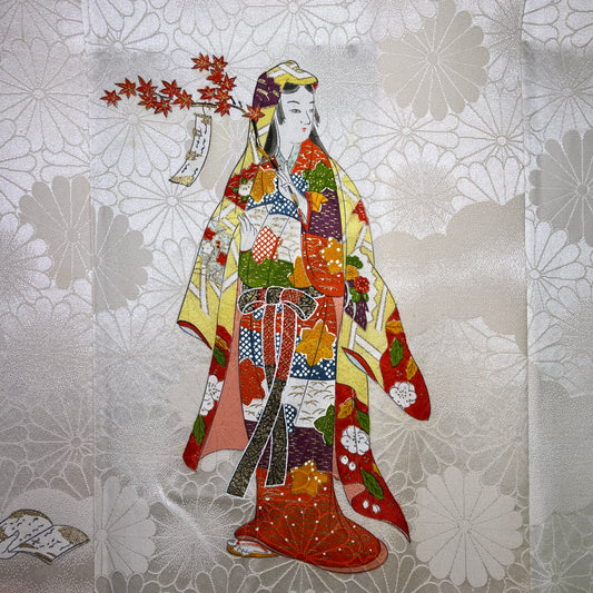 We create these display pieces - preserving as much of the original item as possible - as a way to add a touch of Japanese textile art to a decor space that can't accommodate a full kimono, haori, or obi. These smaller pieces also allow the viewer to focus on the finer details of the fabric, whether woven, painted, dyed, or embroidered....
