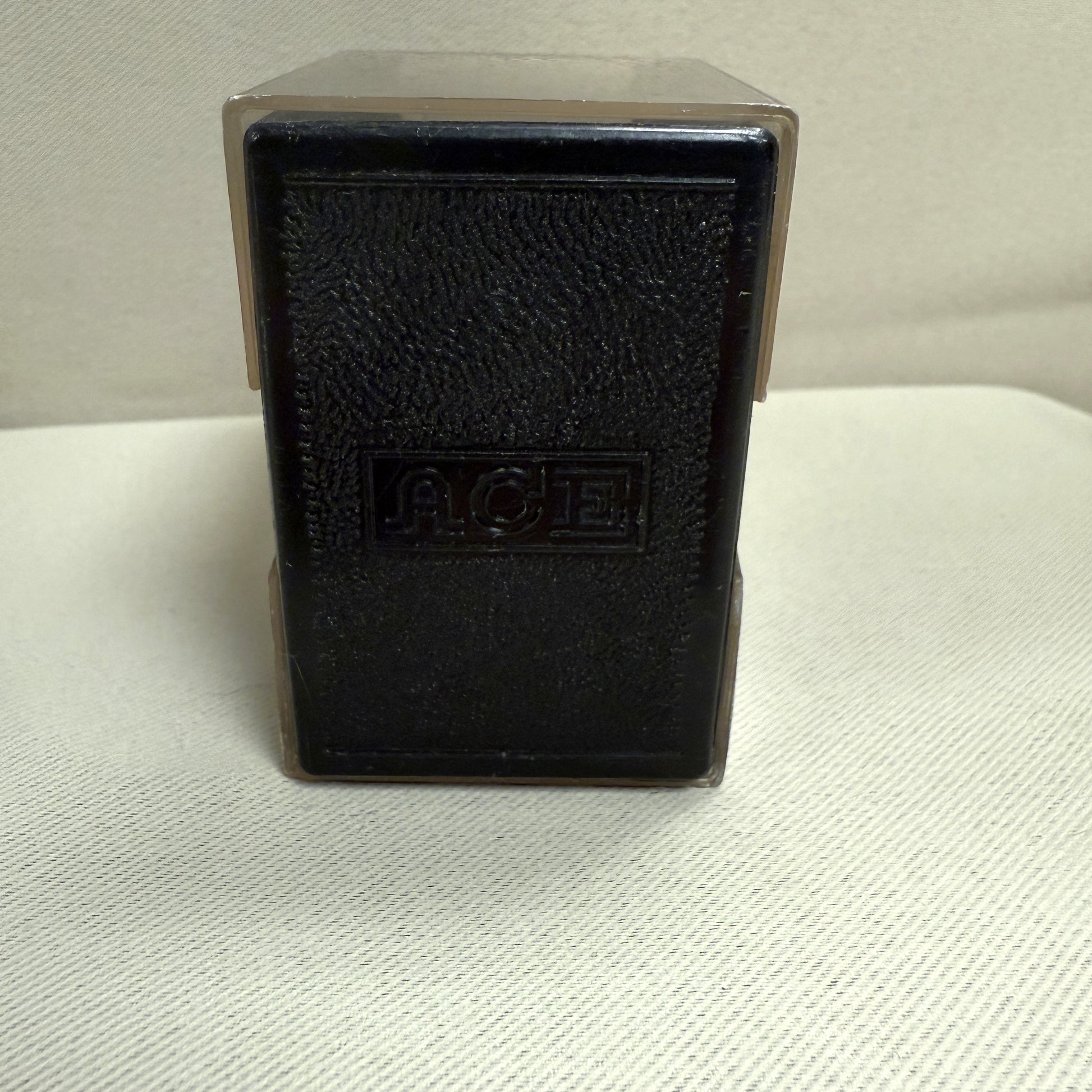 The deck is stored in a sturdy clear plastic lift top box with a black base with the trademark "ACE" on the underside. ACE is a well-known Japanese card manufacturer. The case shows expected wear but holds the cards well with an authentic retro look.