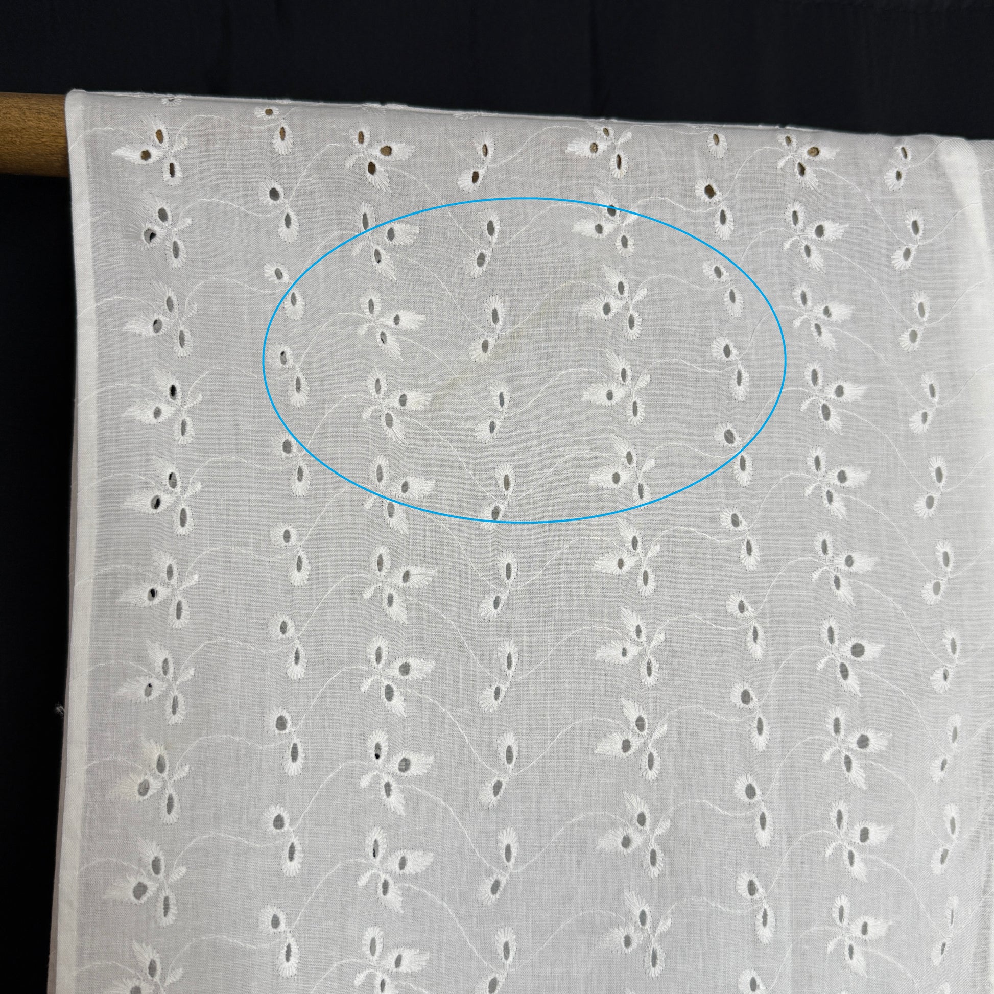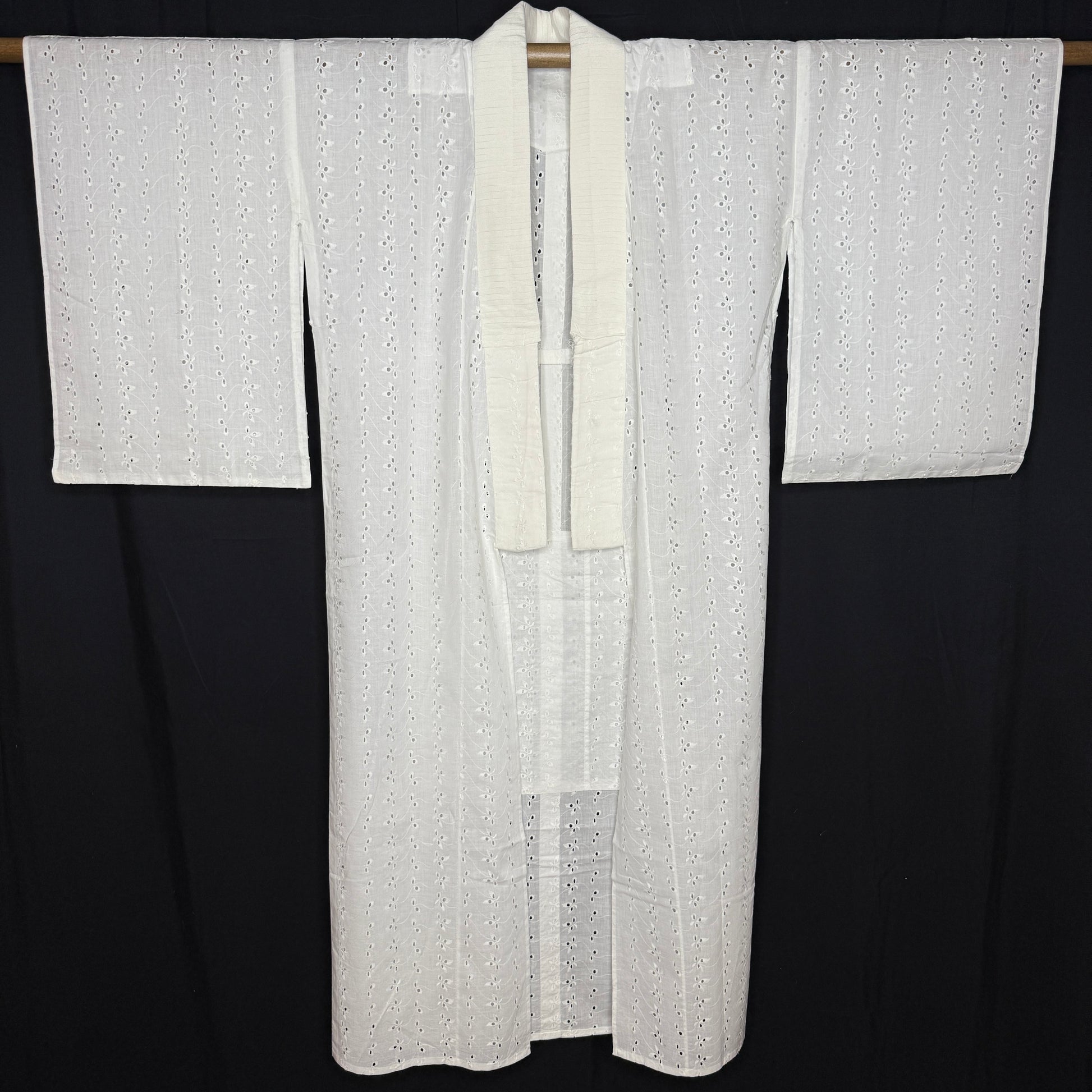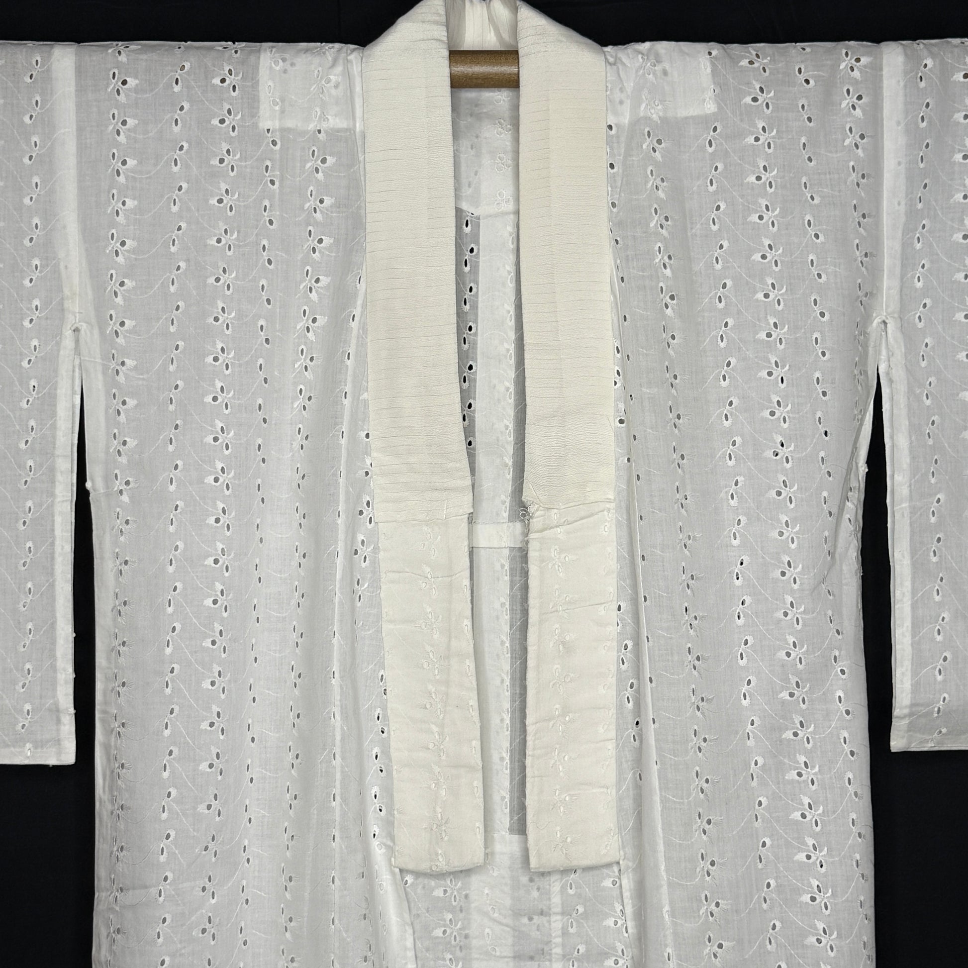 Light, breathable, and beautifully understated, this juban features a white open-weave fabric with delicate eyelet style detailing throughout. The pattern is a type of floral or foliage that connects with thin curling lines. The airy construction is ideal for warm weather layering.