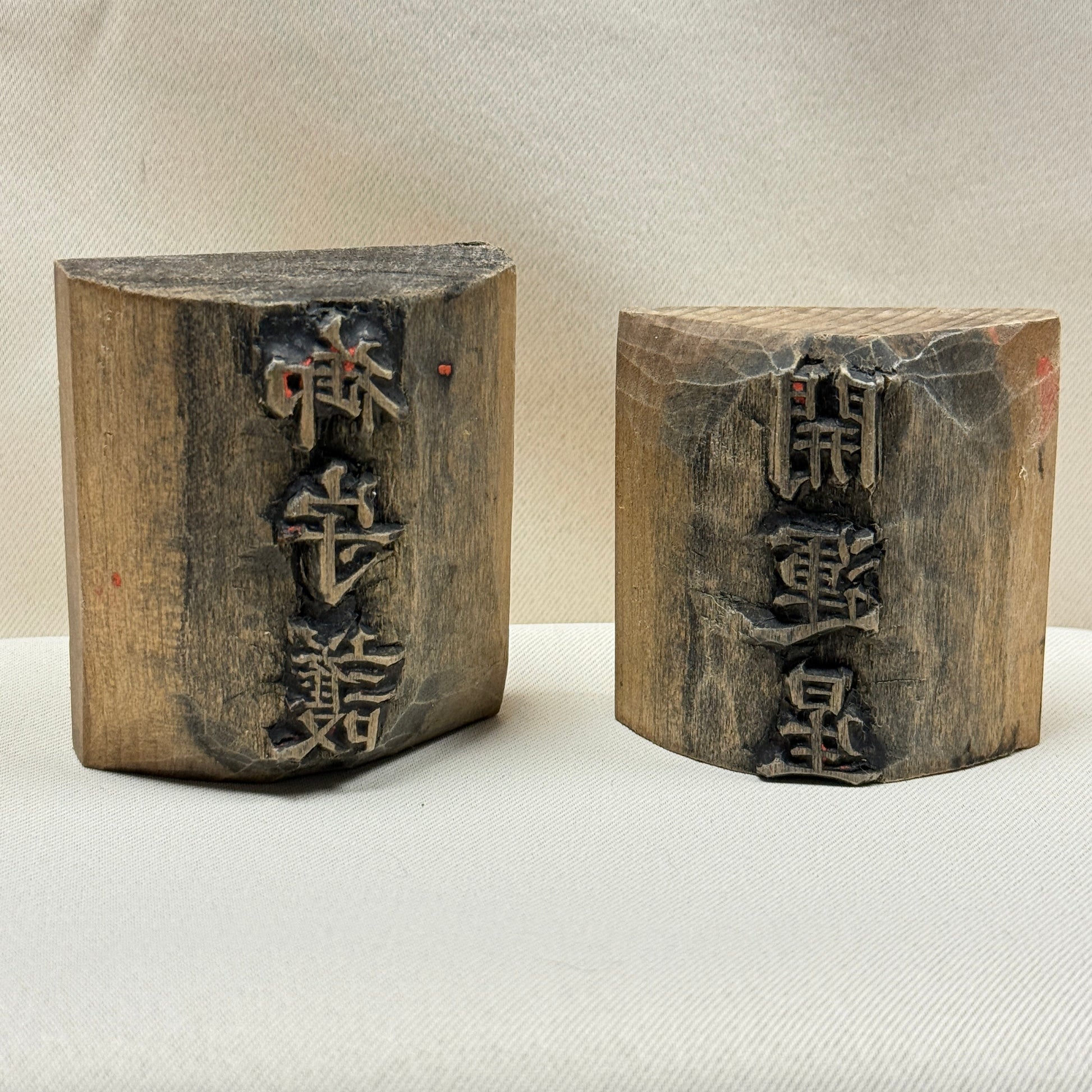 This listing is for a pair of vintage Japanese hand-carved wood printing blocks featuring auspicious phrases. The characters are carved in reverse so they would print correctly onto paper when inked.