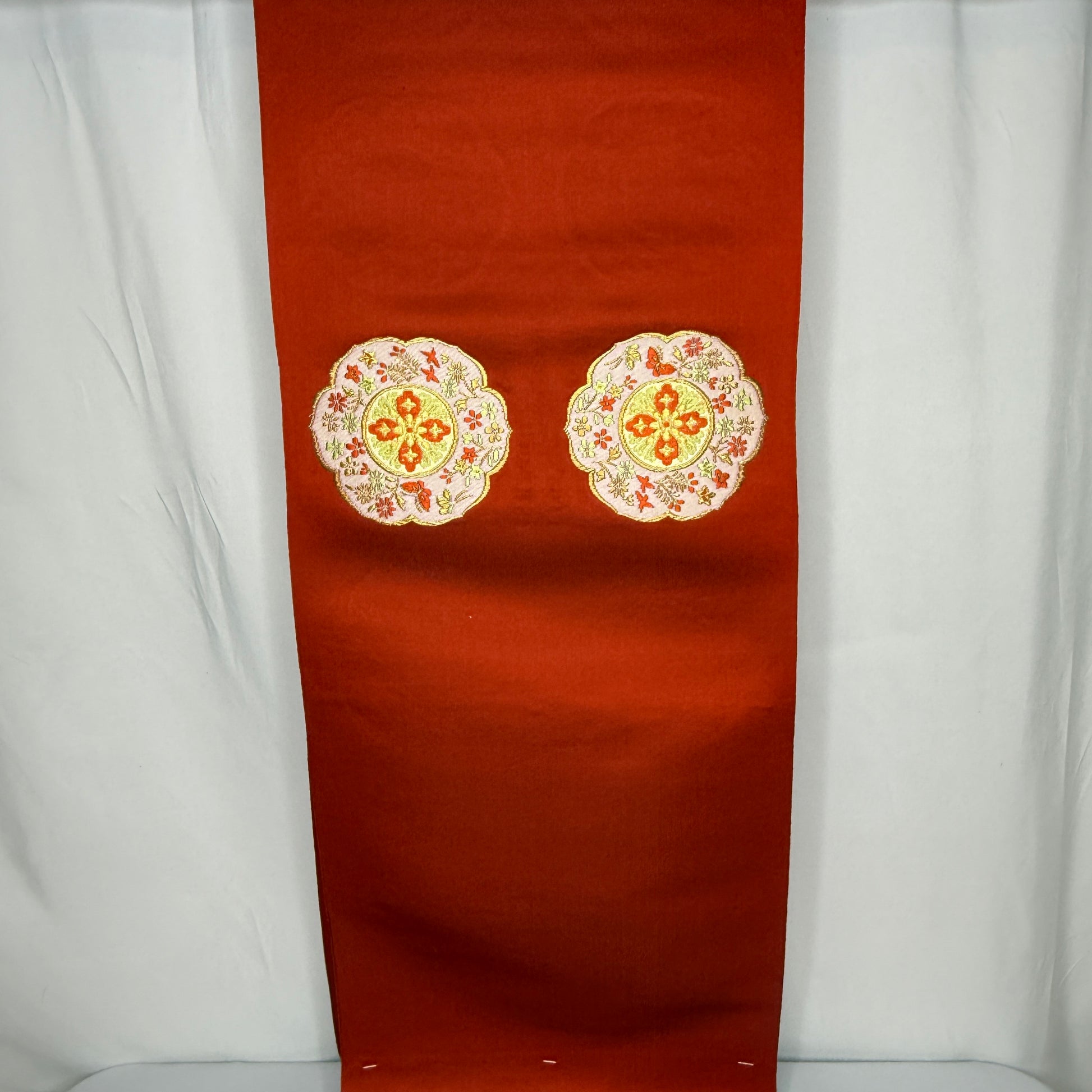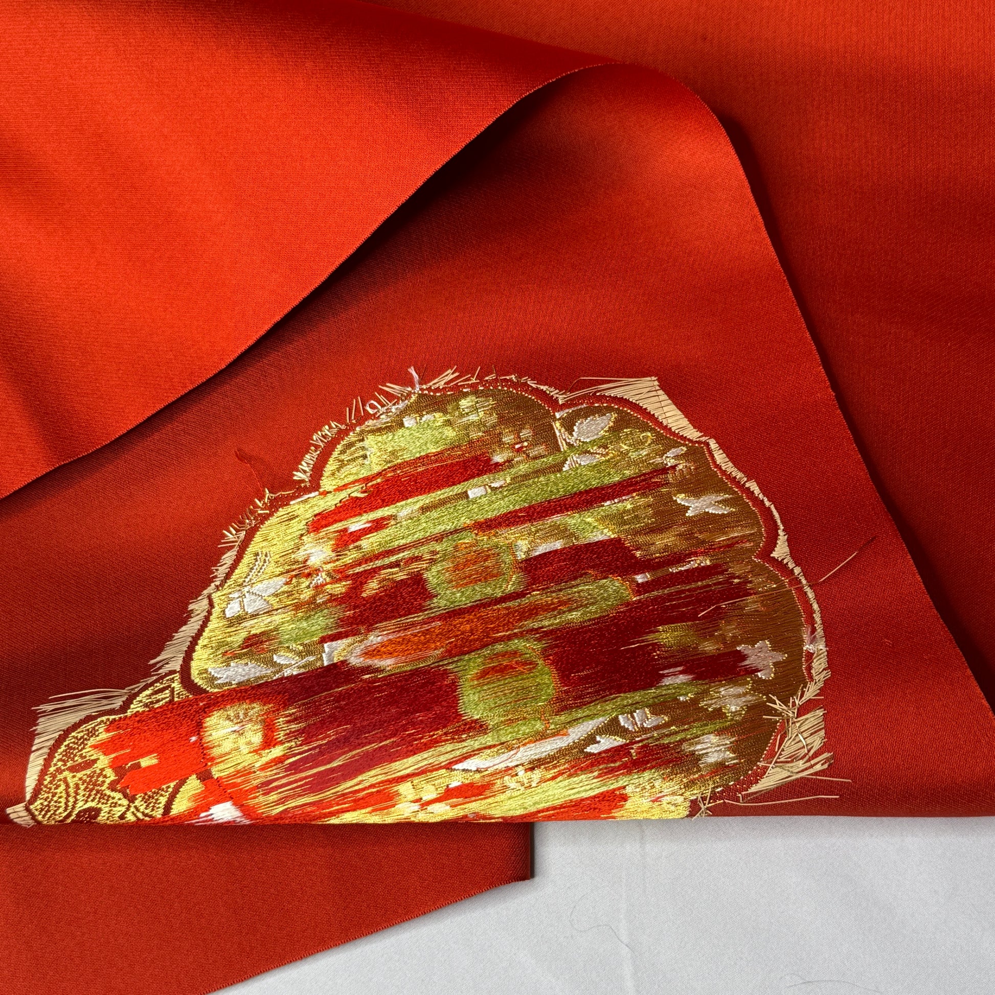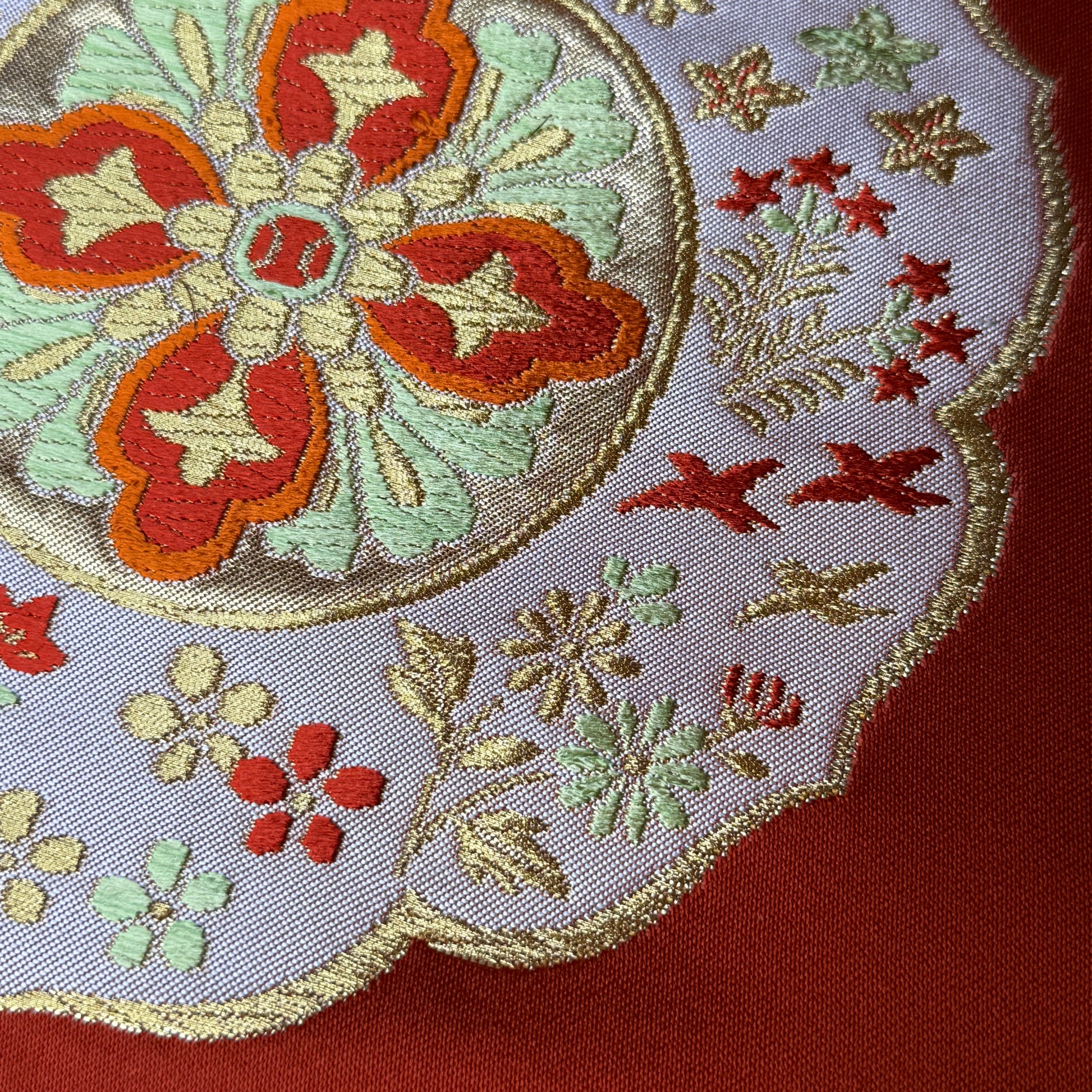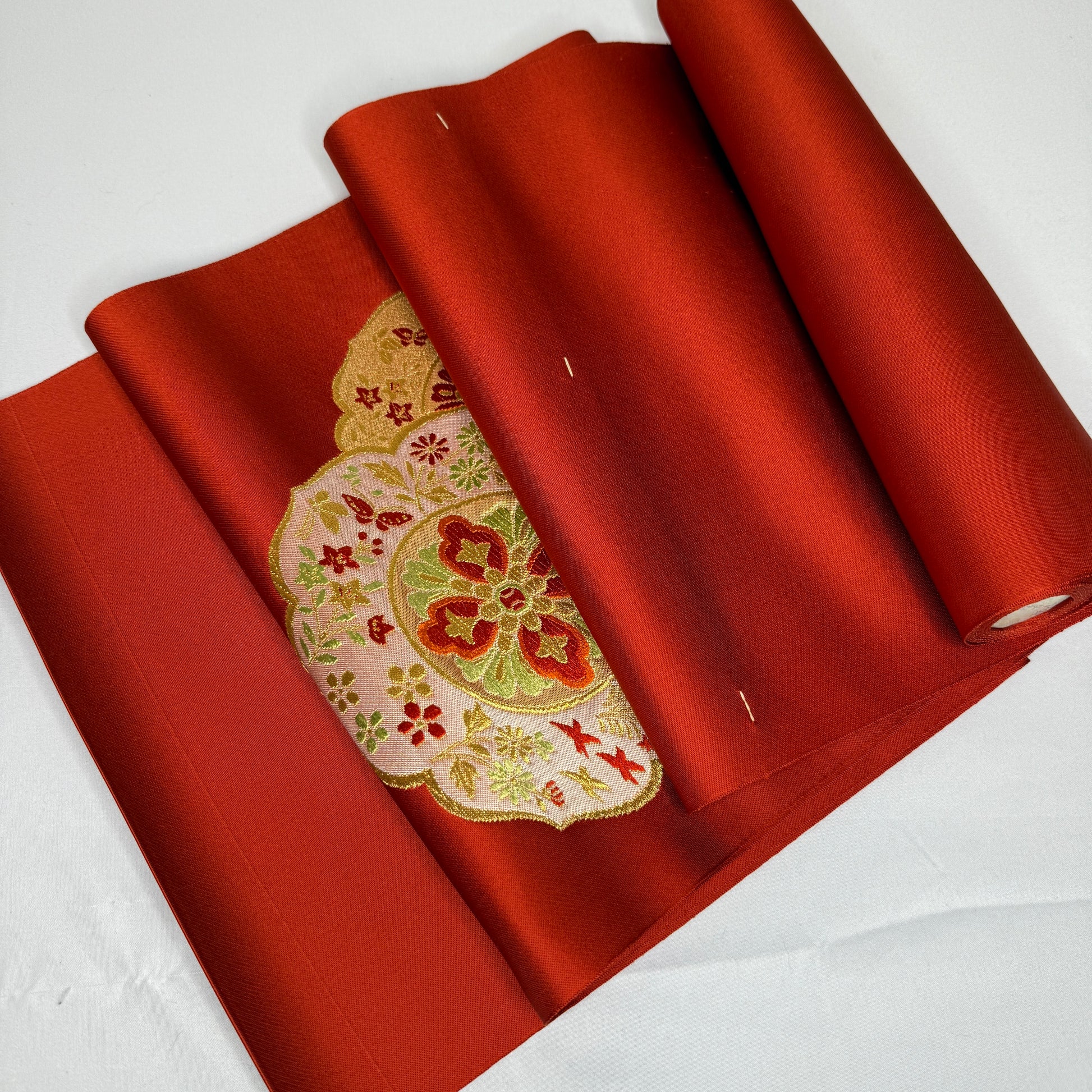 A warm red orange silk background gives this nagoya obi bolt a richness and depth, catching the light with a soft, luminous sheen. The decorative sections feature elegant woven floral medallions layered with small blossoms, leaves, and gold accented detailing, creating a refined composition that feels celebratory without being overly formal. Look closely to see the tiny birds in midflight!
