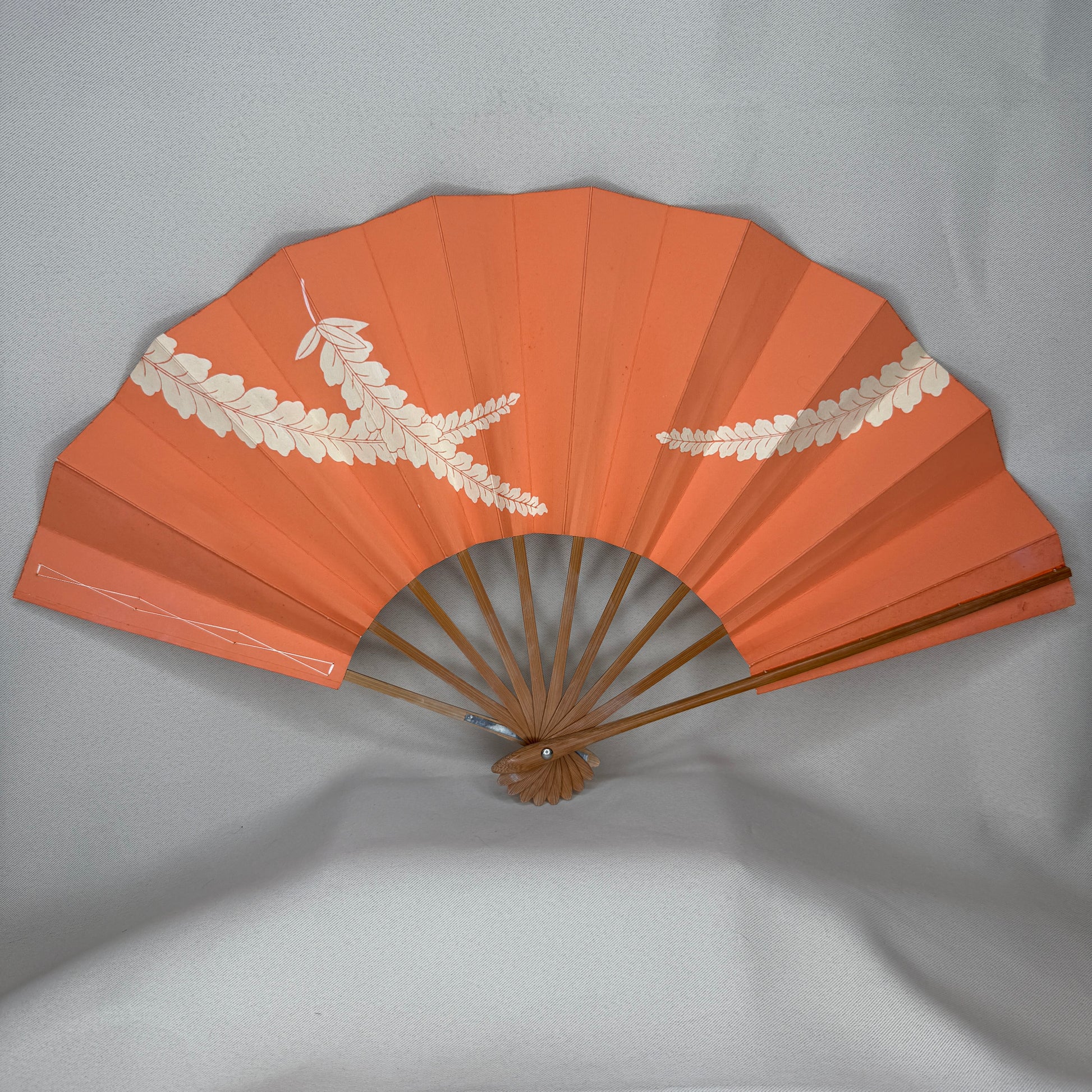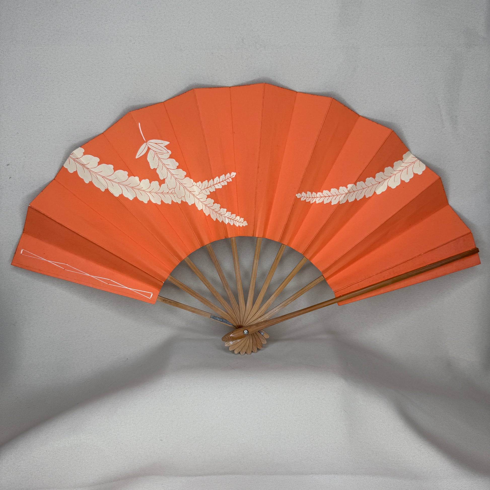 Vibrant yet understated, this orange Japanese folding fan features graceful cream-colored fronds that sweep across its folds as if caught in motion. The design balances energy and simplicity, with its warm color recalling sunset tones and its flowing leaves lending a sense of calm movement. Crafted with pleated paper and natural bamboo ribs. The pattern is the same on both sides.