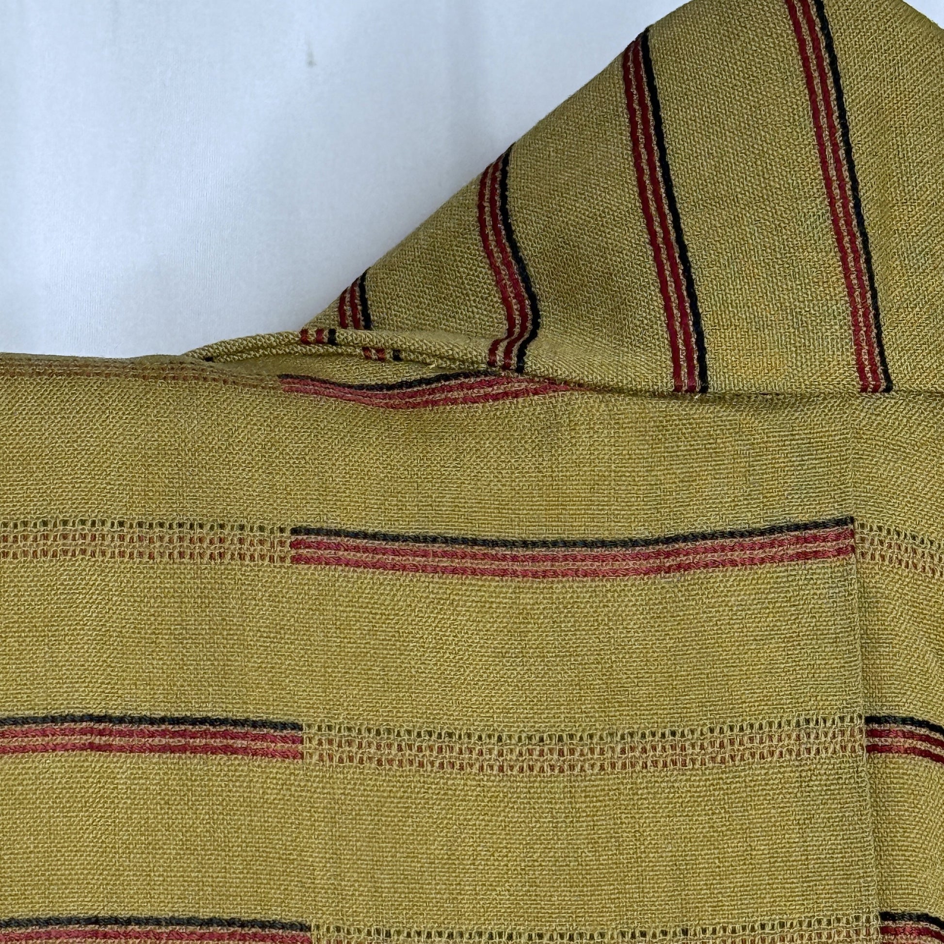 Earthy olive tones and small woven accents give this kimono a quiet, textured look. The olive brown-green background is crossed with short red and black woven dash stripes, creating a rhythmic pattern that adds subtle movement across the fabric.