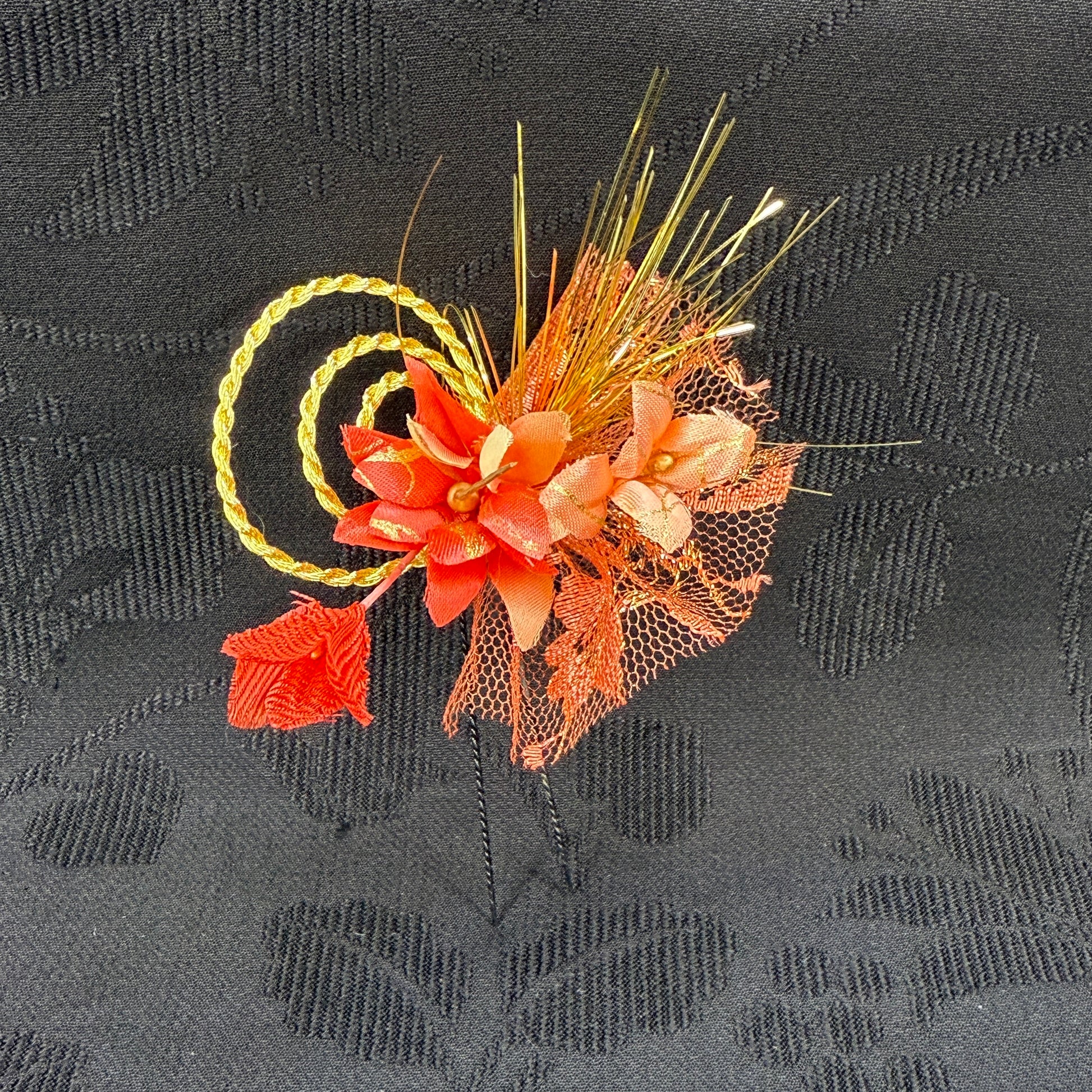 A burst of radiant color and movement, this vintage Japanese kanzashi hair pin embodies the warmth of autumn and the glow of celebration. Rich orange and red fabric petals are highlighted with gold threads and tinsel sprays, surrounded by a delicate lace accent and a spiral mizuhiki loop symbolizing longevity and good fortune.