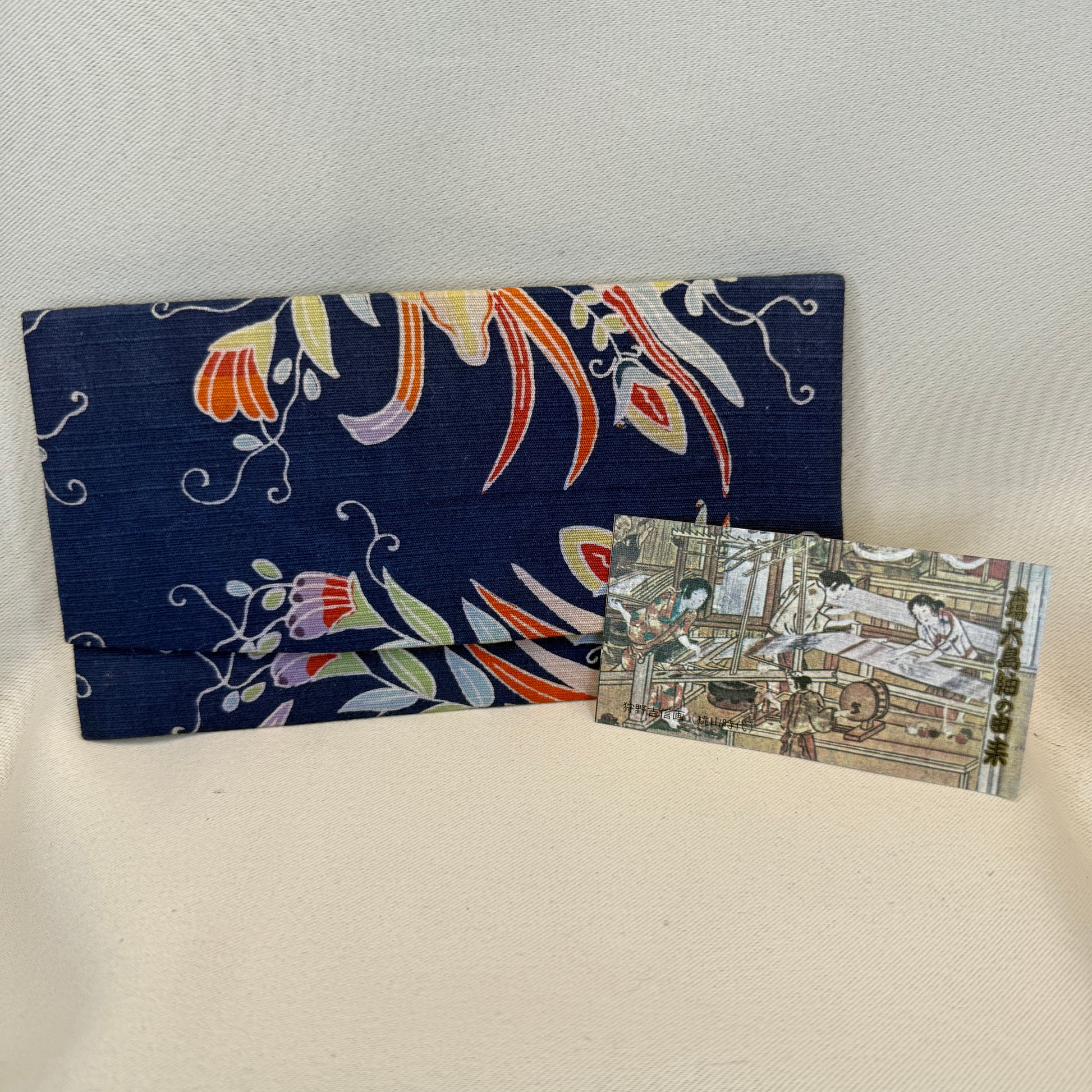 Handcrafted in Okinawa, this envelop-style wallet radiates the joyful color and artistry of Japan's southern islands. The blue fabric bursts with hand-stenciled floral and leaf motifs in vivid hues of coral, lilac, and gold, representing nature's abundance and good fortune.
