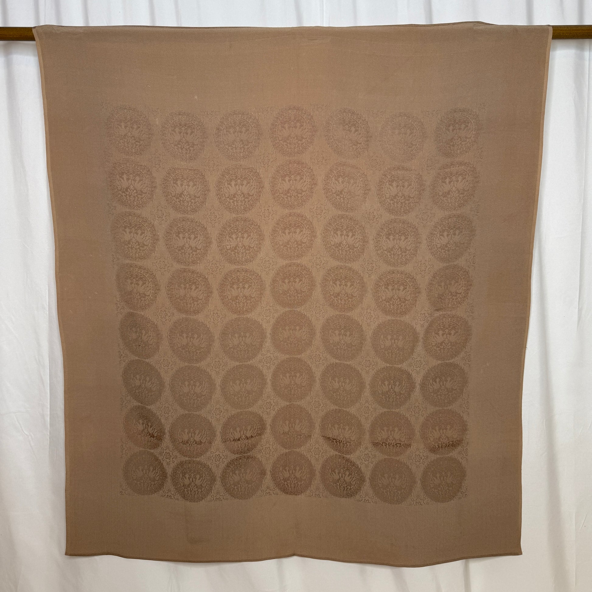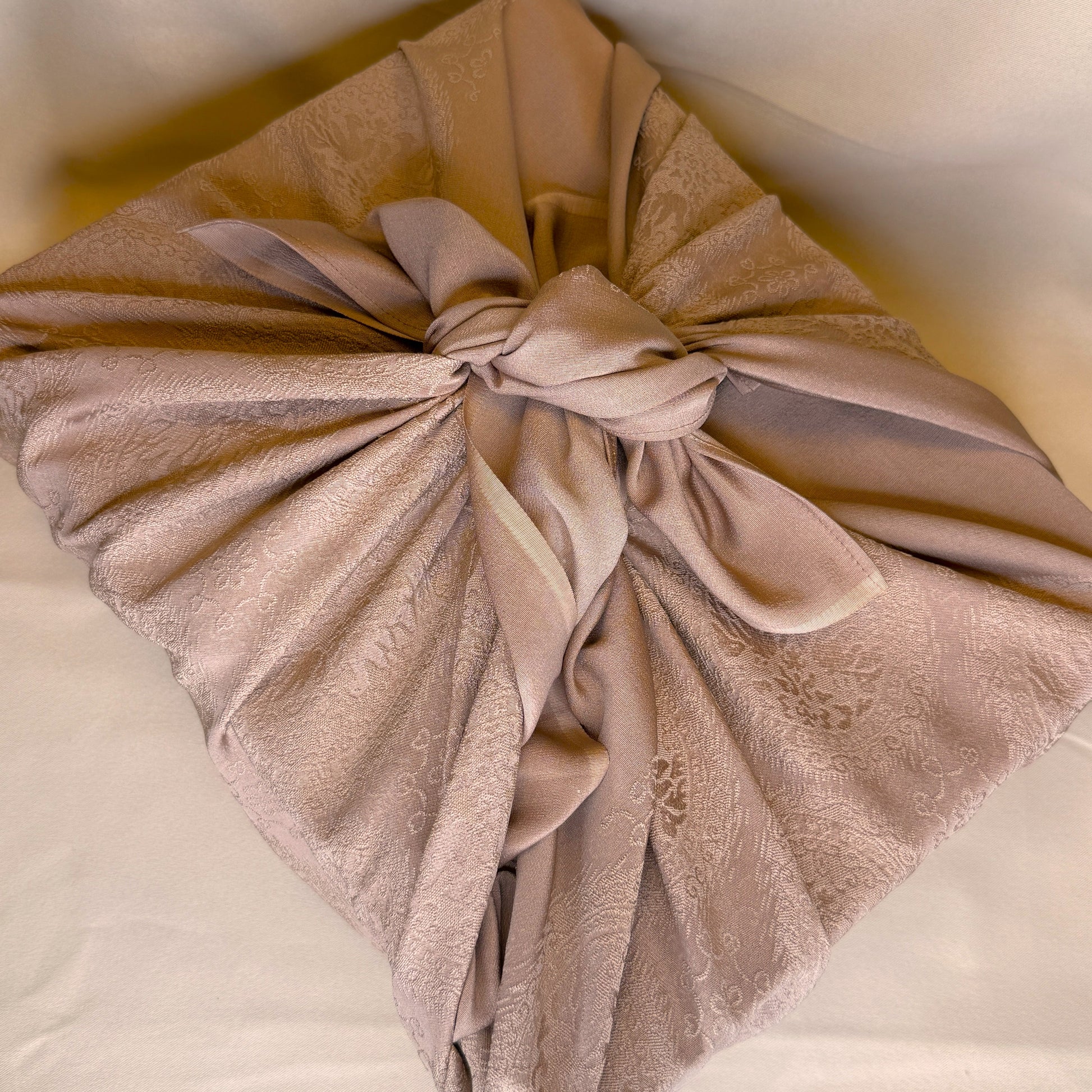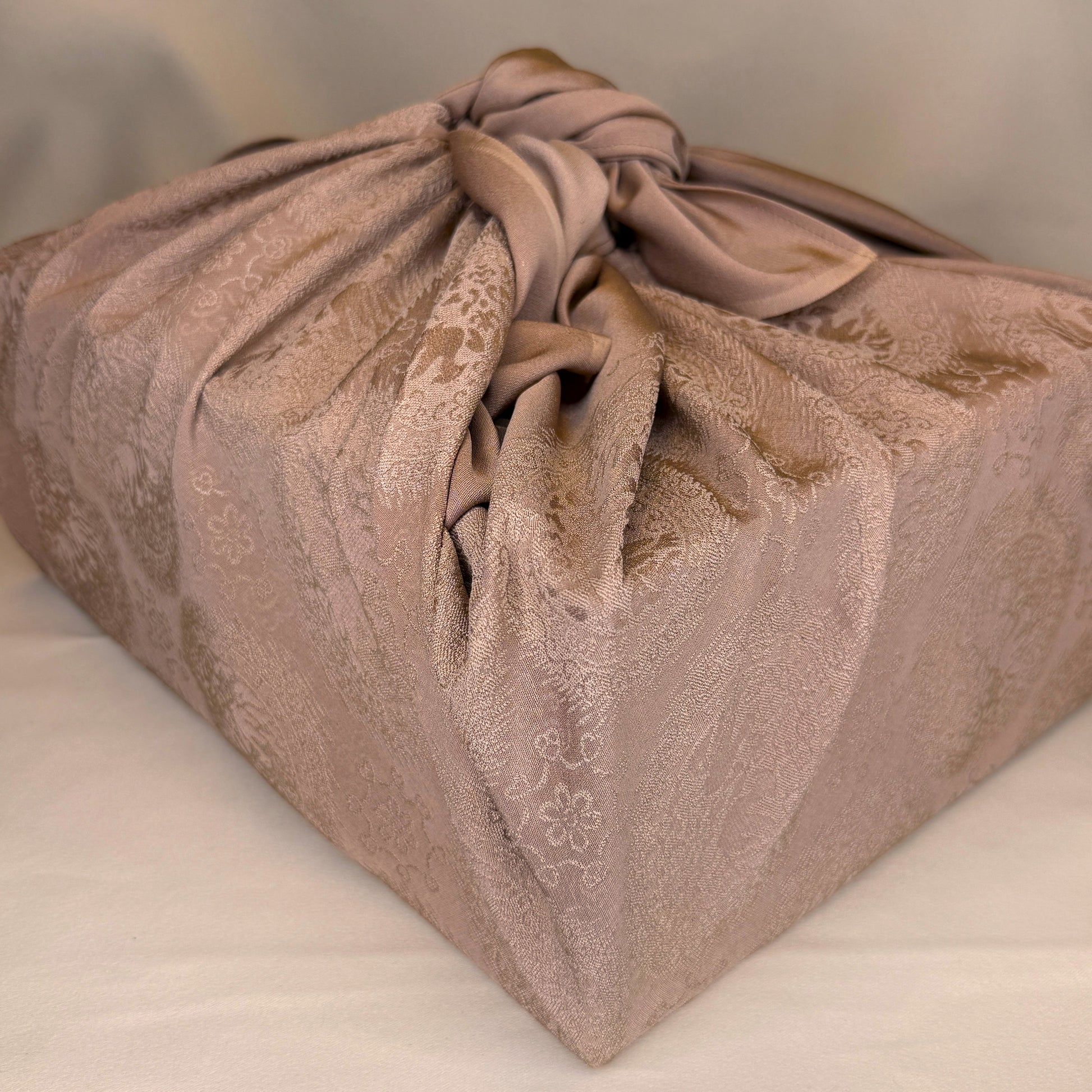 This vintage furoshiki brings a quiet sense of luxury with its warm taupe silk and shimmering jacquard design of an intricate grid of medallions, each woven with mirrored birds surrounded by delicate floral detailing, creating a subtle pattern that reveals more beauty the closer you look.