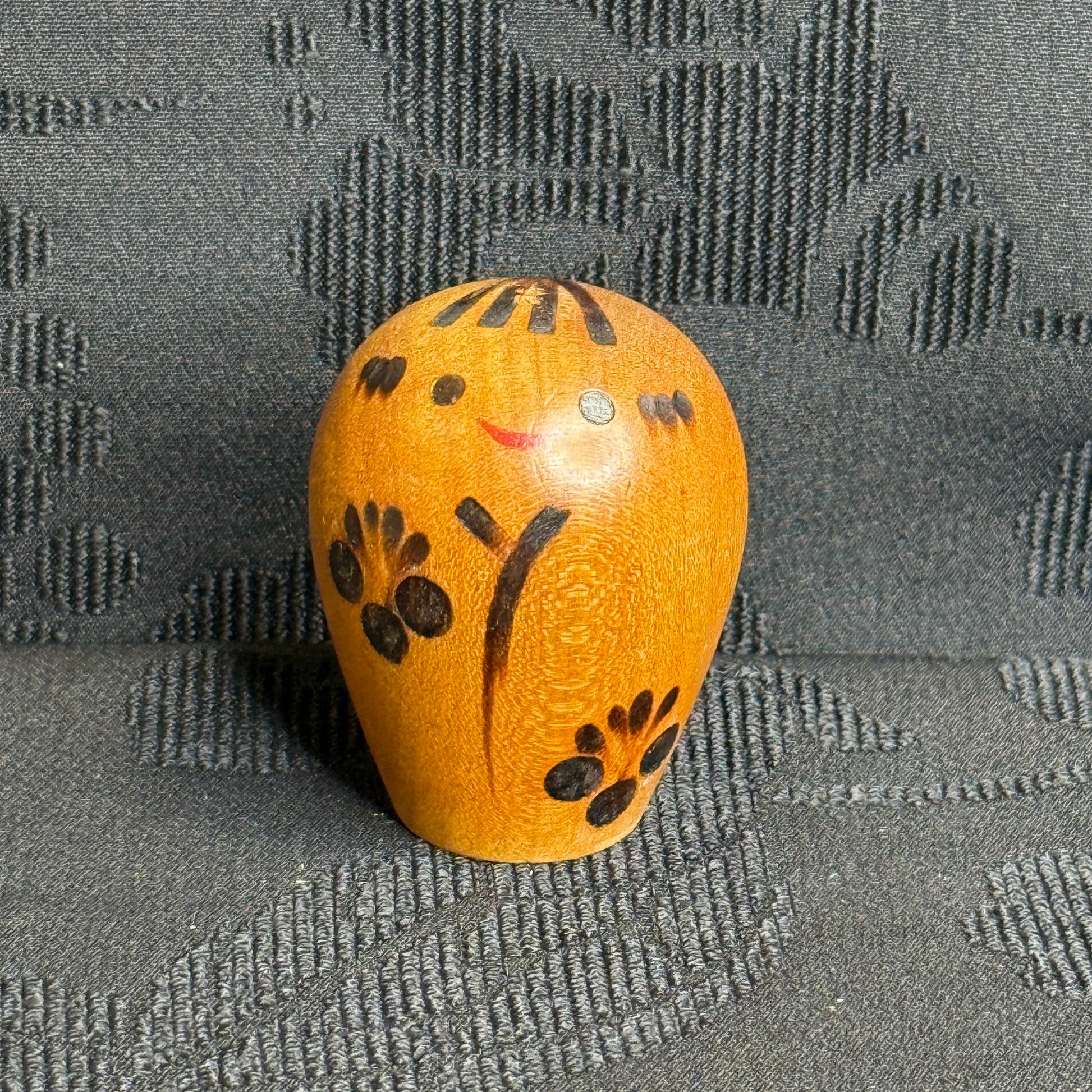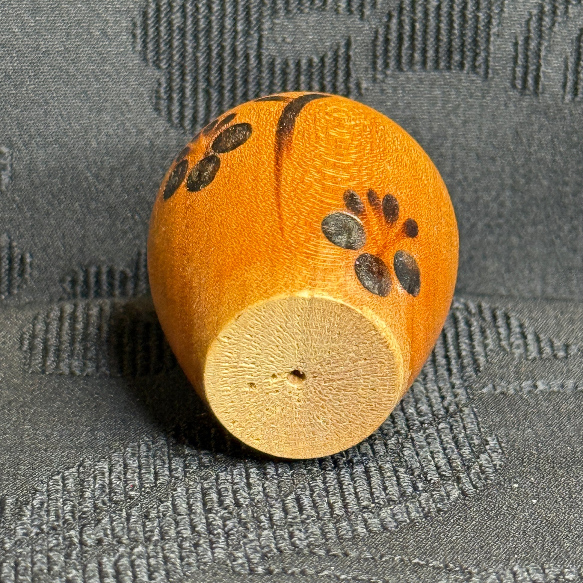 This cute little vintage kokeshi features a warm honey-toned almost egg-shaped body and a friendly, smiling face. Hand painted black florals and just a hint of a kimono collar add another layer of charm. The simple carving and smooth finish highlight the natural wood grain, while the bold brushwork adds a playful touch of folk-art personality.