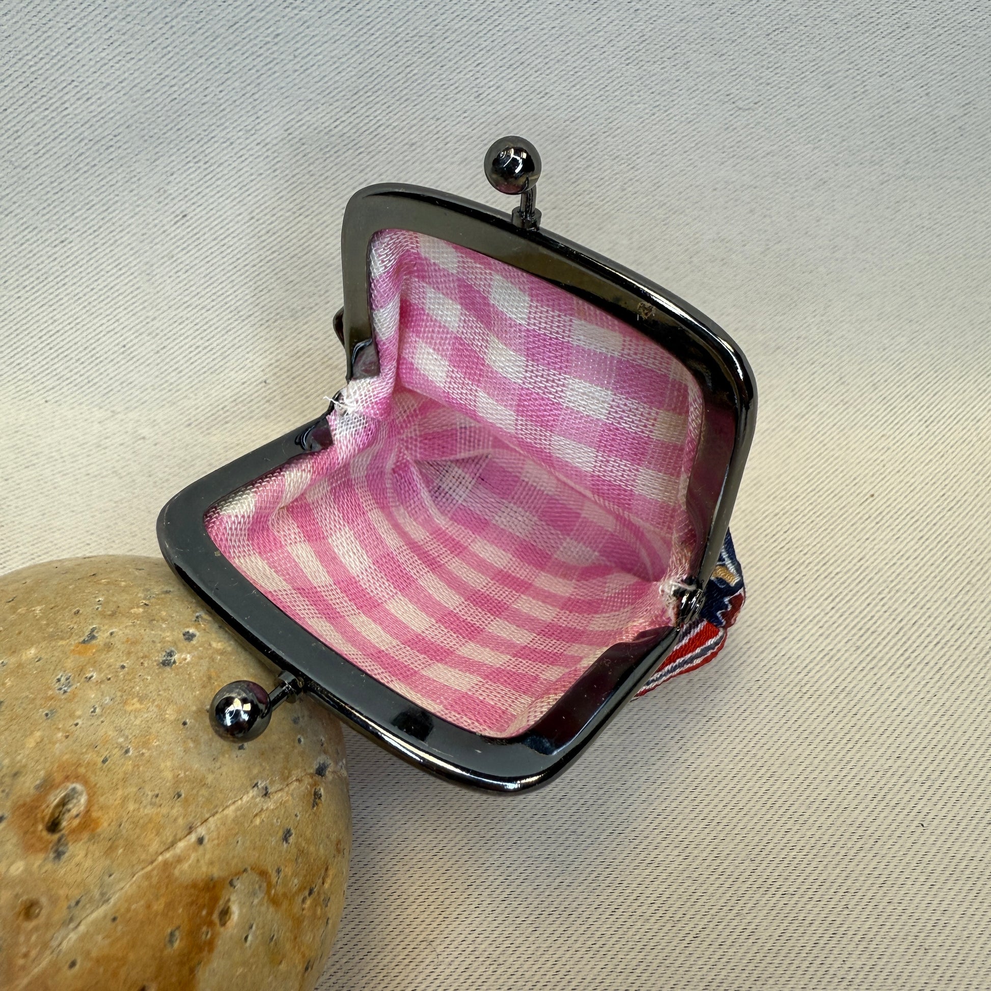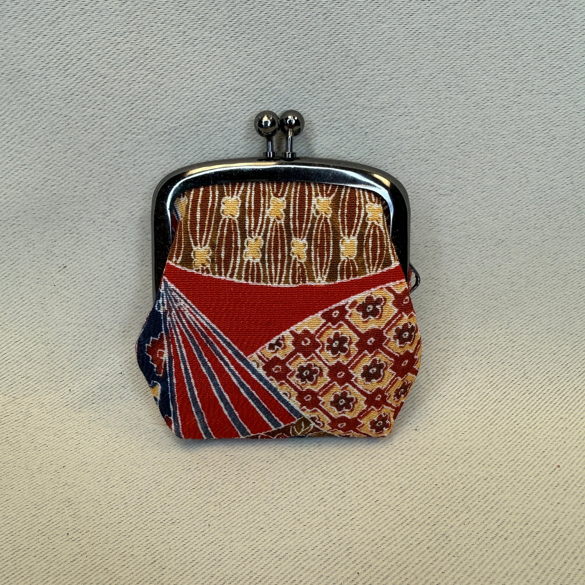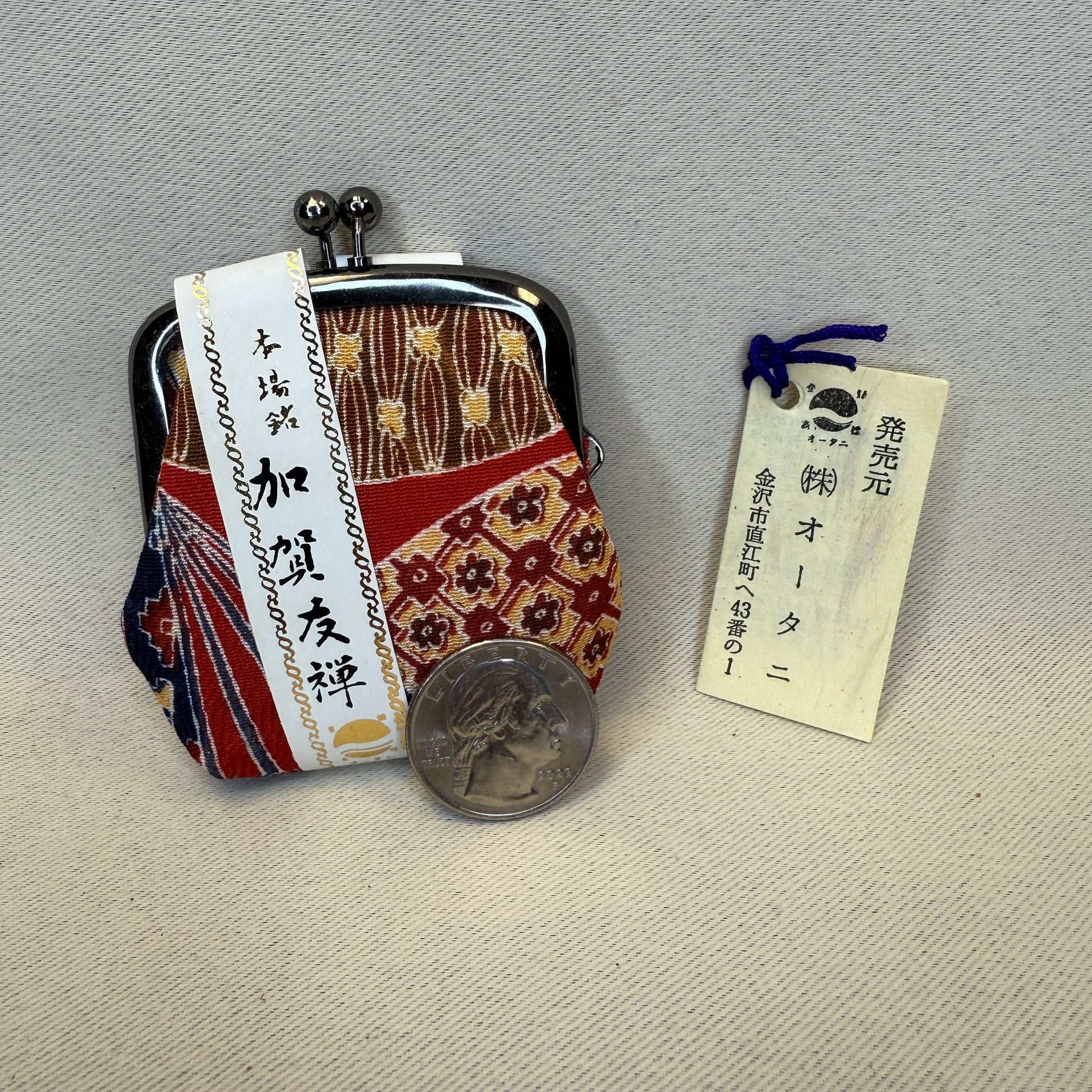 This vintage Japanese coin purse showcases the beauty of Kaga Yuzen dyeing from Kanazawa, Japan. The hand-dyed floral and geometric patterns in earthy reds, indigos, and browns reflect the region's centuries-old textile tradition, known for its graceful natural motifs. A cheerful pink gingham lining gives it a charming, nostalgic touch.