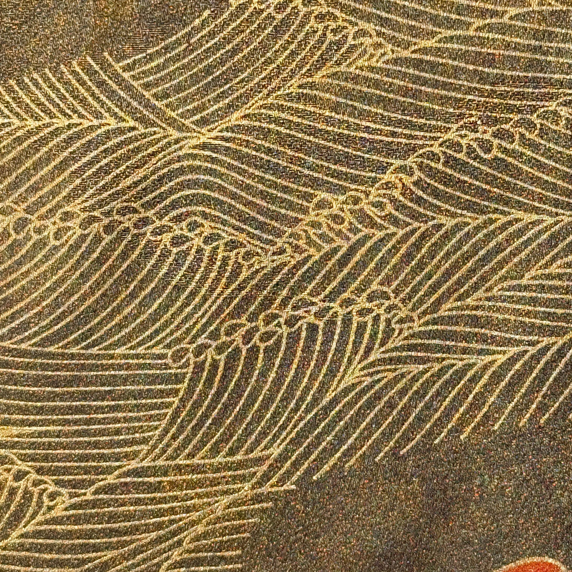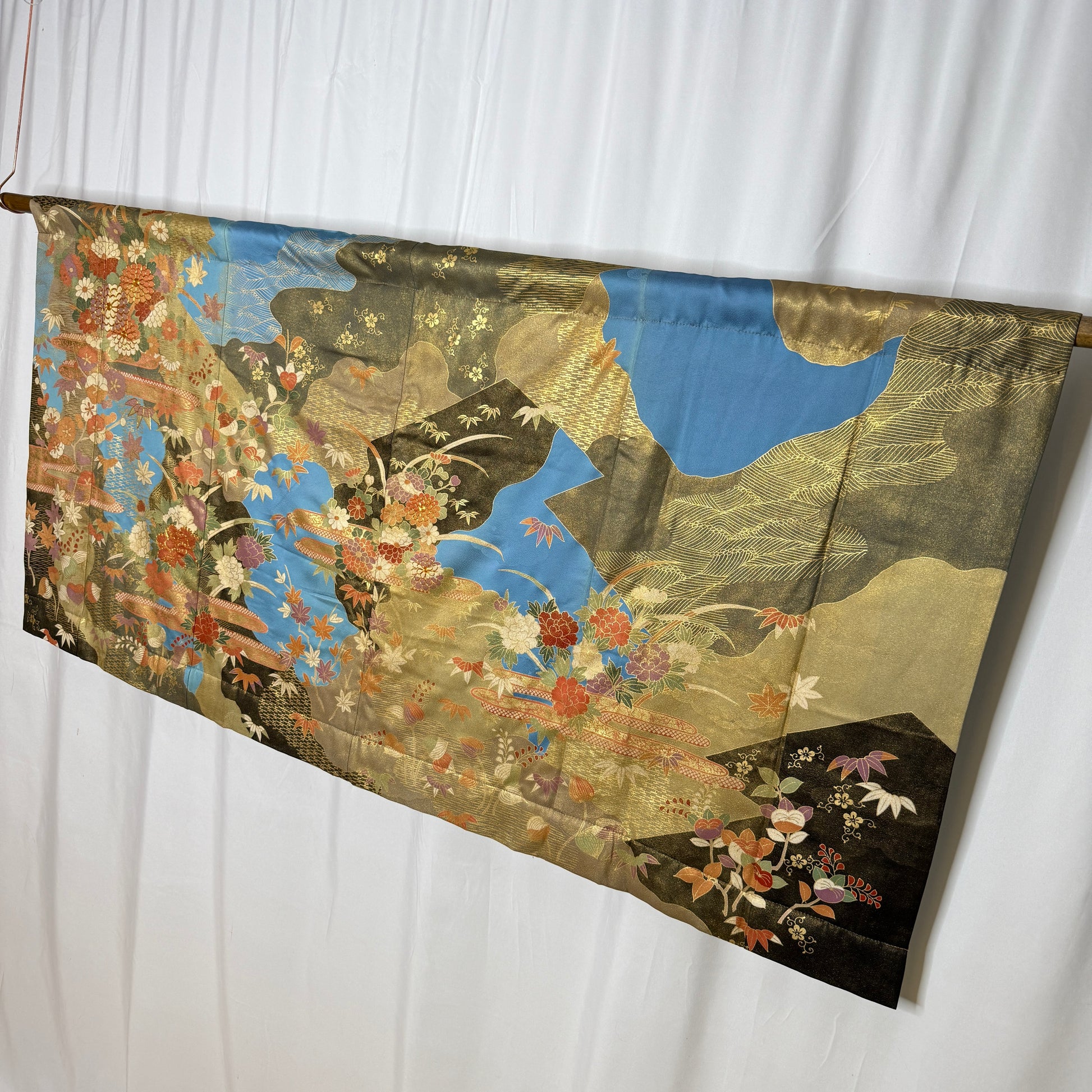 A sweeping landscape of gold and blue sets the stage for this richly detailed floral composition, full of movement and depth. This piece combines flowing gold forms that obscure the sky-blue background. An abundance of seasonal florals fill each shape: .chrysanthemums, maple leaves, waves, and mixed garden motifs are rendered in fine yuzen dye work, with delicate outlining and shading. Couching and gold leaf add texture and a soft reflective shimmer. The interplay of gold and blue evokes both elegance and contrast, often associated with prosperity and calm, while the dense florals symbolize abundance and the beauty of the changing seasons.