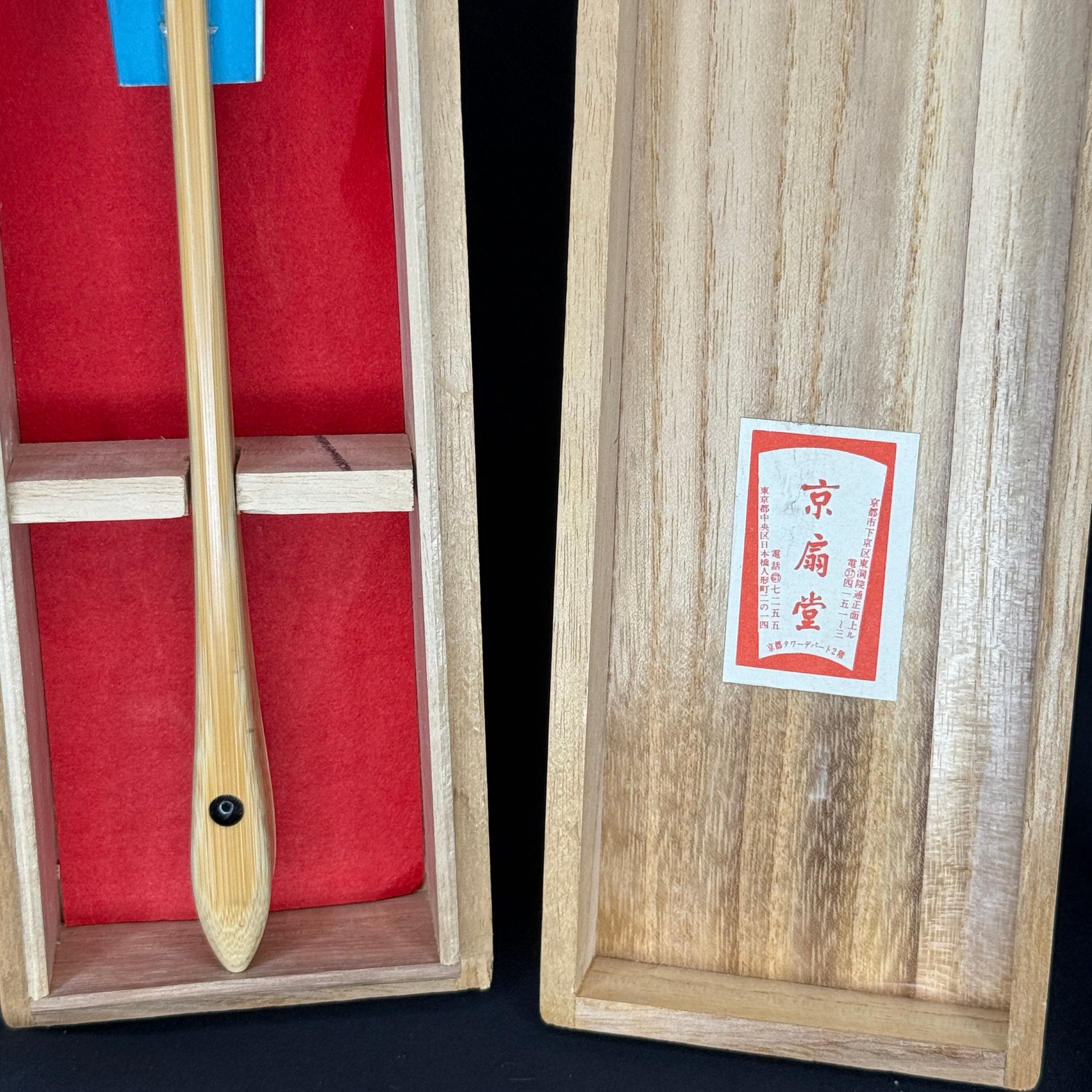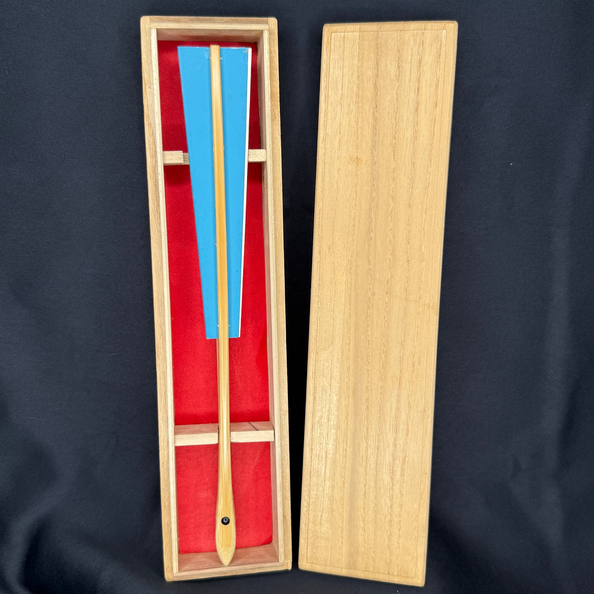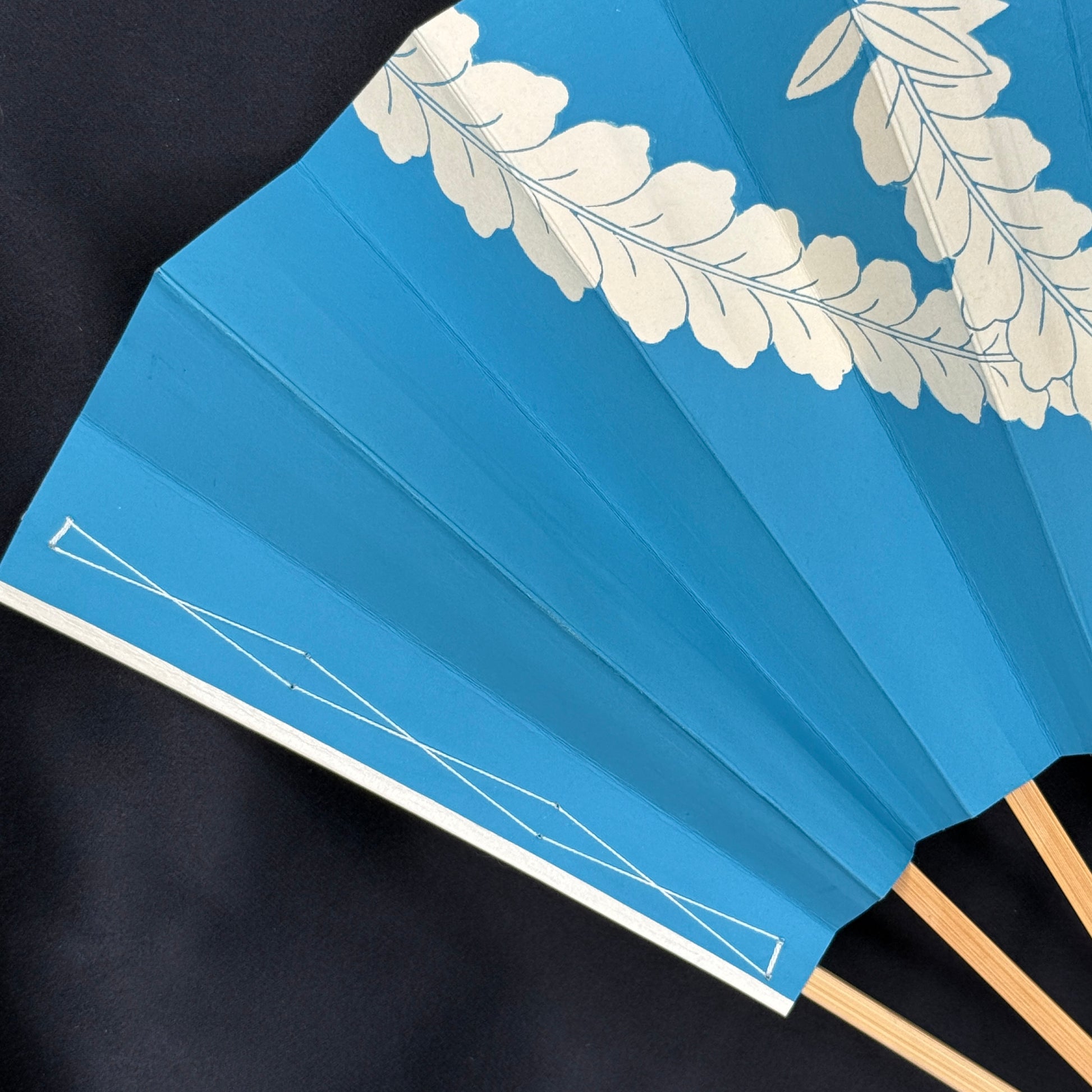 This Kyoto dance fan (Kyo-Sensu) captures the calm rhythm of nature with its graceful fern motif. Cream-colored fronds float gently across a field of pretty blue, their fine lines suggesting movement and lightness. The reverse side continues the design in opposite colors in beautiful harmony - blue ferns and white background. Crafted with smooth bamboo ribs and crisp folds, it offers both tactile and visual elegance. Presented in its original wooden box lined with red and labeled by Kyo-Sendo, one of Kyoto's esteemed fan houses.