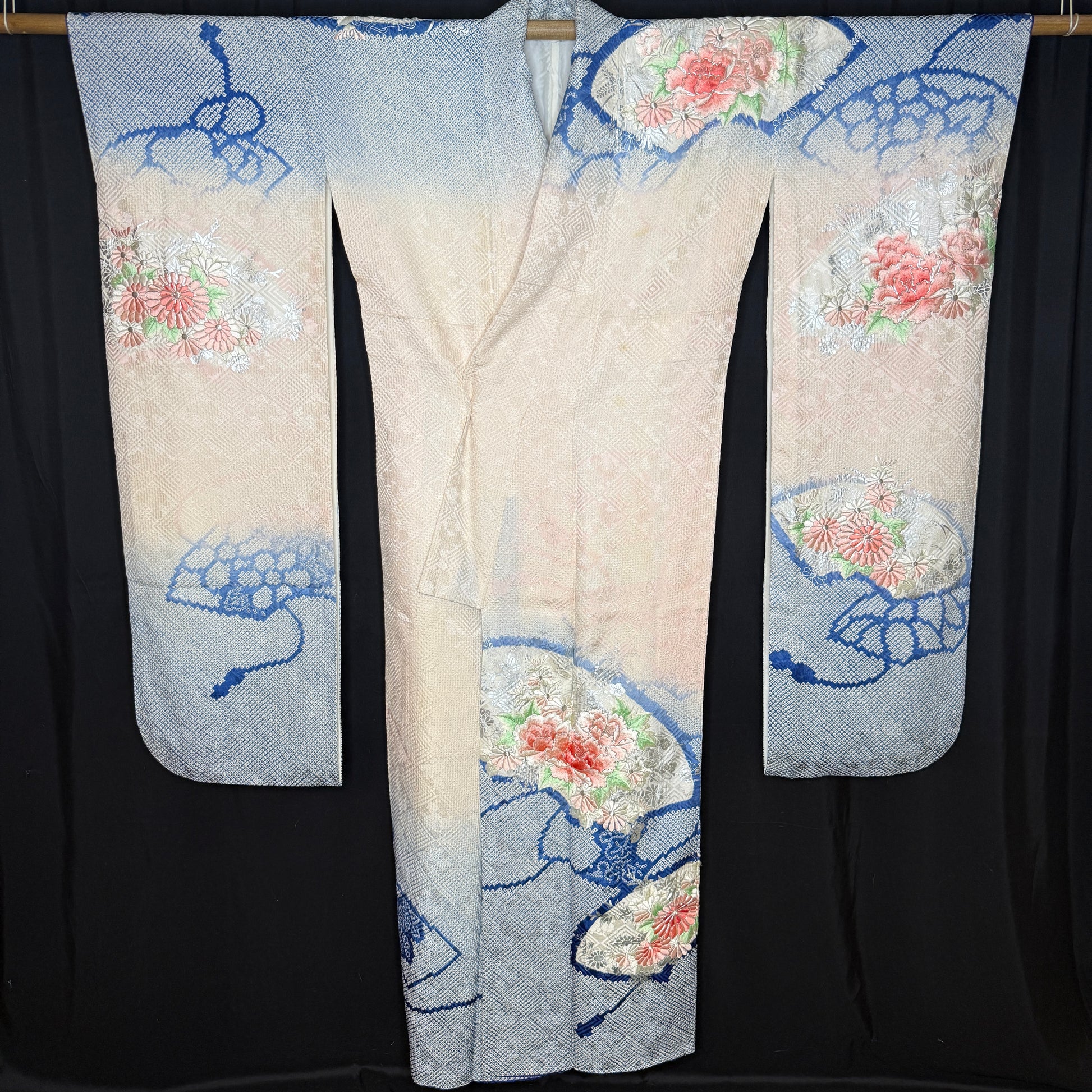 Softly elegant and rich in detail, this vintage furisode kimono features a cream-to-powder blue background with flowing fan shapes drifting like petals on water. Each fan is filled with finely embroidered peonies, mums, and seasonal florals, their forms accented with delicate couching and silver leaf that add a luminous shimmer. The surface reveals intricate kanoko (fawn spot) shibori alongside a nested diamond and floral jacquard weave, creating depth that emerges beautifully as the light moves. Gentle gradation and balanced placement give the composition a calm, lyrical rhythm.