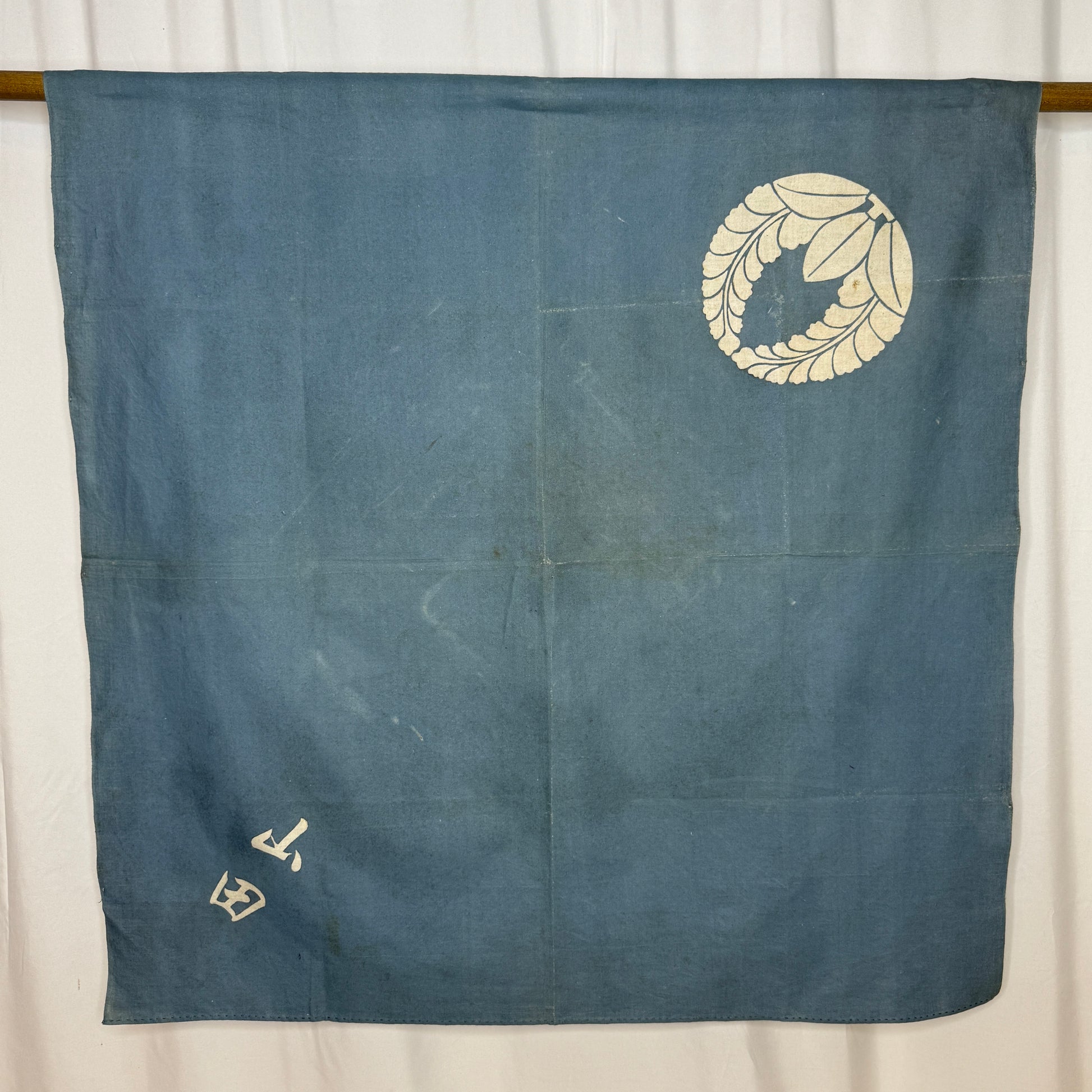 Soft and serene, this vintage furoshiki features a gently faded blue tone paired with a beautiful cream wisteria crest in one corner. The wisteria crest symbolizes elegance, longevity, and good fortune, making it a meaningful wrap for gifting. The opposite corner includes stylized kanji that translates to Yamada, likely the family name of the original owner.