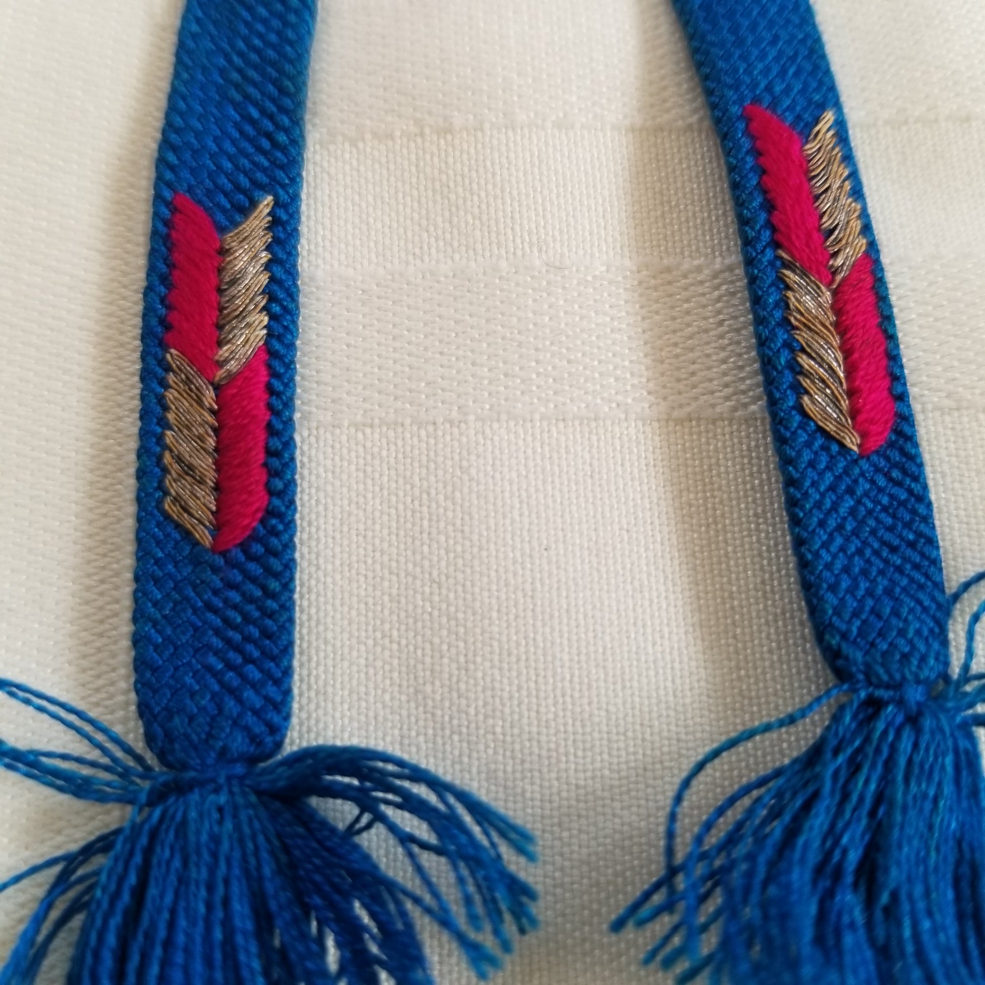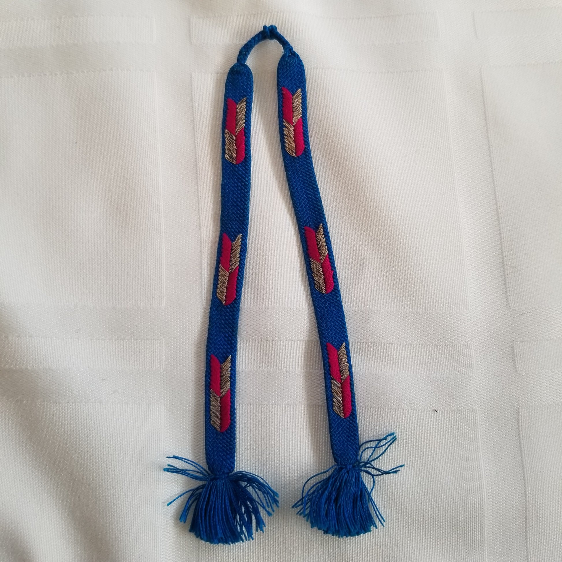 This listing is for a pair of vintage himo ties in a deep, rich blue with two arrow fletching (feathers) elements in pink and silver on the front only.