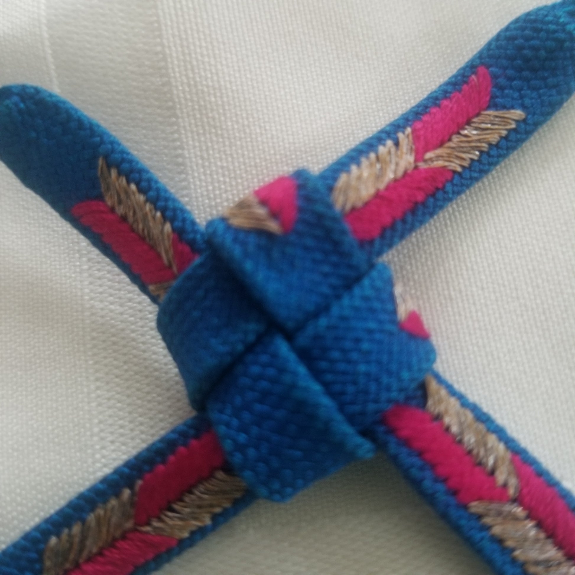 Haori himo are the braided or woven cords that tie together at the front of a traditional haori jacket, hooked into the little loops on either side of the haori front collar. We have pre-tied the himo in a decorative knot and will add a contemporary clasp for easy attachment.