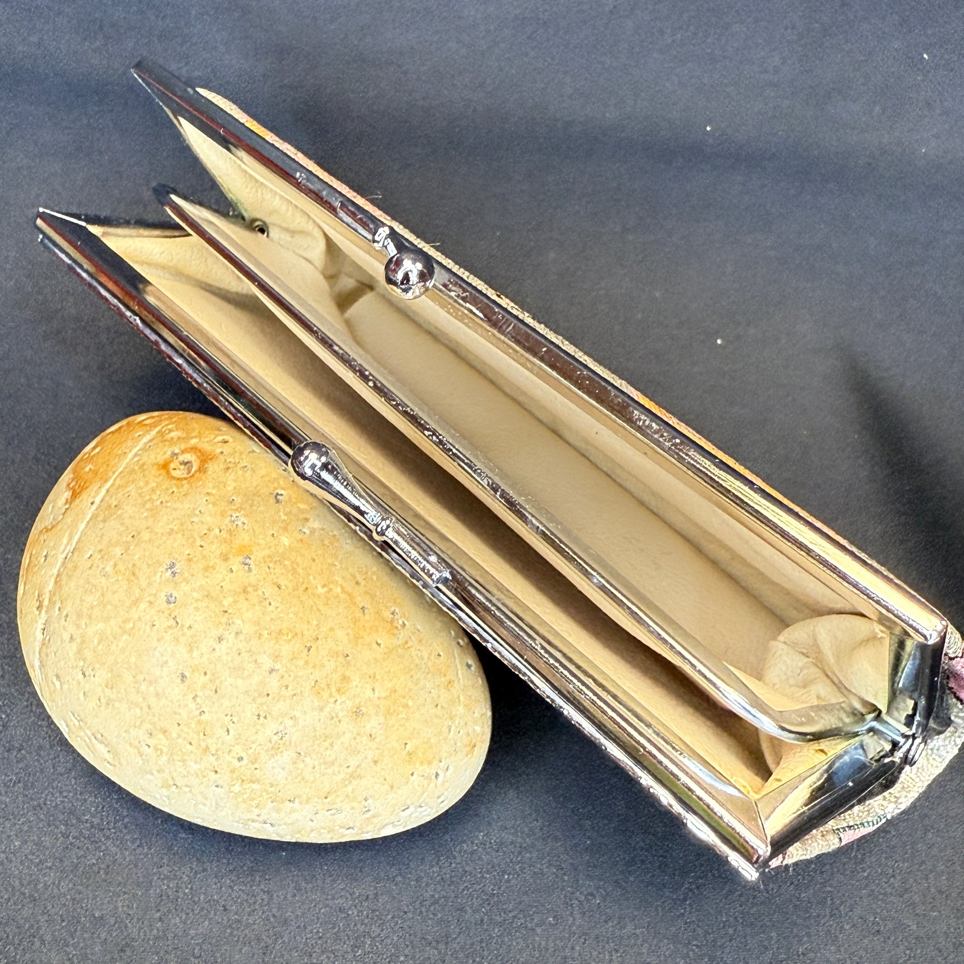 Framed in polished silver-tone metal with a smooth clasp, it opens to reveal a cream interior with two compartments.