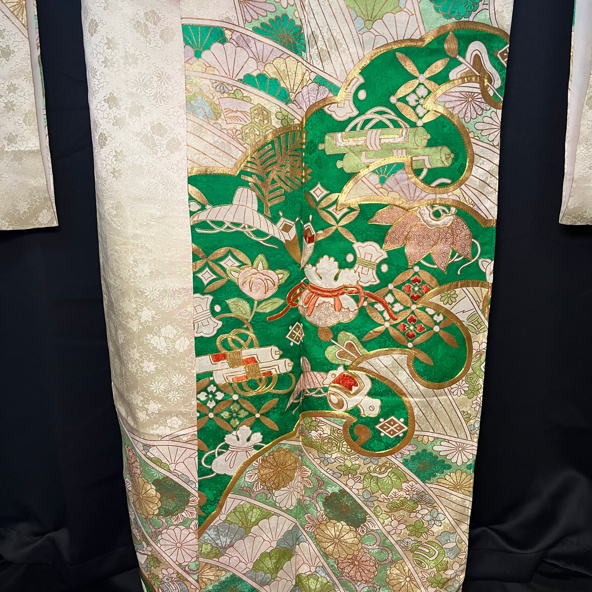 This furisode is a creamy, satiny silk with a large basketweave jacquard behind the festive green garden motif. Hundreds of long thin blades of grass in varying shades of green provide a springtime background for the peonies, camellia and plum blossoms that poke their heads out from the foliage.
