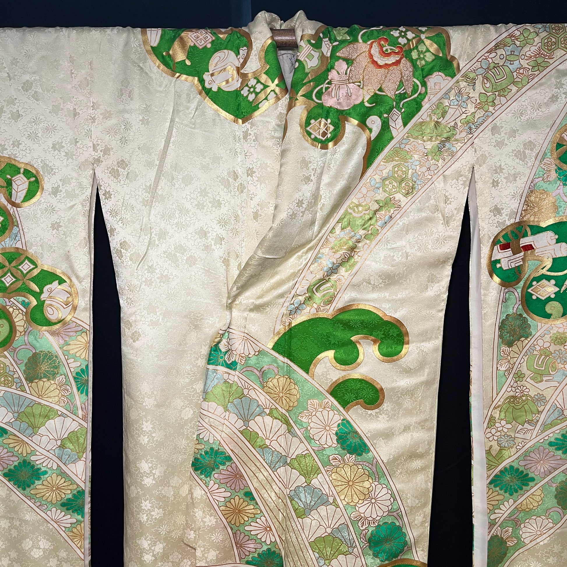 Featured flowers are outlined in gold couching at the front panel and left shoulder. The white area sweeps around the waist to provide a quieter background for a formal obi - but this would make a striking wall display!