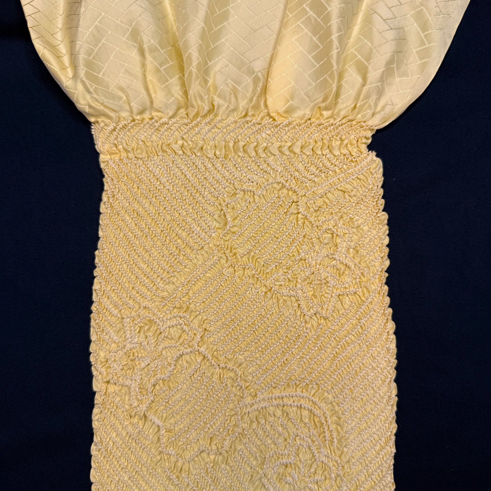 Bright as a beam of afternoon sun, this obiage and obijime set radiates warmth and celebration. The obiage features dimensional floral shibori layered over a subtle herringbone jacquard. The coordinating obijime is especially striking, woven gold on one side and silver on the other, allowing you to subtly shift the tone of your outfit depending on how its tied. Pairs beautifully with formal and semi formal kimono, bringing light, polish and a touch of festive elegance to the overall look.