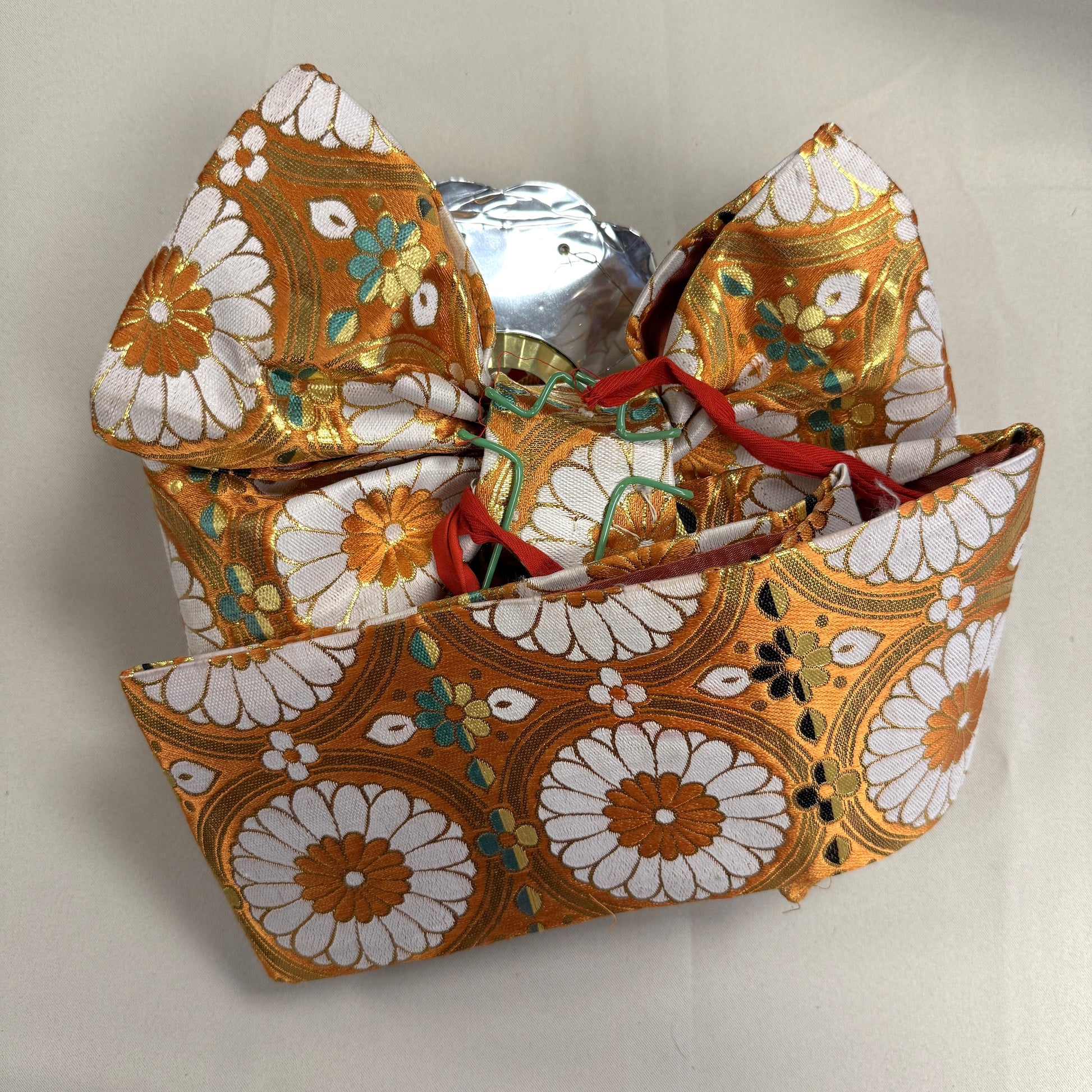This ornate tsuke obi dazzles with its radiant gold brocade, patterned with bold white mums accented in orange, green, and black. At its center, the bow is adorned with delicate metal embellishments: a shiny fan, tassels, a bell, and a layered kanzashi-style blossom that adds an extra sense of festivity and artistry. The metallic details catch the light beautifully, making this obi an eye-catching statement piece for celebratory wear.