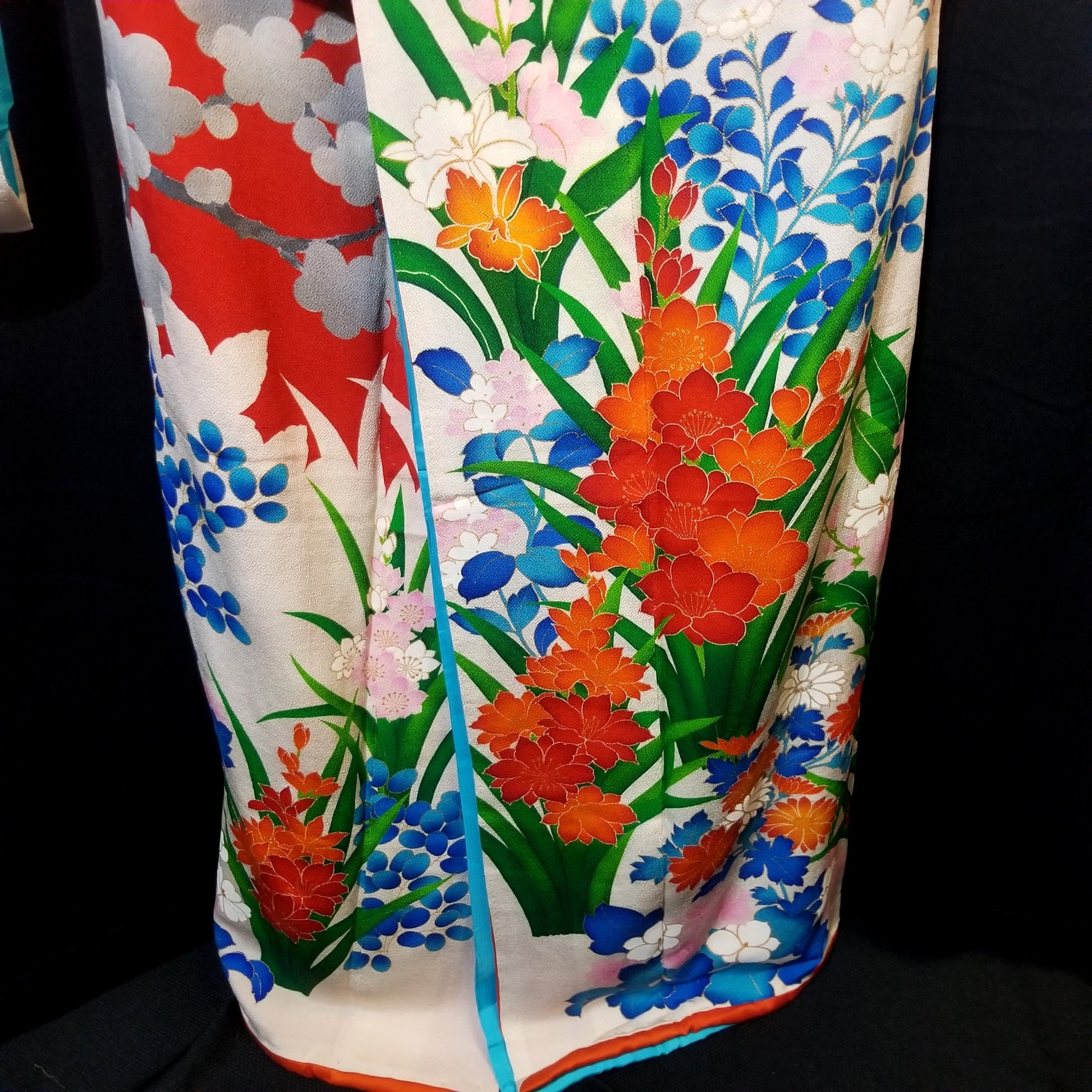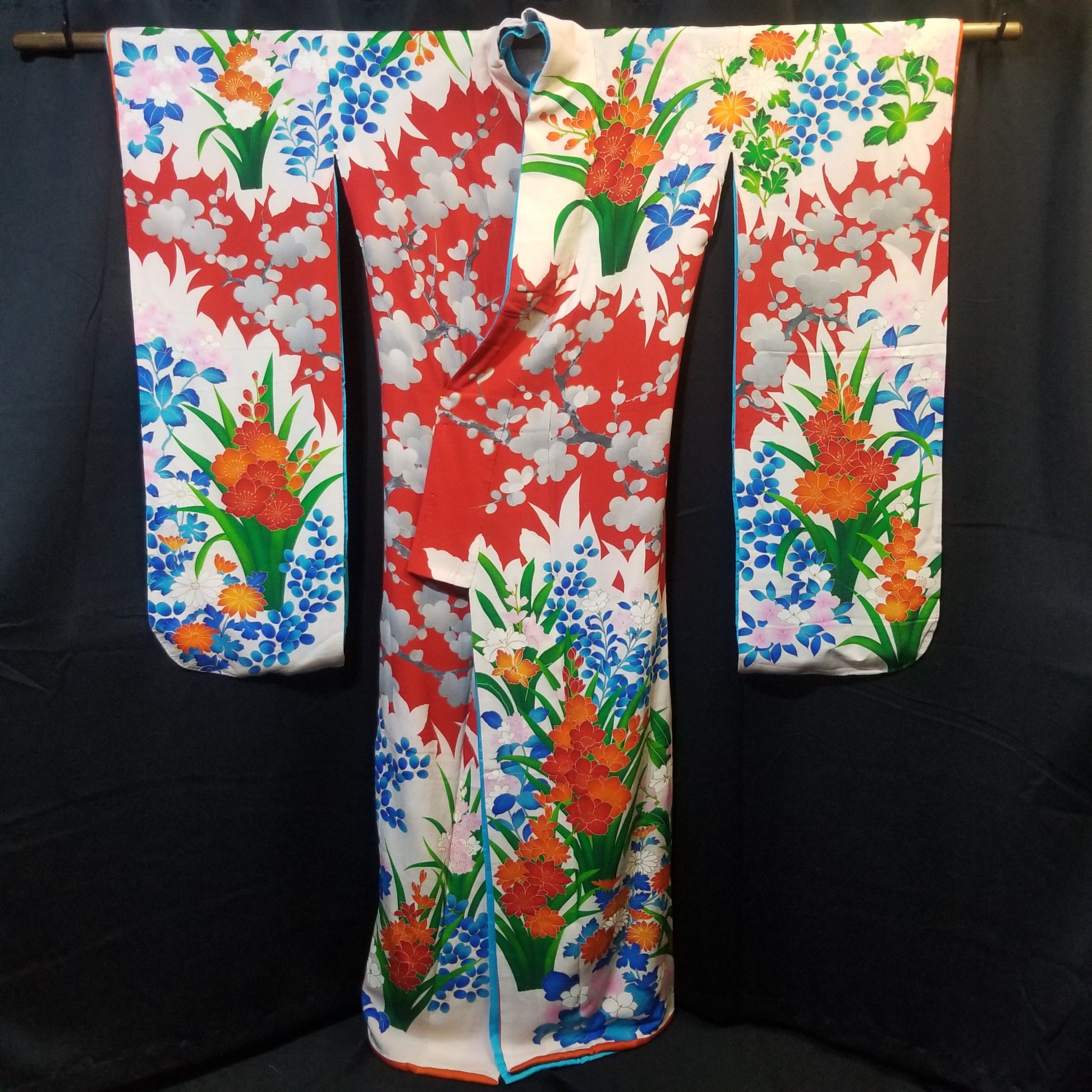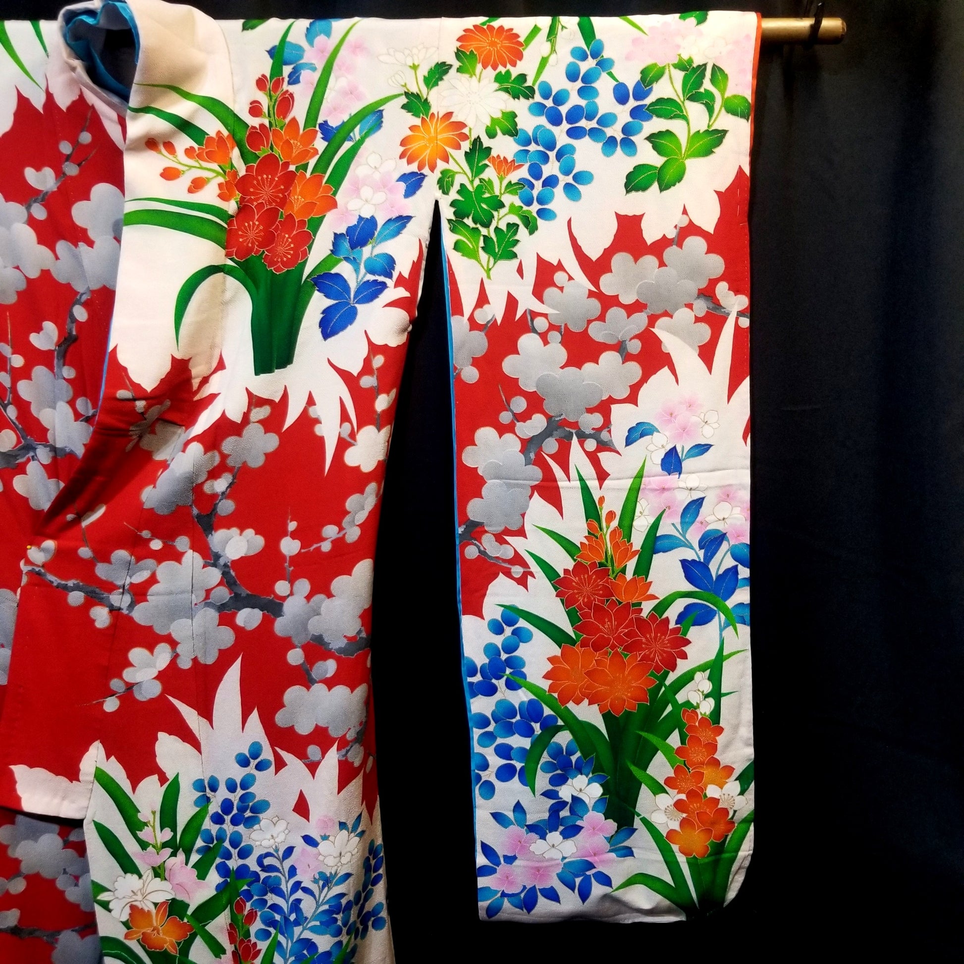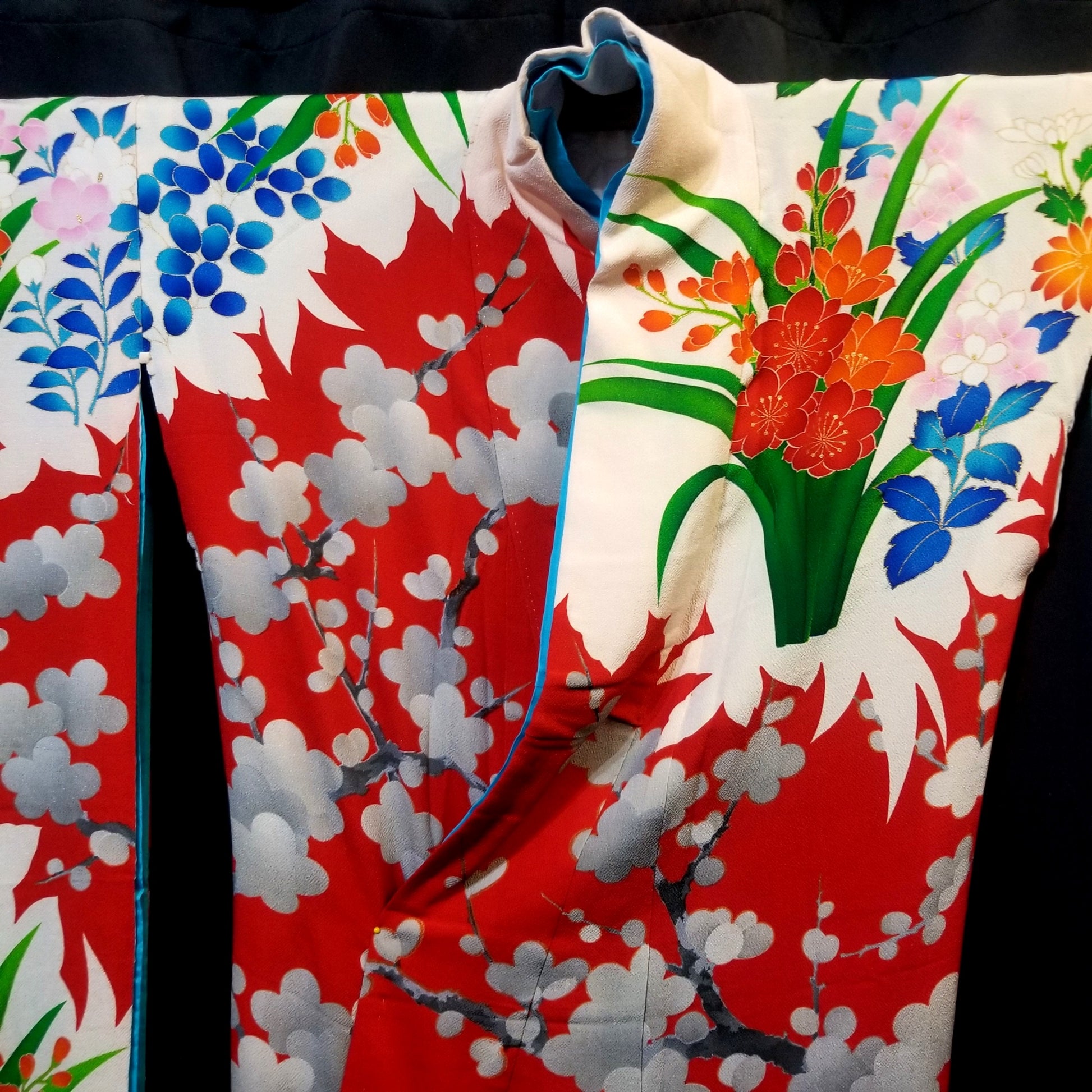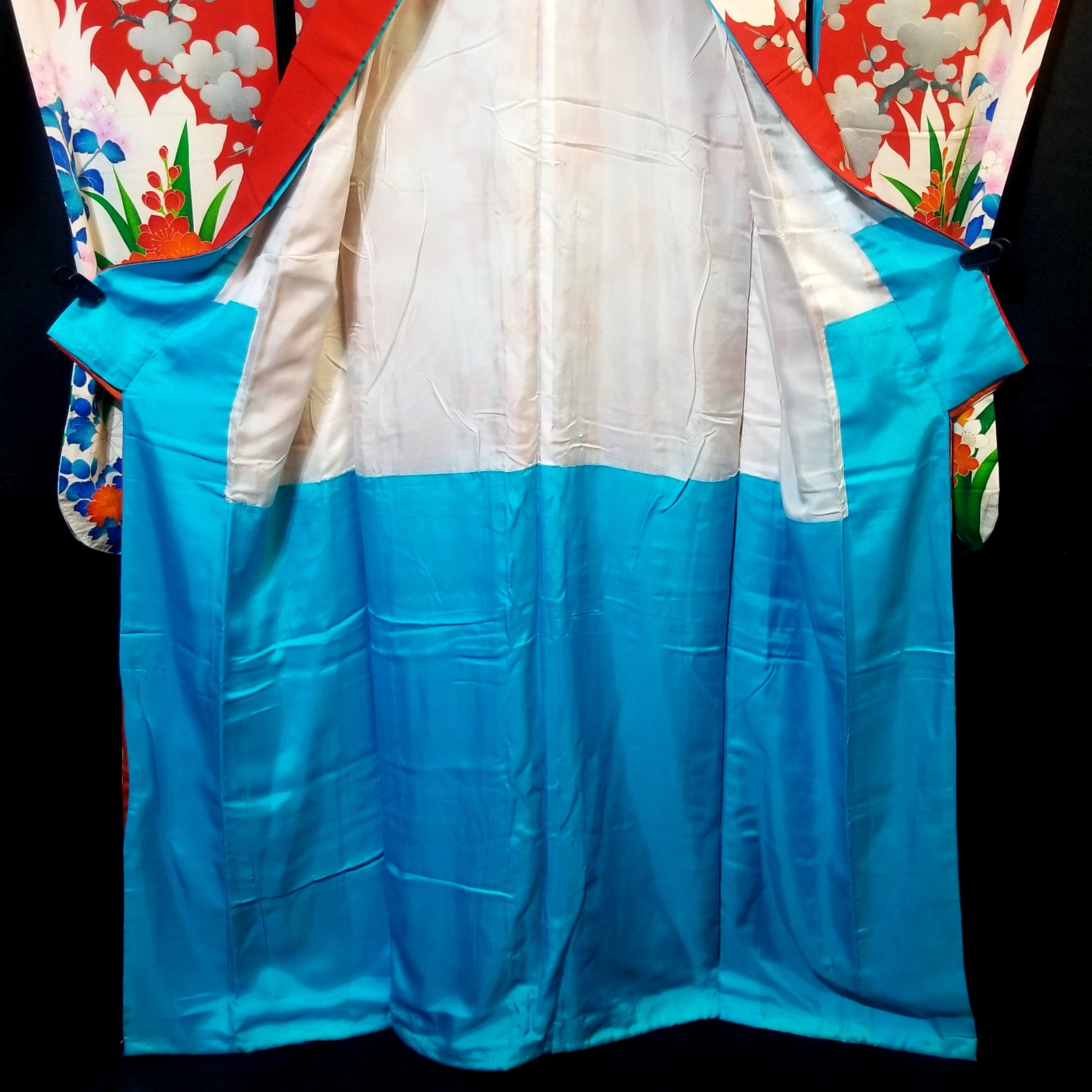 This kakeshita is simply breath-taking. We love the true-red and turquoise color combination. The mid-section is an abstract red shape filled with gray plum blossoms in silhouette. The hem and shoulders are white with bright orange flowers with deep green or blue shaded leaves. More flowers in blue, white and orange, and a soft pink shading behind them create a collage that keeps you looking. The turquoise lining on the inside as well as the sleeve trim makes such a great combination.