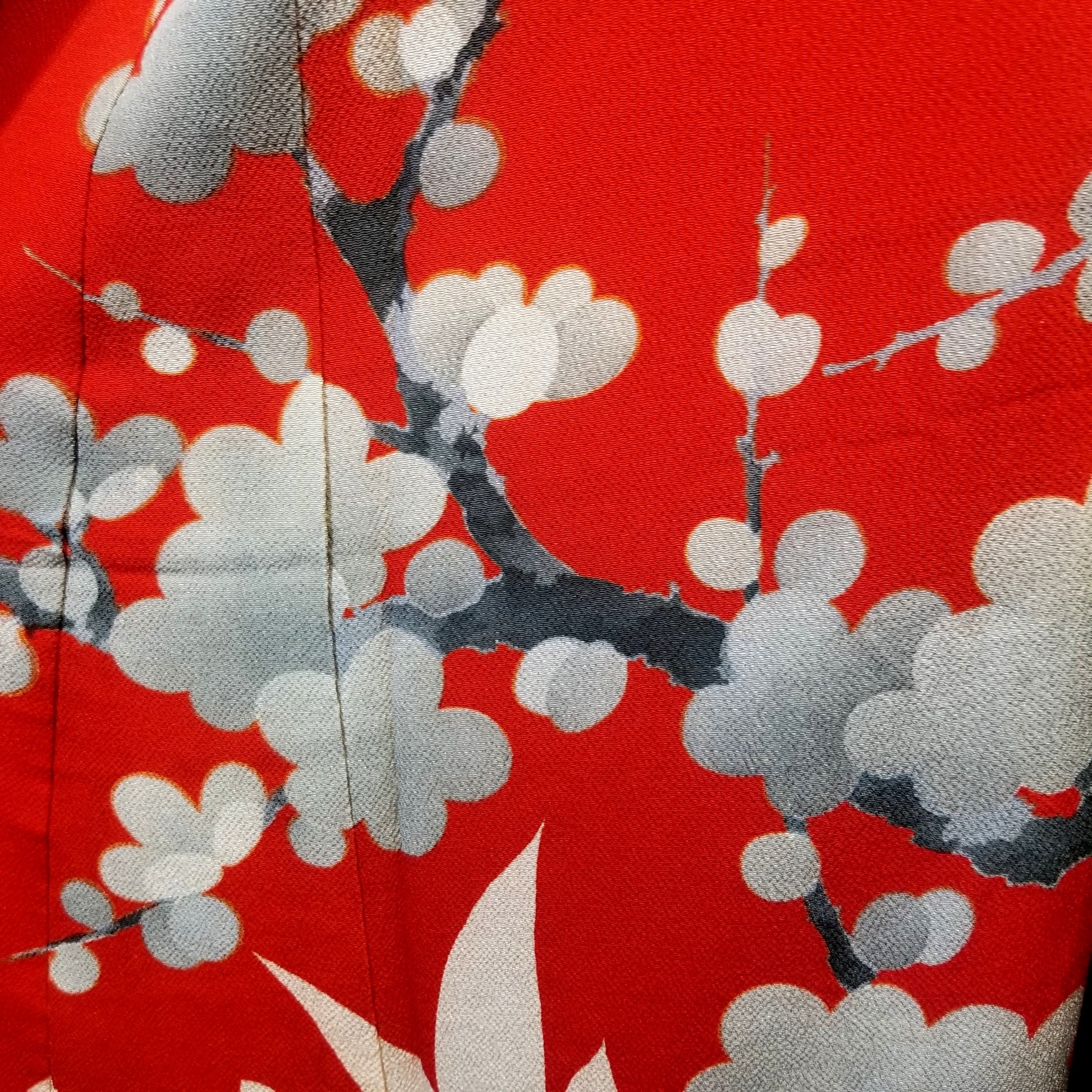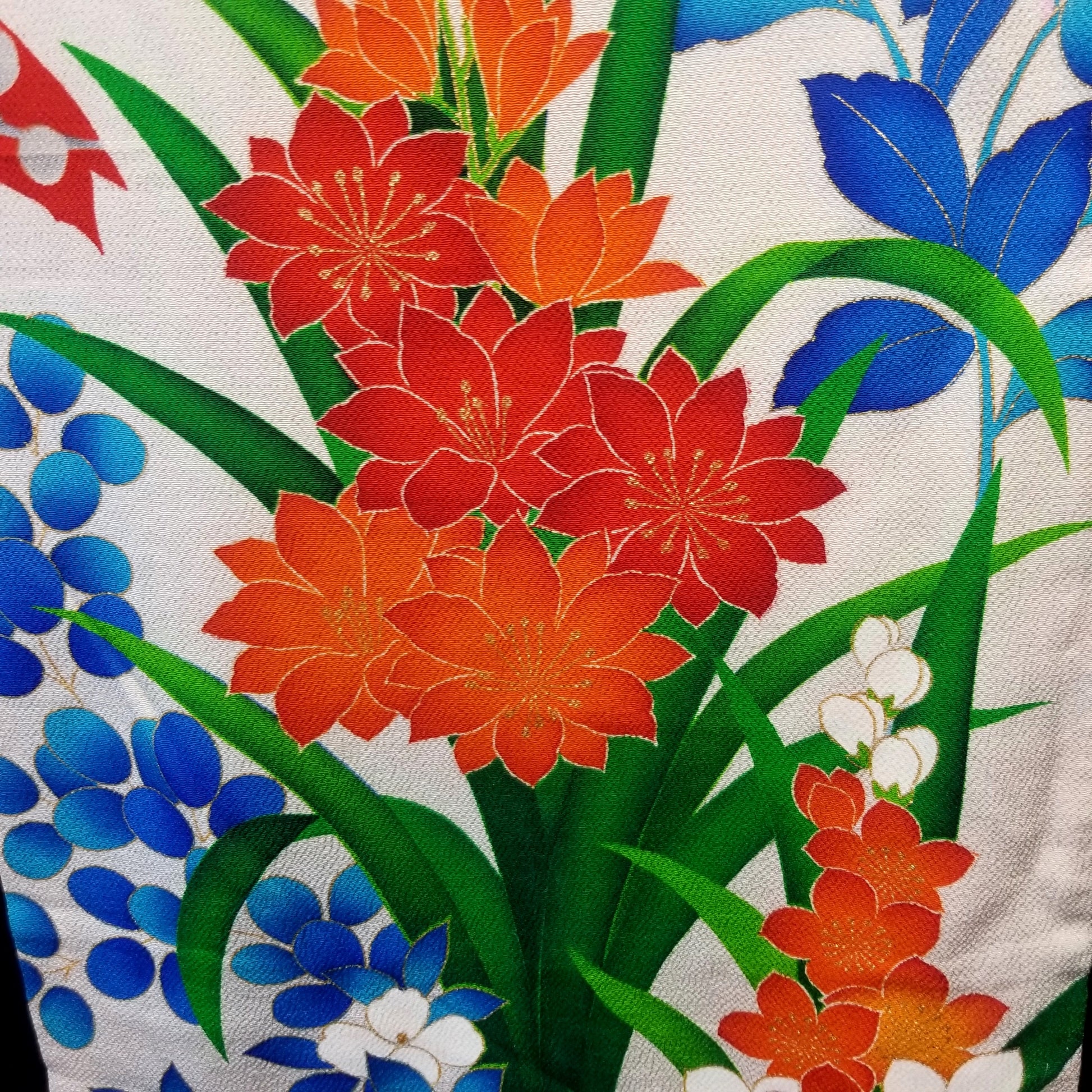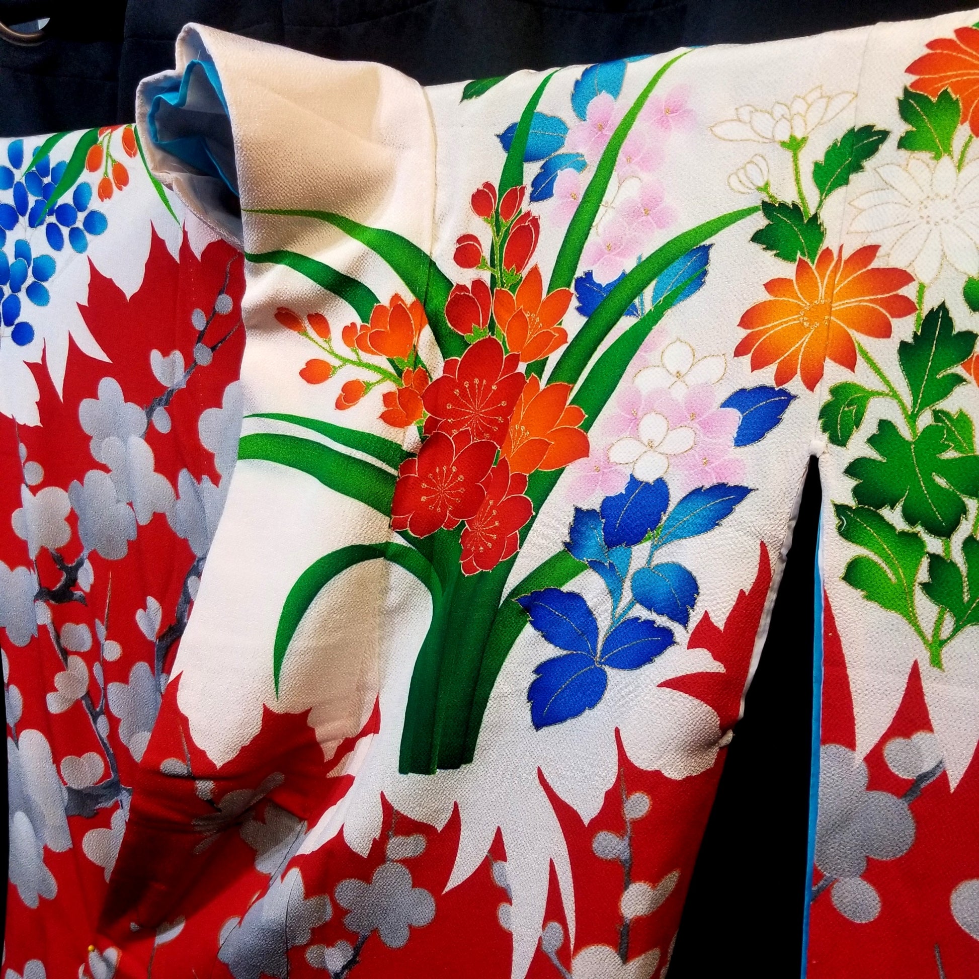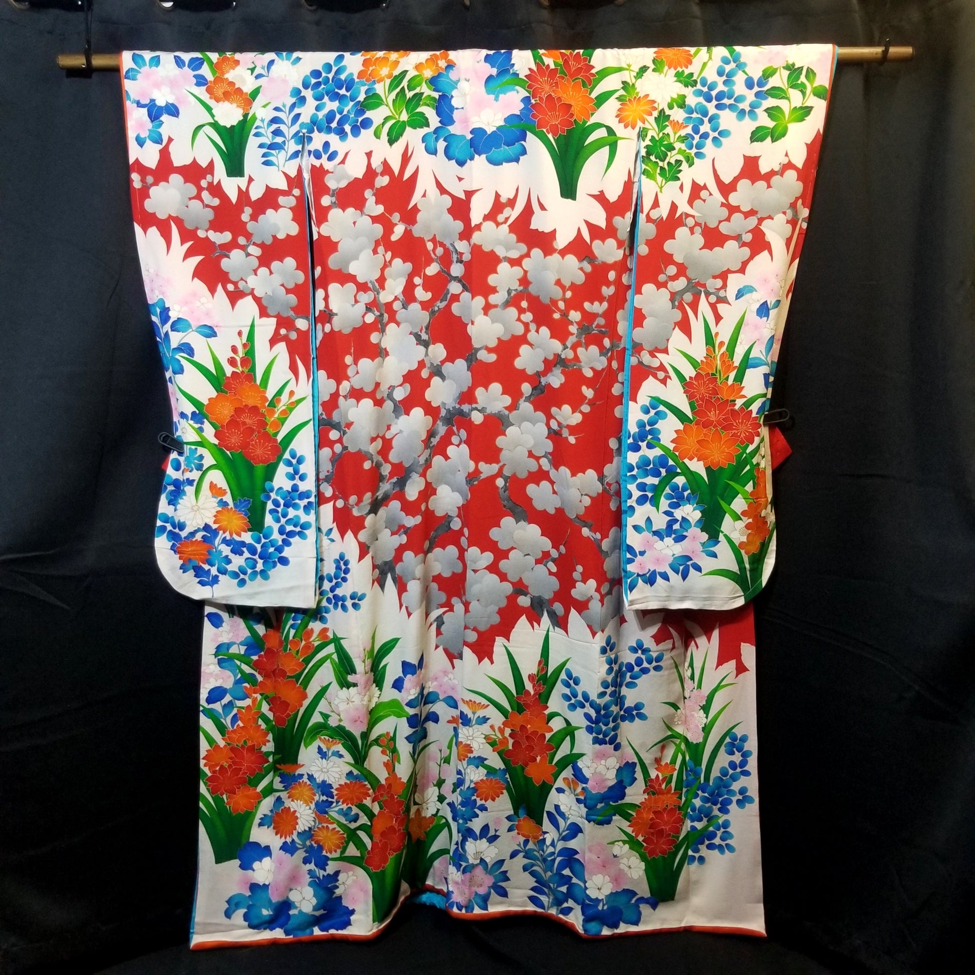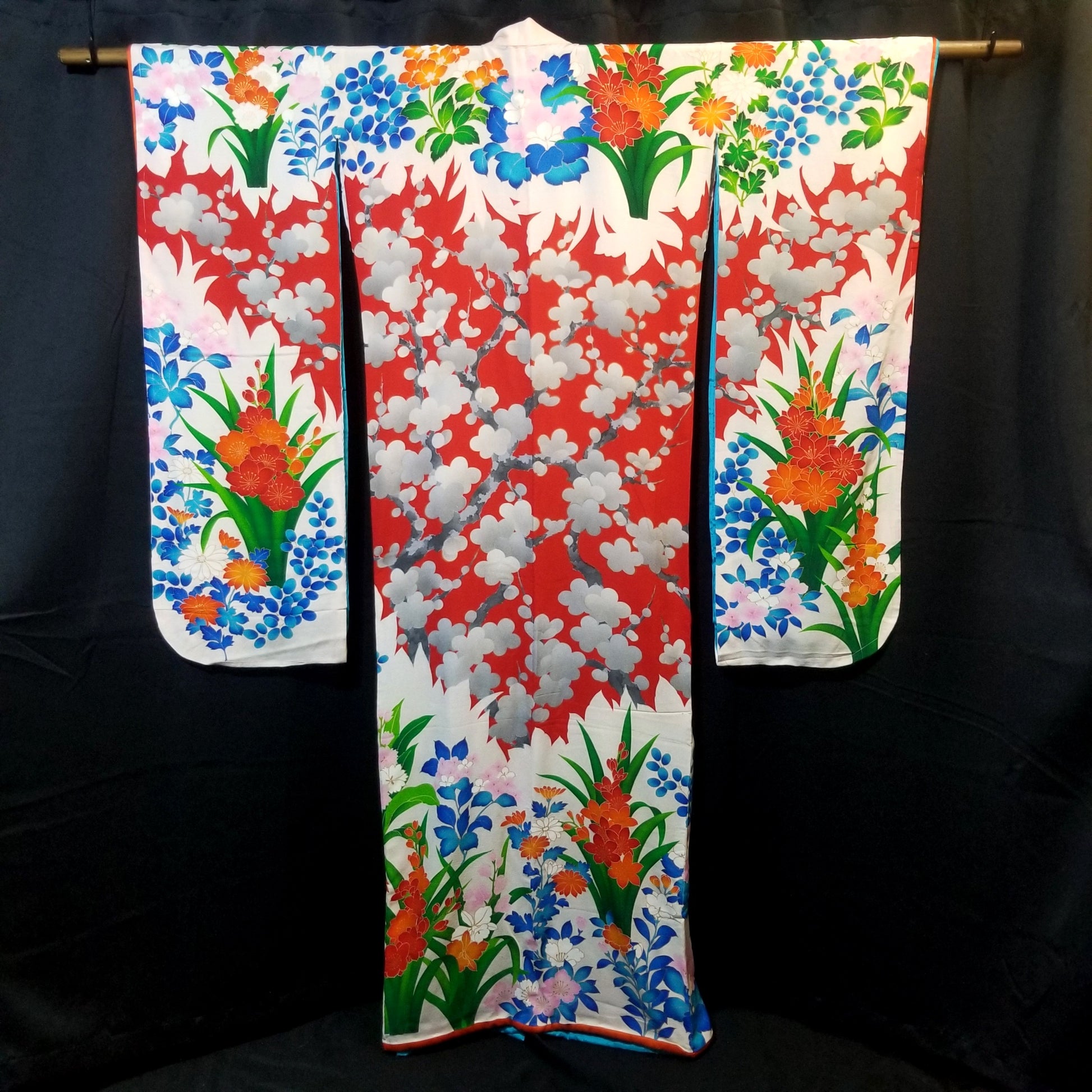 This kakeshita is simply breath-taking. We love the true-red and turquoise color combination. The mid-section is an abstract red shape filled with gray plum blossoms in silhouette. The hem and shoulders are white with bright orange flowers with deep green or blue shaded leaves. More flowers in blue, white and orange, and a soft pink shading behind them create a collage that keeps you looking. The turquoise lining on the inside as well as the sleeve trim makes such a great combination.