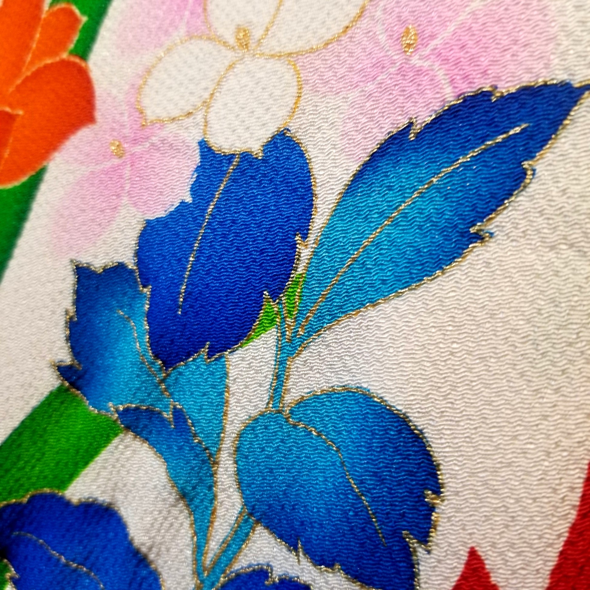 The pattern was created with the yuzen technique - a complicated stencil and brush-painted process that calls on dozens of skilled artisans to create. Gold leaf edging to some of the elements adds even more interest and value.