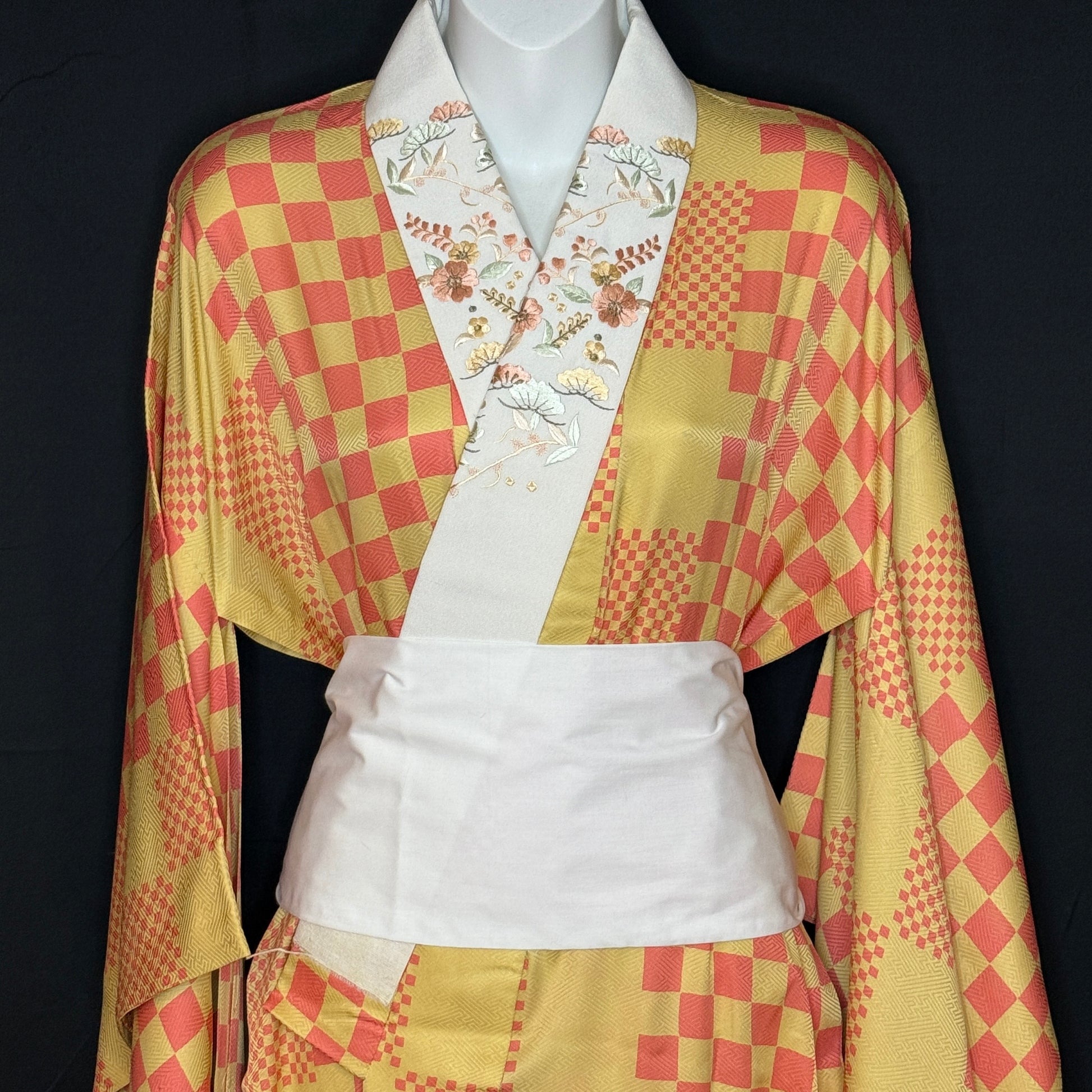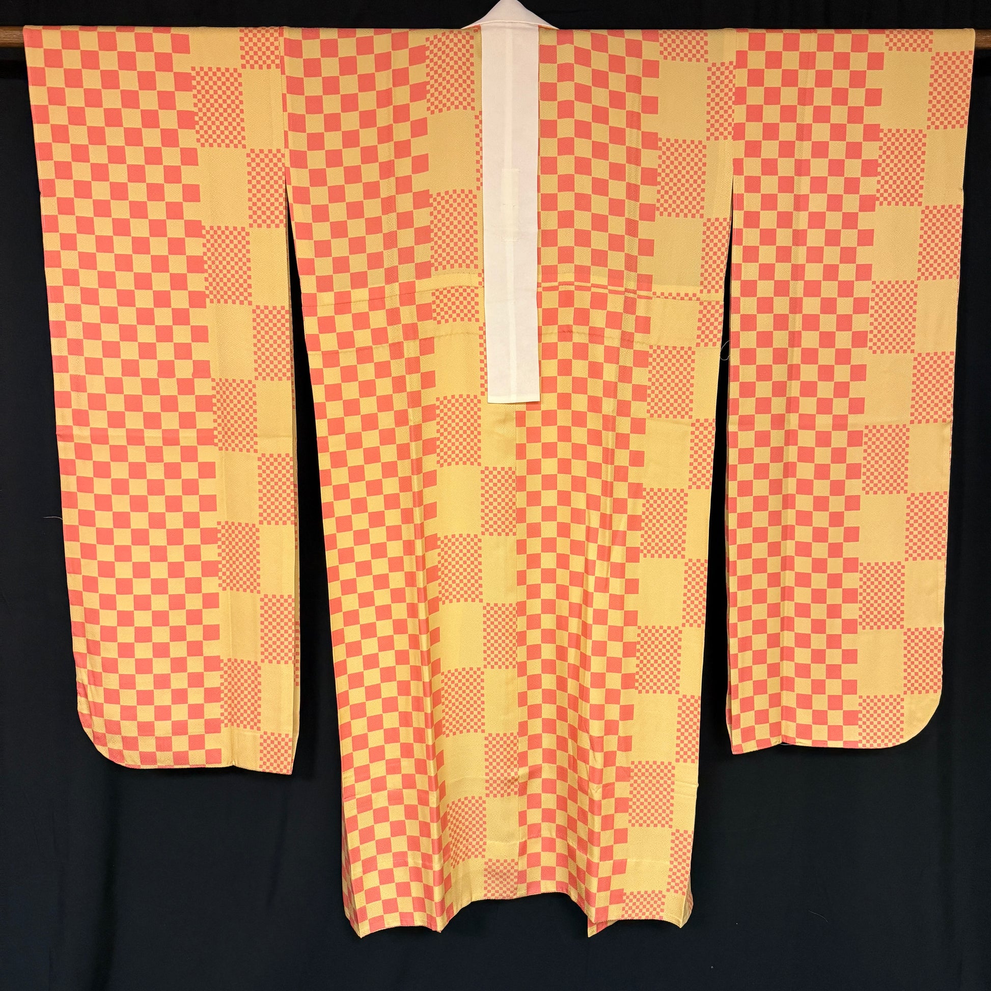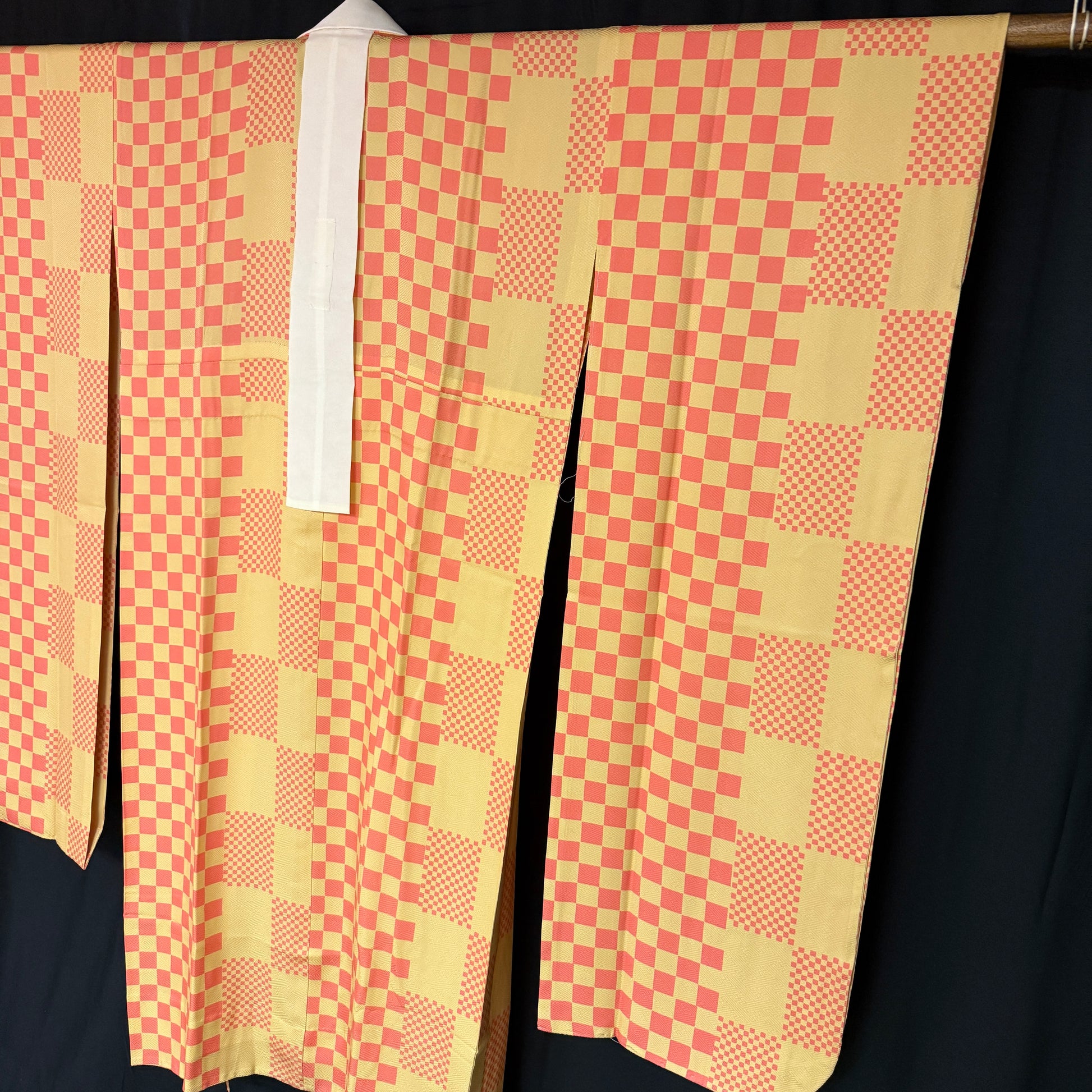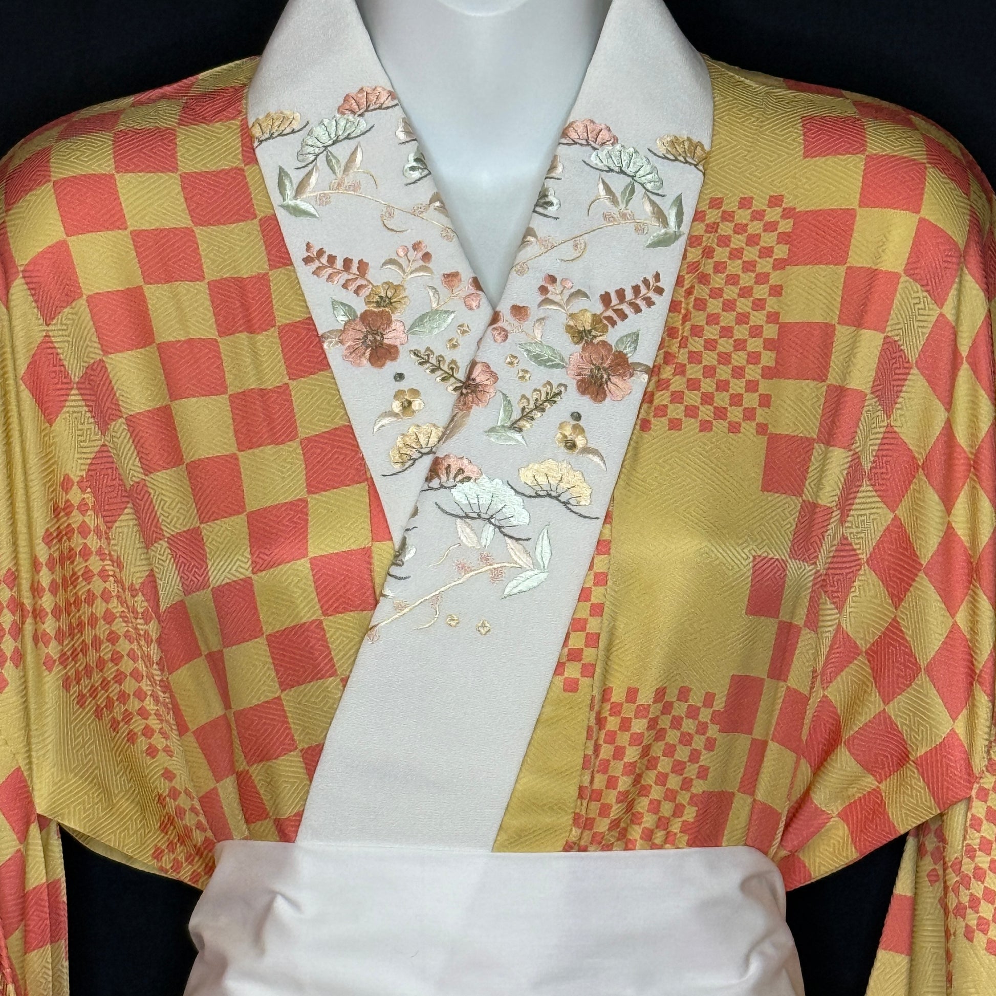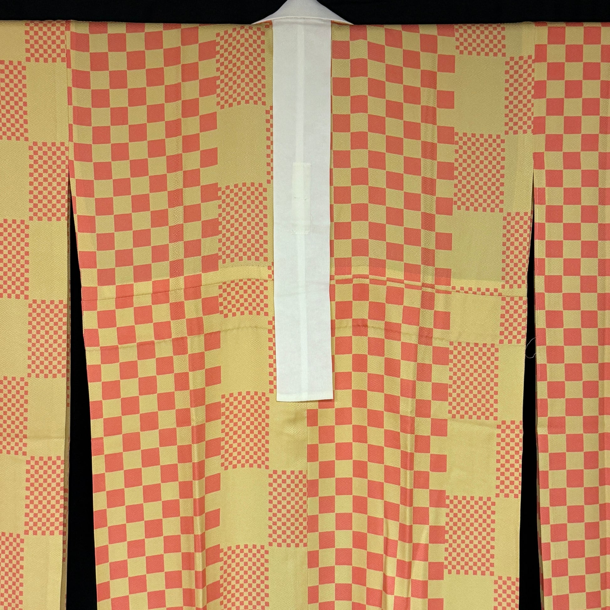 This kimono uses several iterations of the checkerboard pattern, called ichimatsu in Japanese. Large squares, bands of small squares, and the placement of offset squares at the pattern edging - quite artistic!