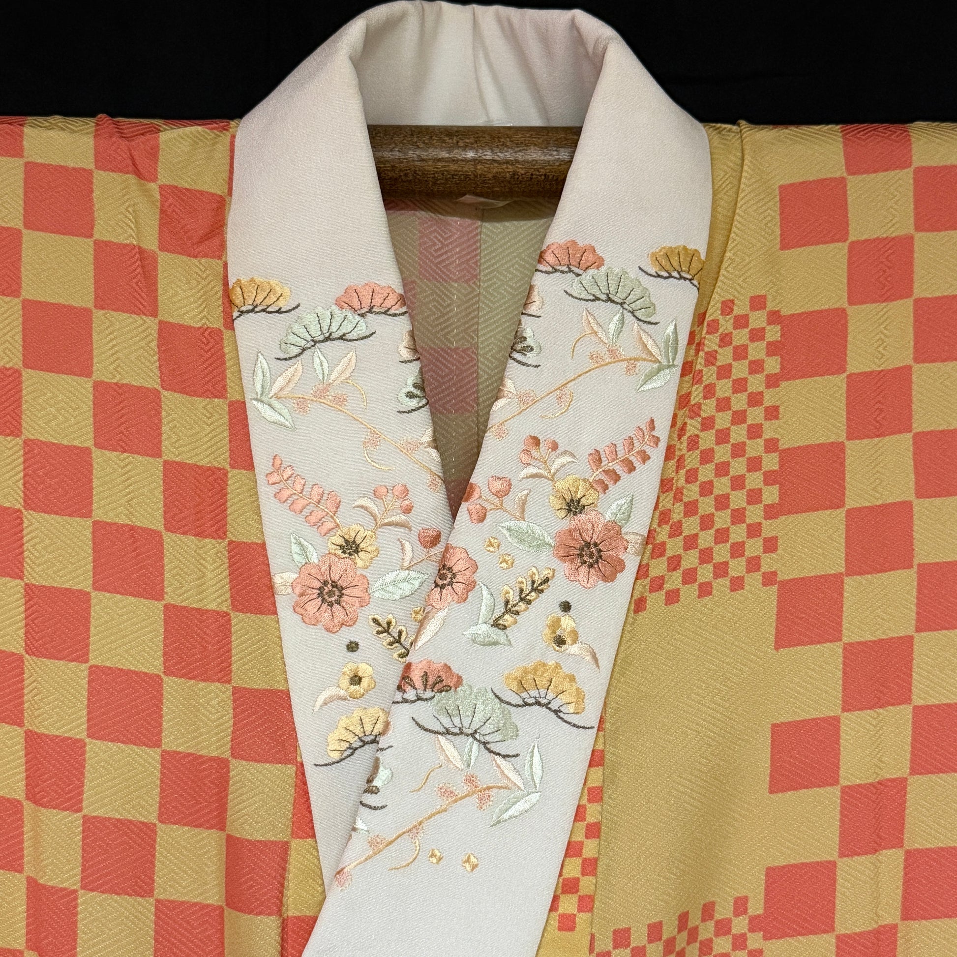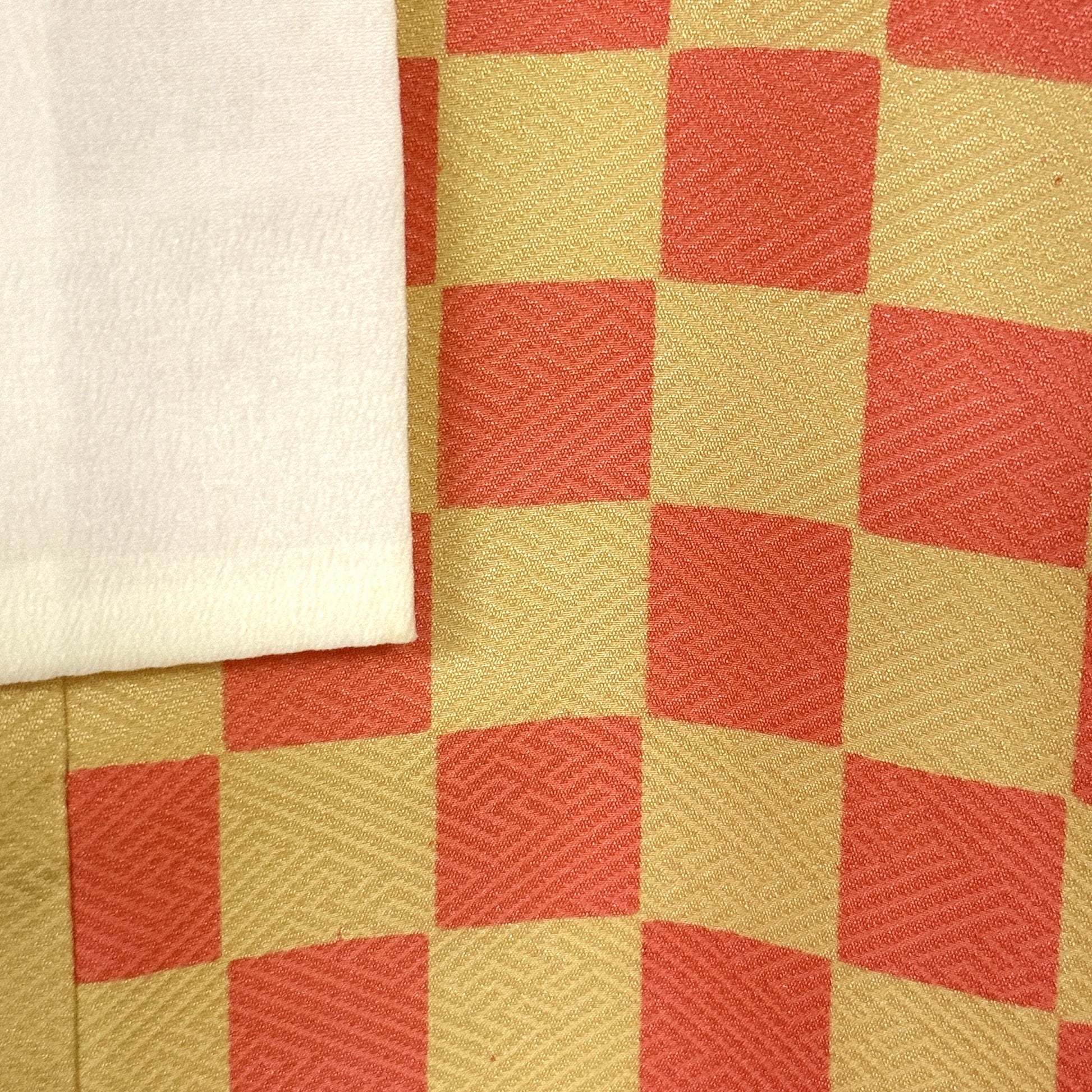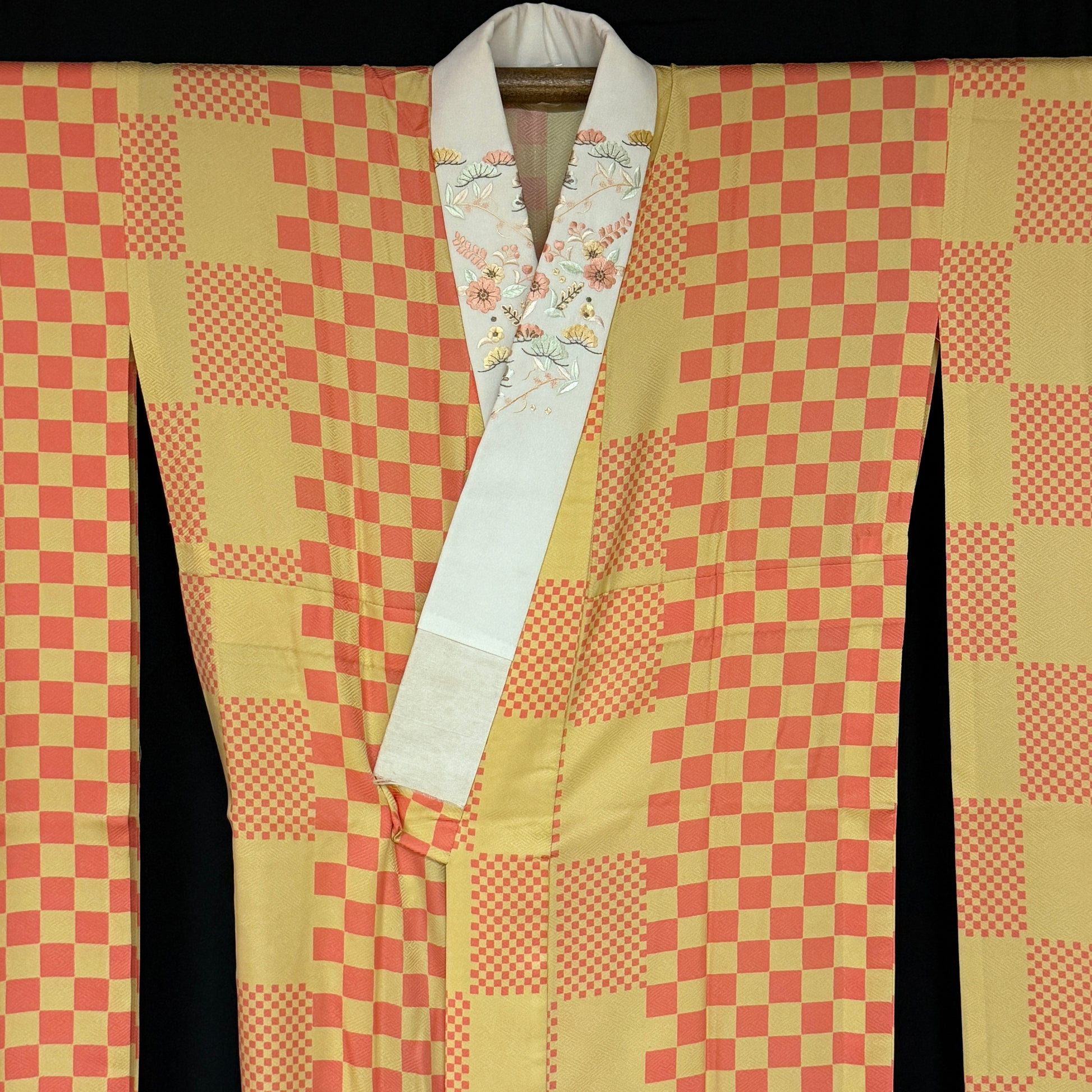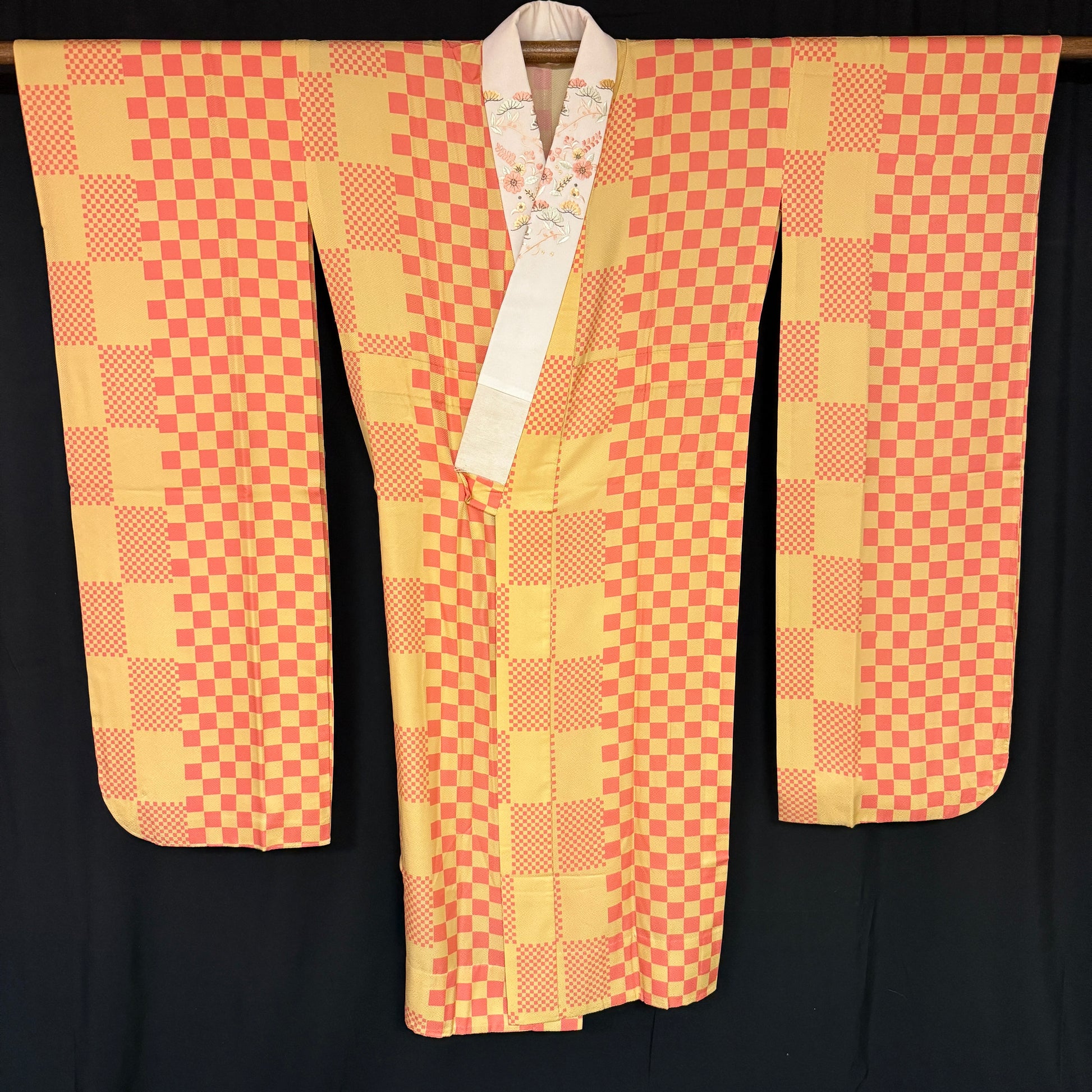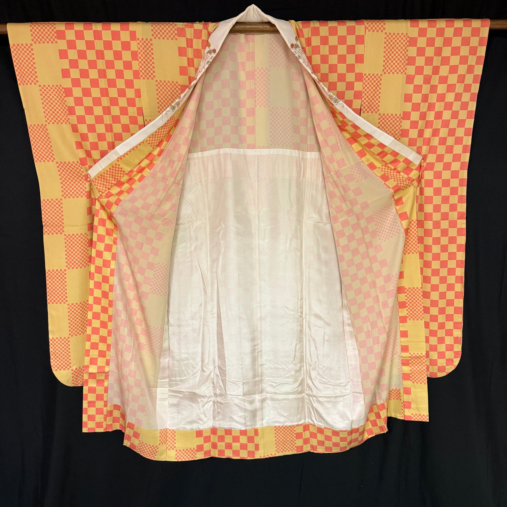 This kimono uses several iterations of the checkerboard pattern, called ichimatsu in Japanese. Large squares, bands of small squares, and the placement of offset squares at the pattern edging - quite artistic!