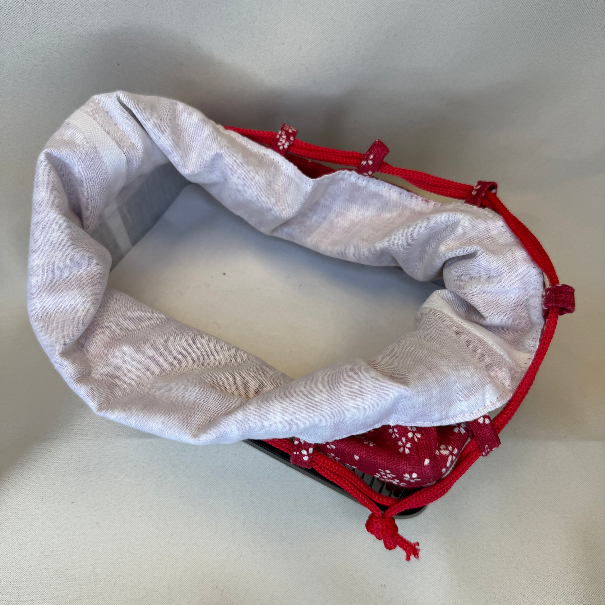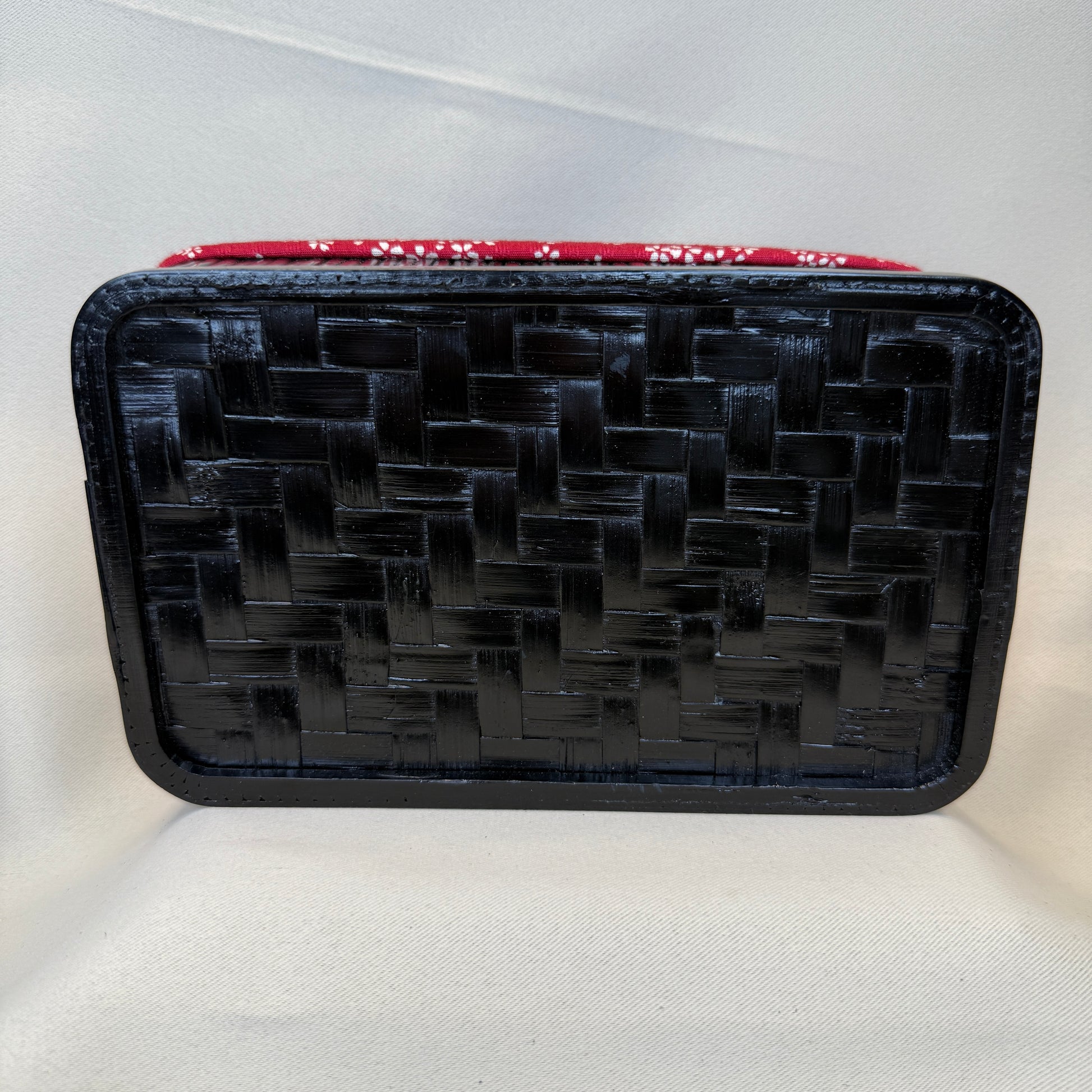 This charming basket bag blends traditional Japanese design with spring flair. The soft red drawstring fabric is adorned with petite white sakura (cherry) blossoms, symbolizing renewal and fleeting beauty. The basket at the bottom is ribbed in glossy black.
