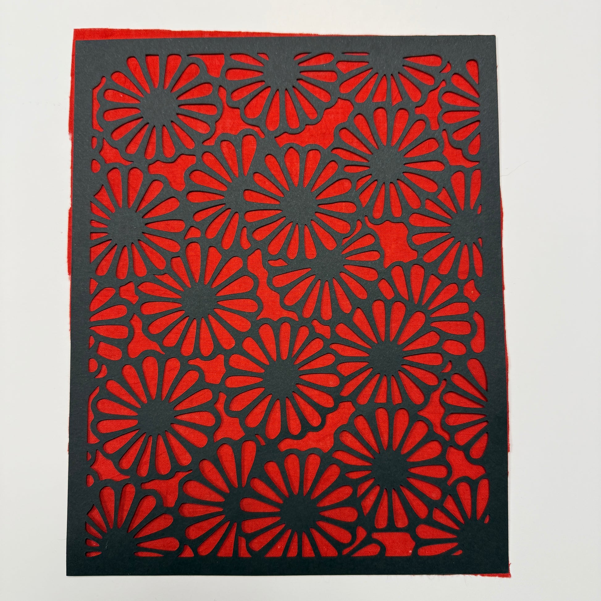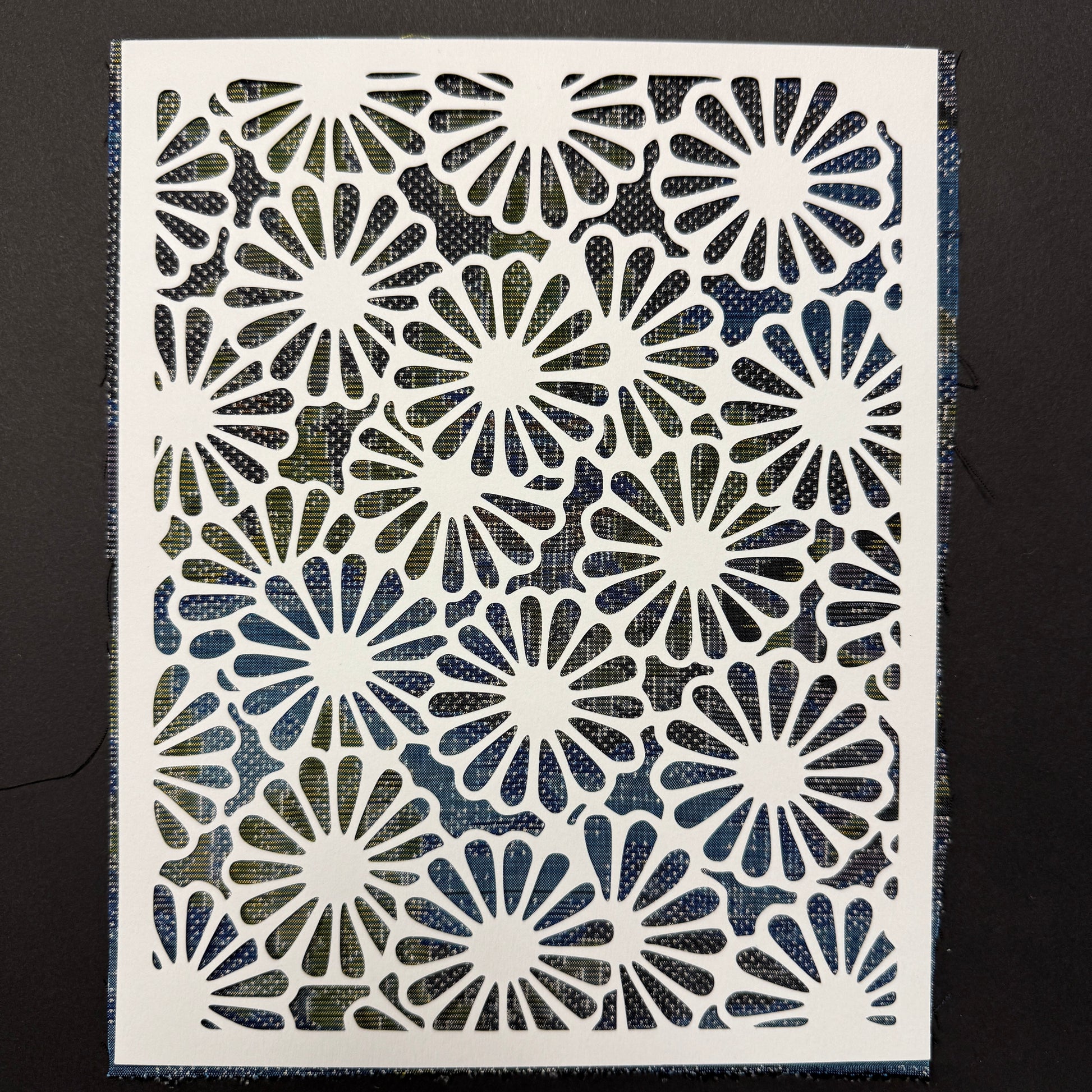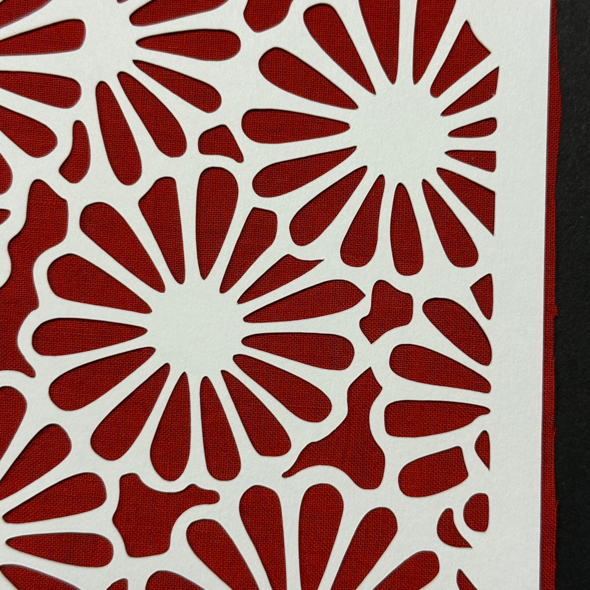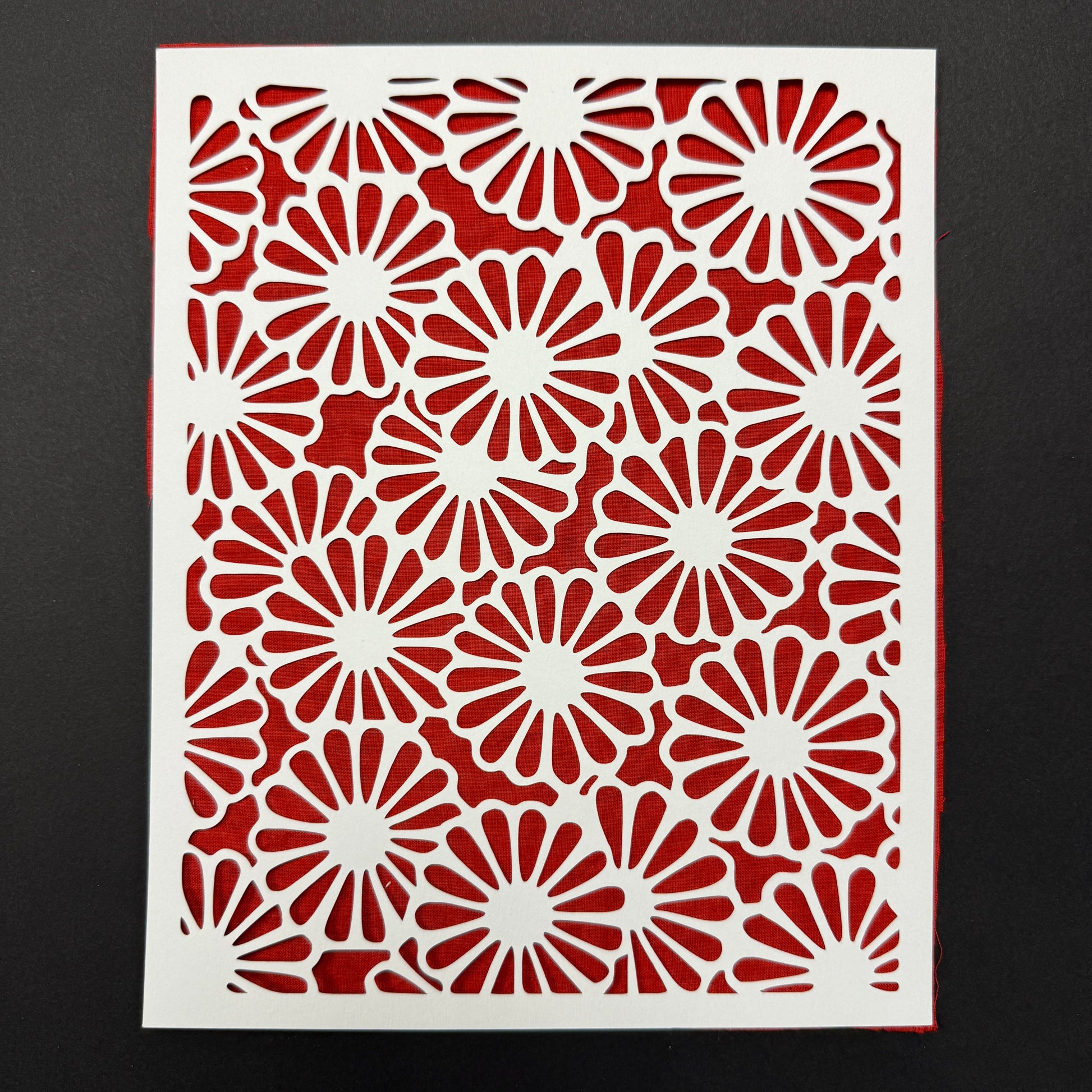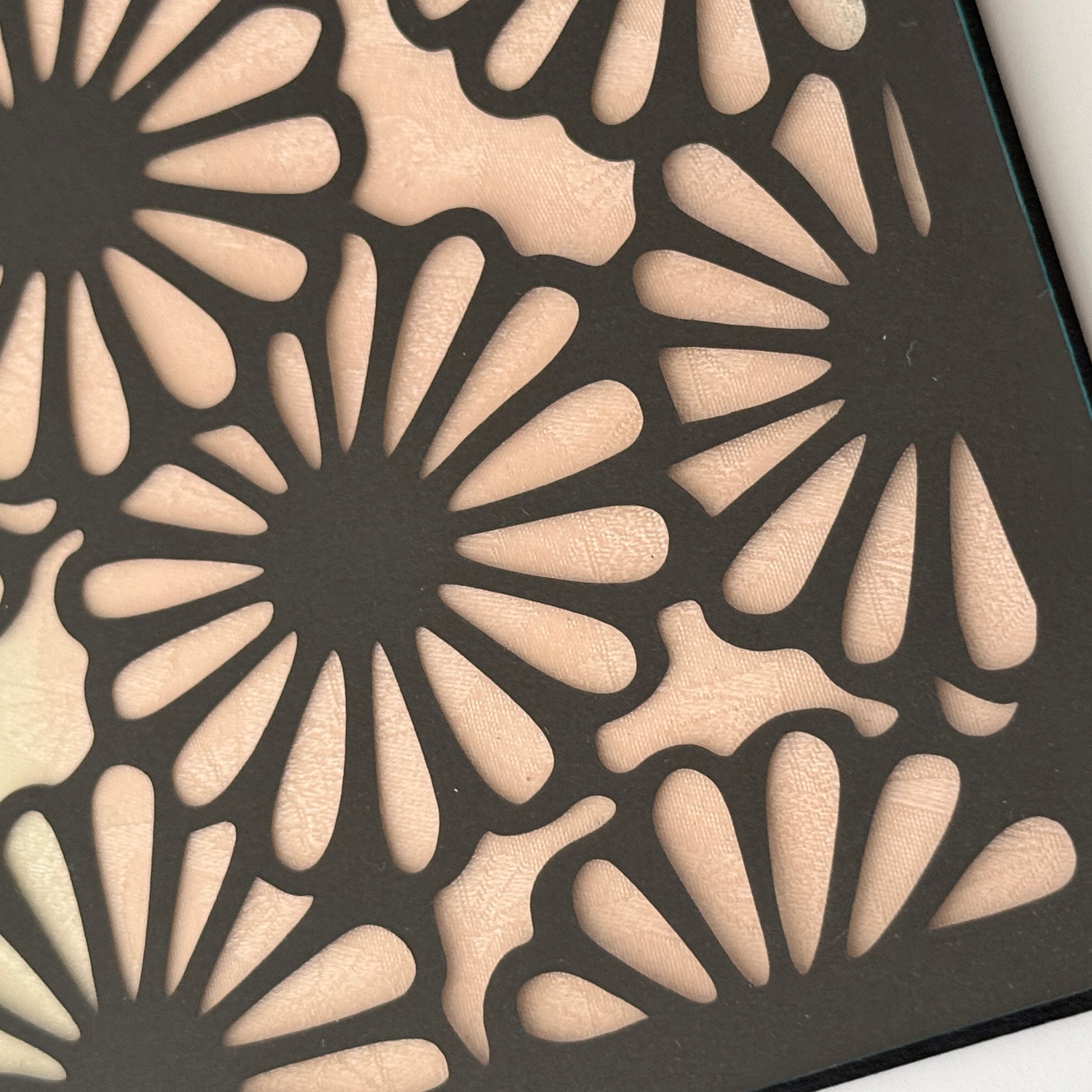 Your purchase includes only a sheet of the katagami art and a contrasting piece of cardstock to place behind it. Photos show examples of how placing different colored paper or fabric behind the stencil can change the display. The last photos give suggestions for framing.