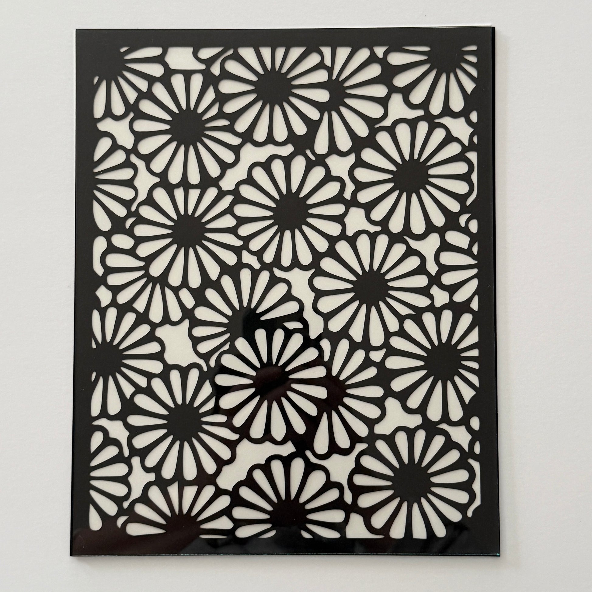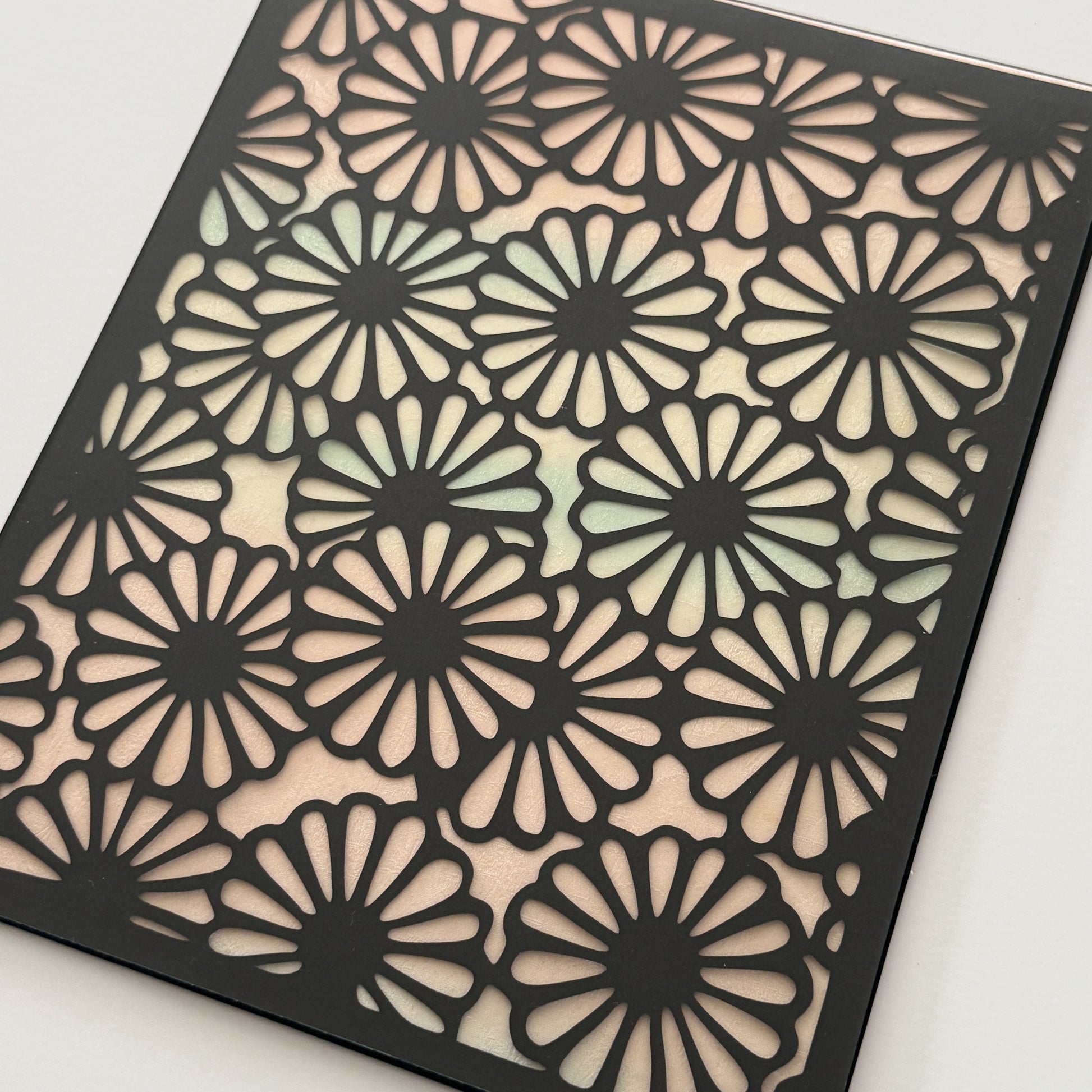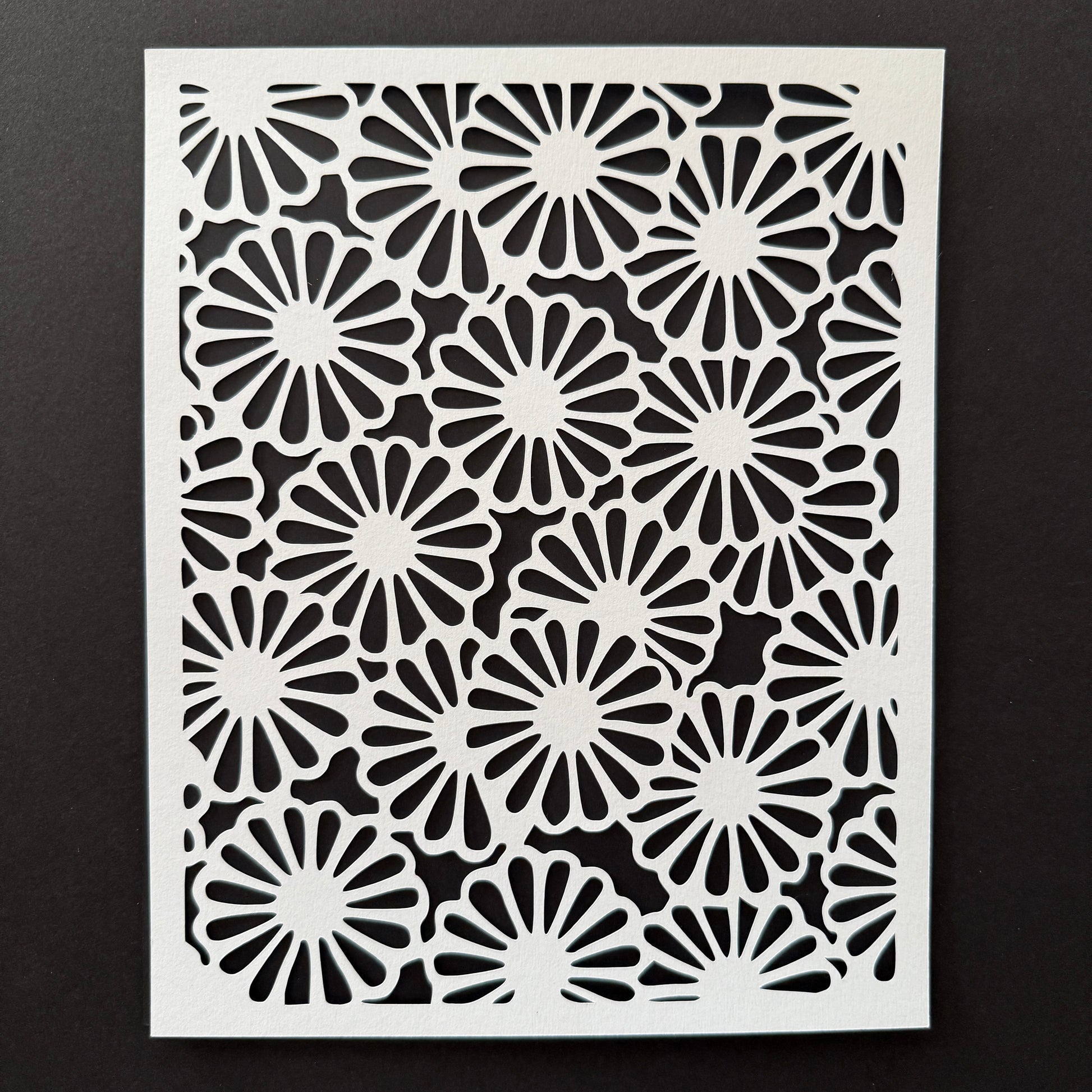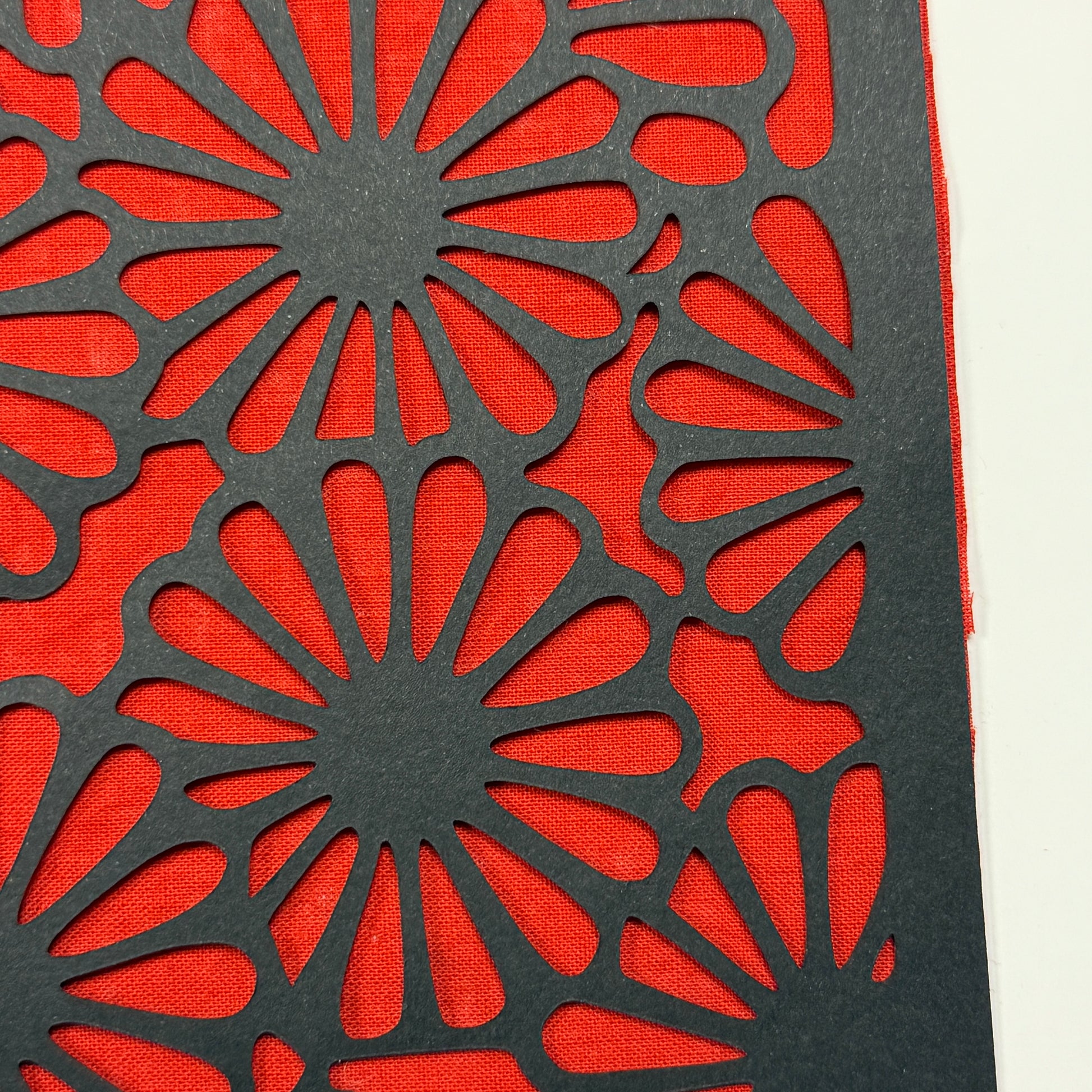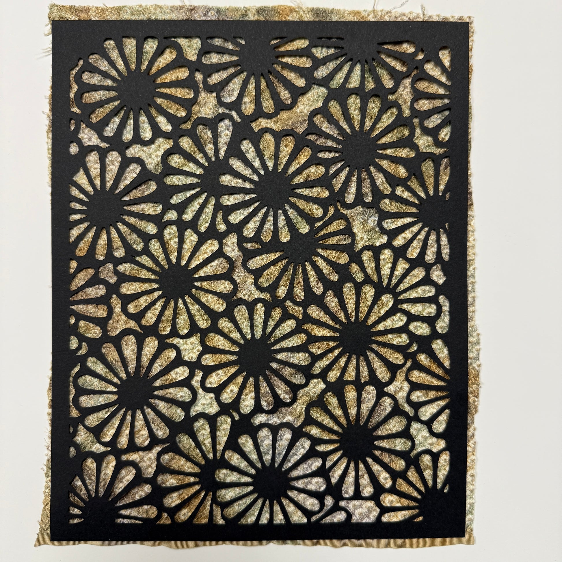 Your purchase includes only a sheet of the katagami art and a contrasting piece of cardstock to place behind it. Photos show examples of how placing different colored paper or fabric behind the stencil can change the display. The last photos give suggestions for framing.