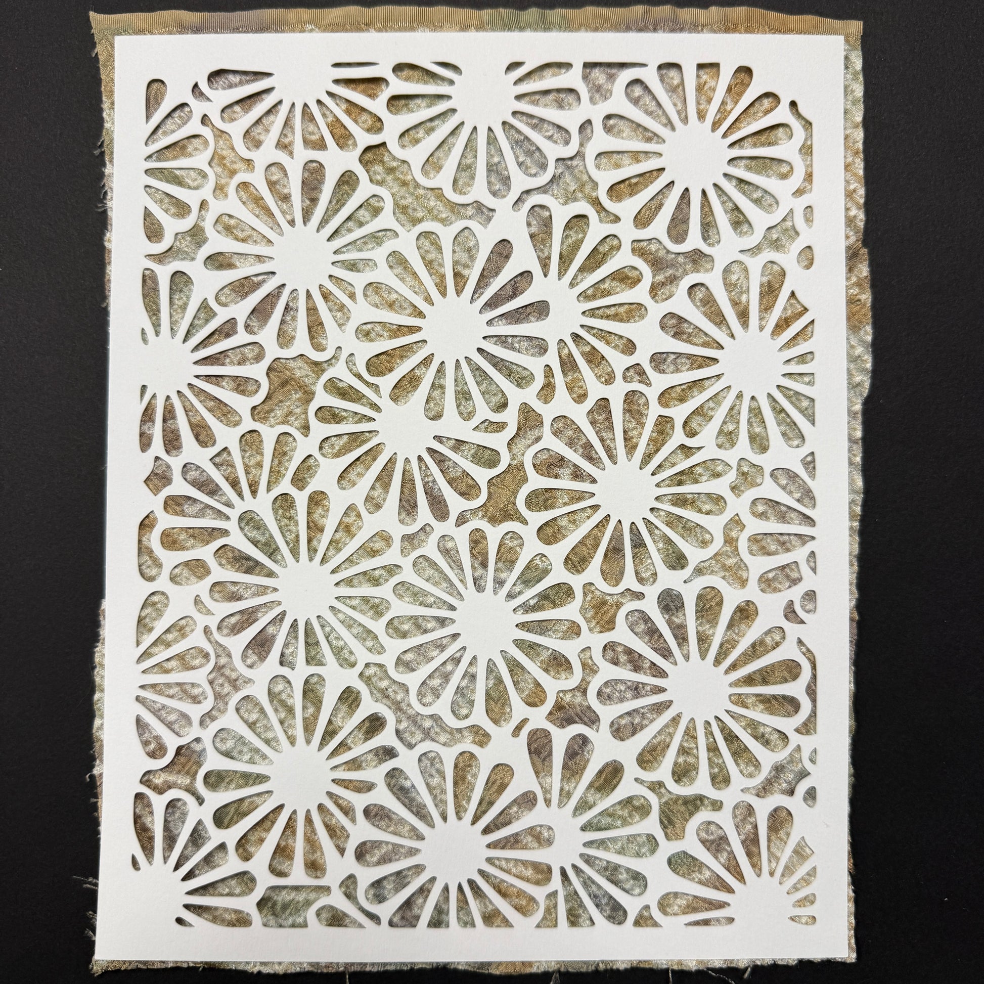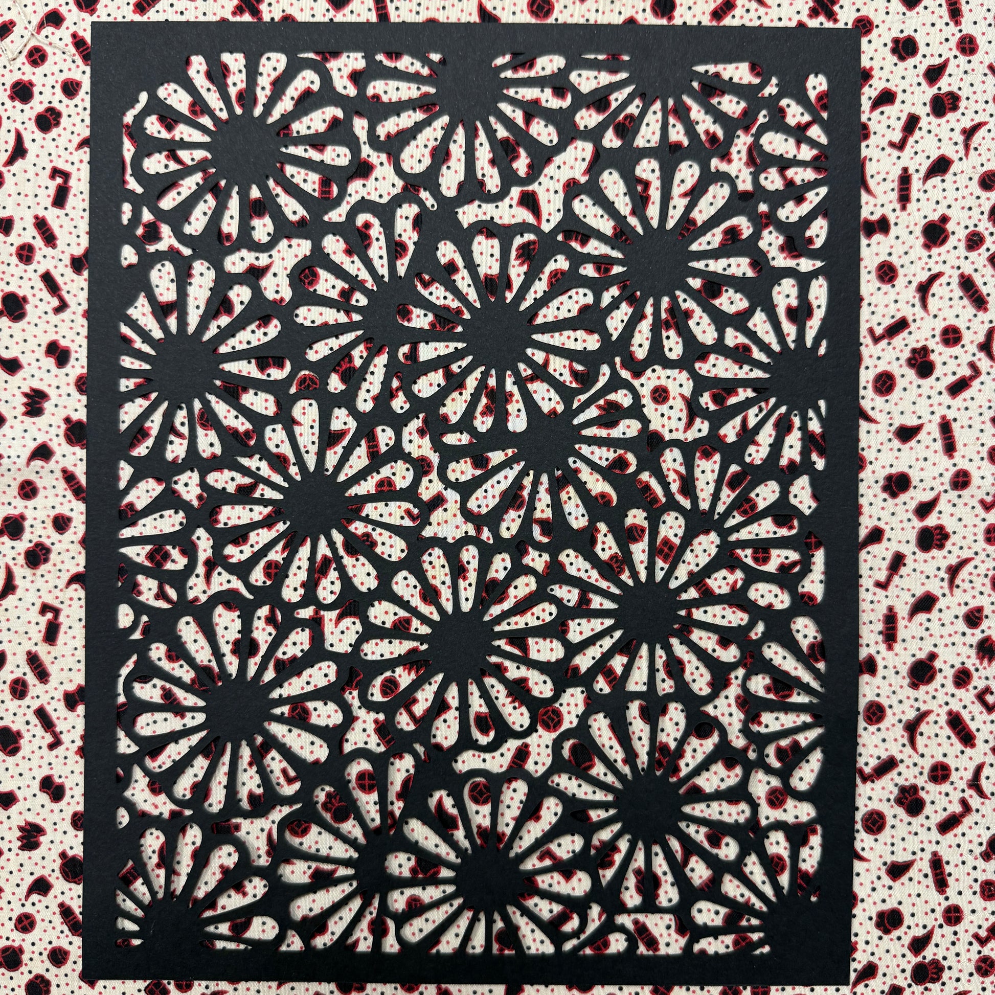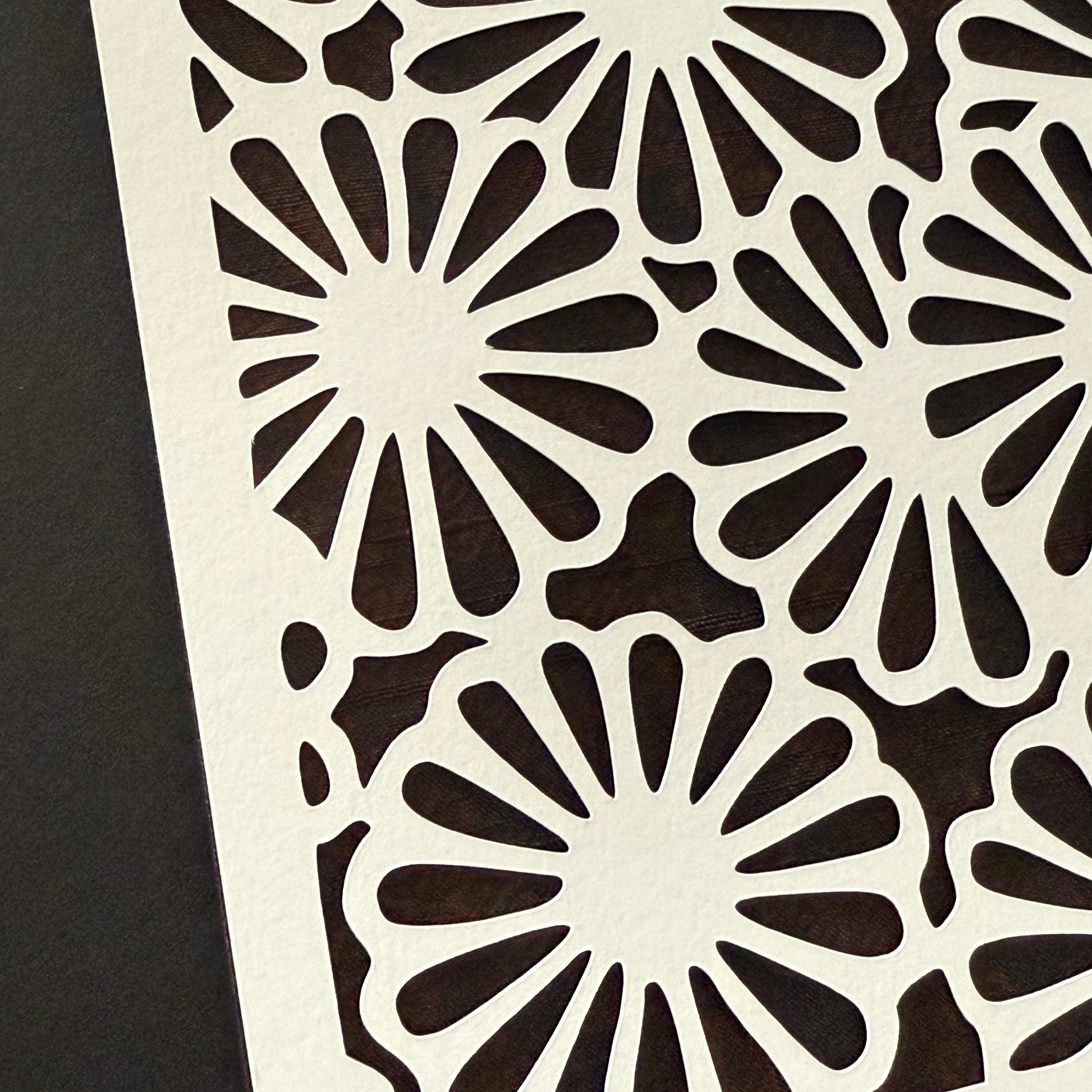 This listing is for a decorative image taken from a vintage Japanese katagami stencil, suitable for framing. It is not part of the original stencil - it is a copied image, machine-cut, on thick art paper. See below for how these traditional stencils were designed, cut by hand and used to pattern Japanese textiles.