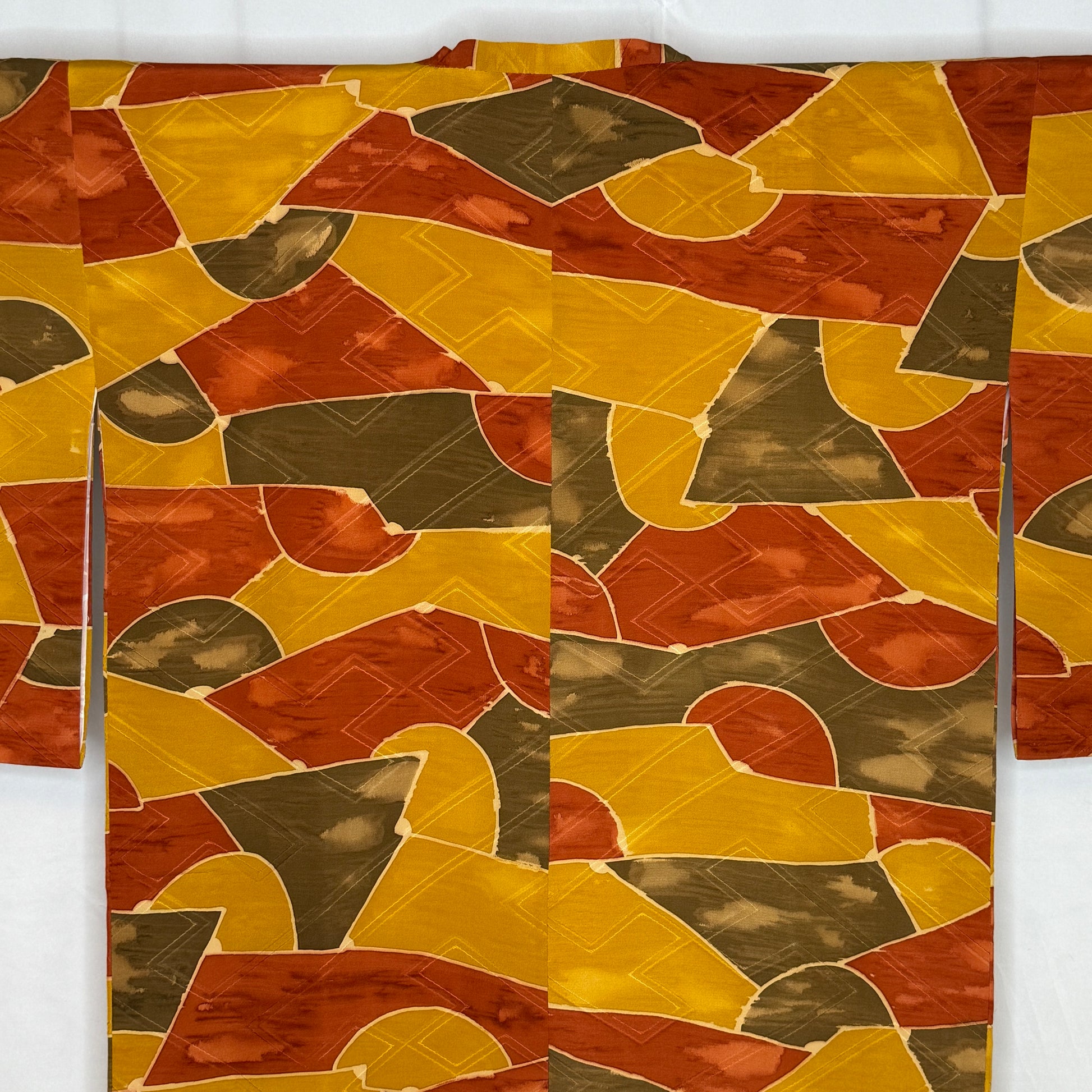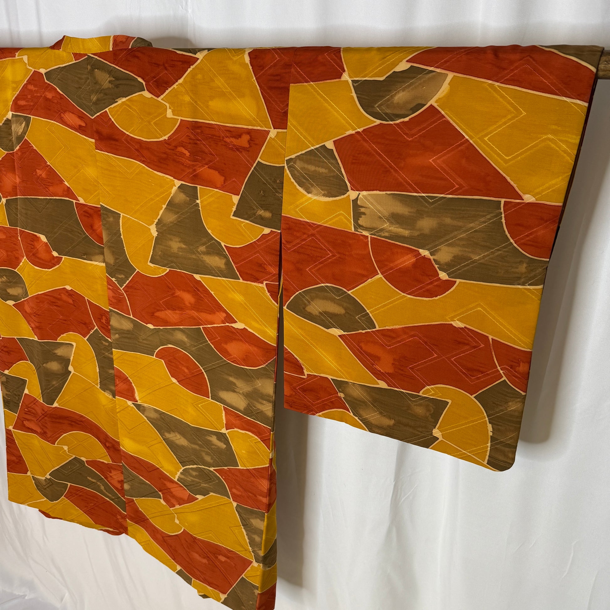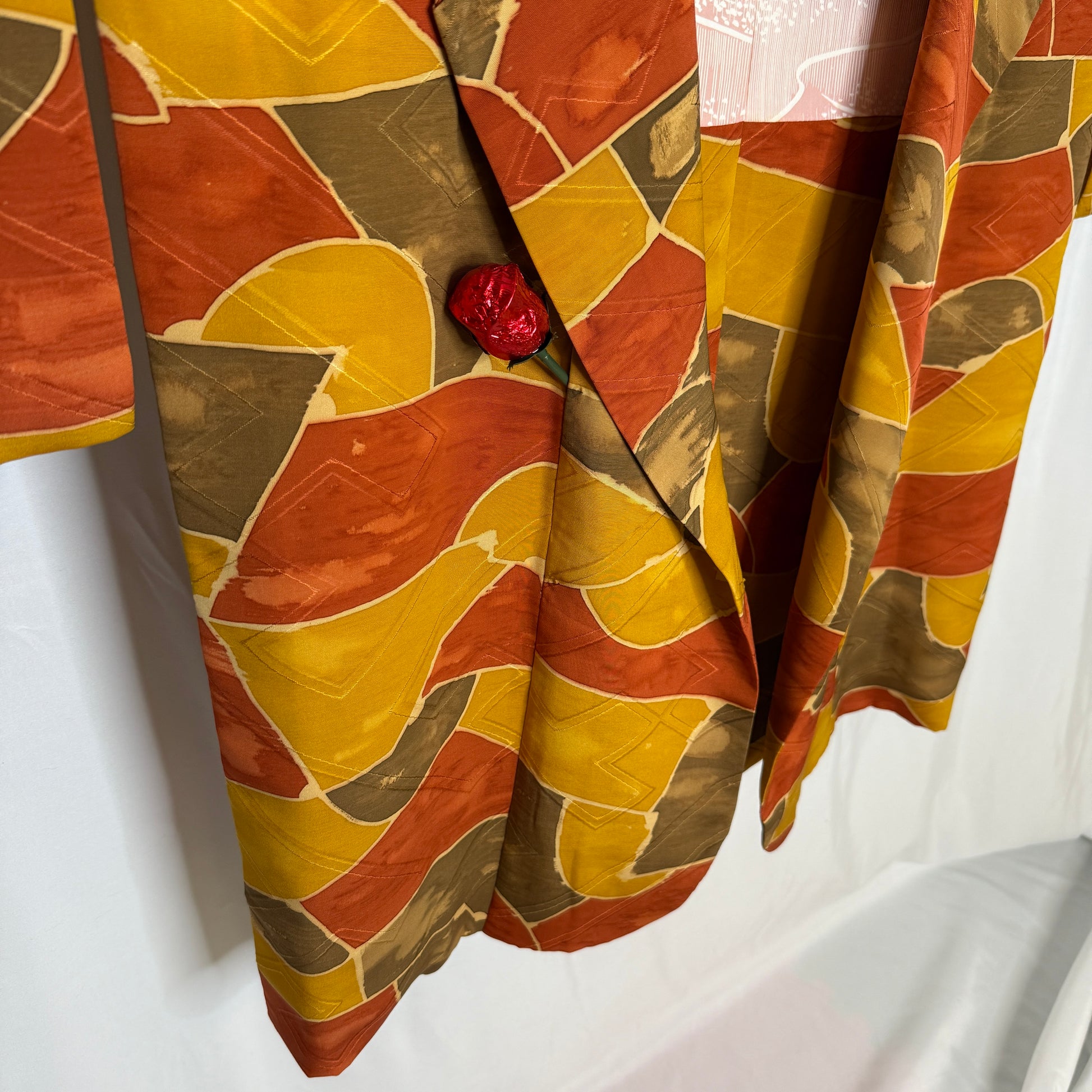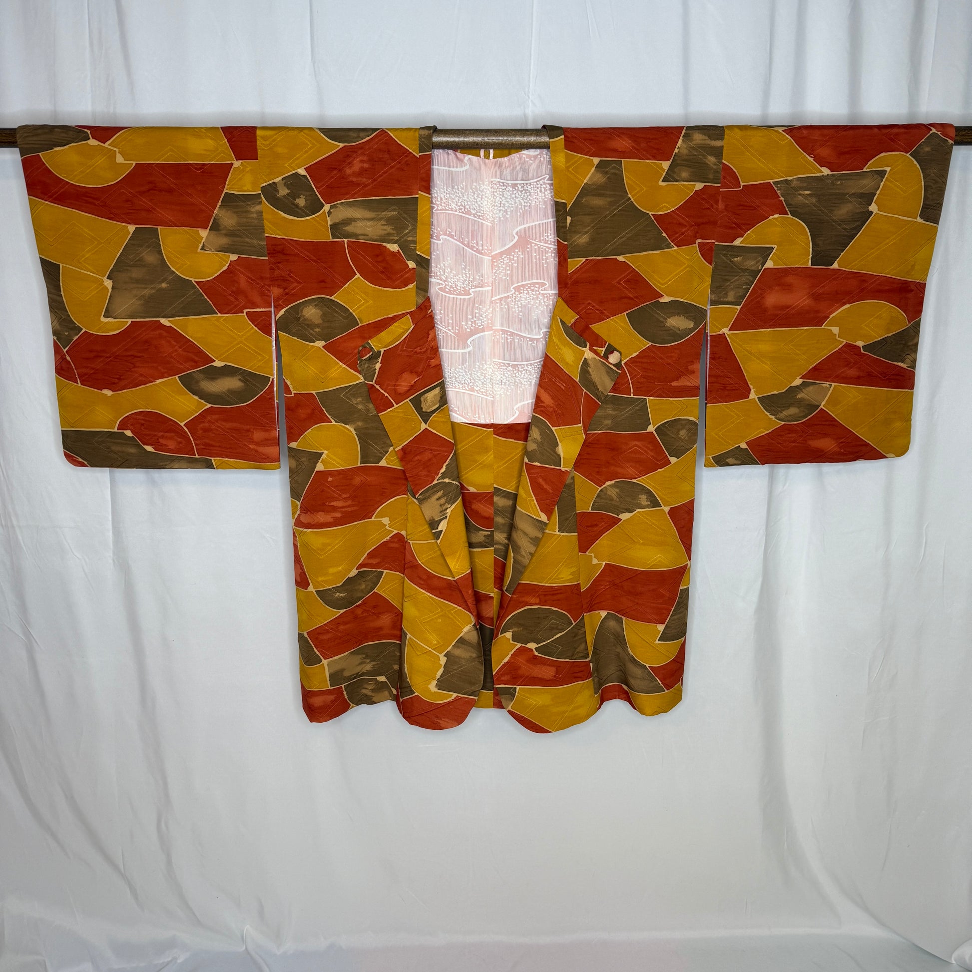 This jacket features large blocks of "retro kitchen colors" - steel gray, rust and harvest gold! - in a chunky, abstract mosaic pattern. The white lines separating the colors appear to be hand drawn. Look closely to see the sayagata (inclined crosses) jacquard weave in the silk.