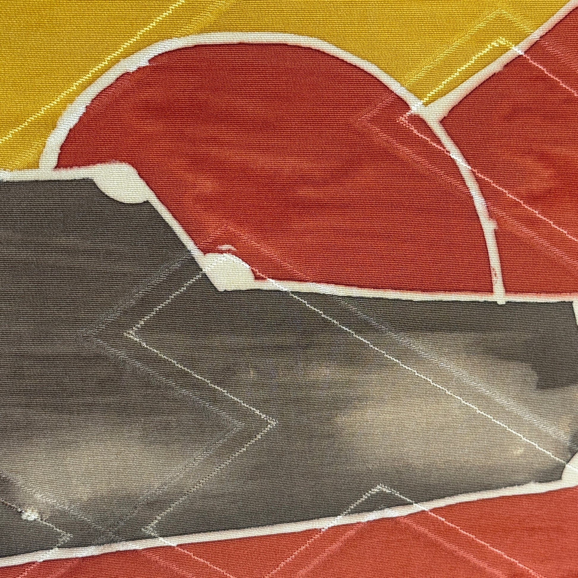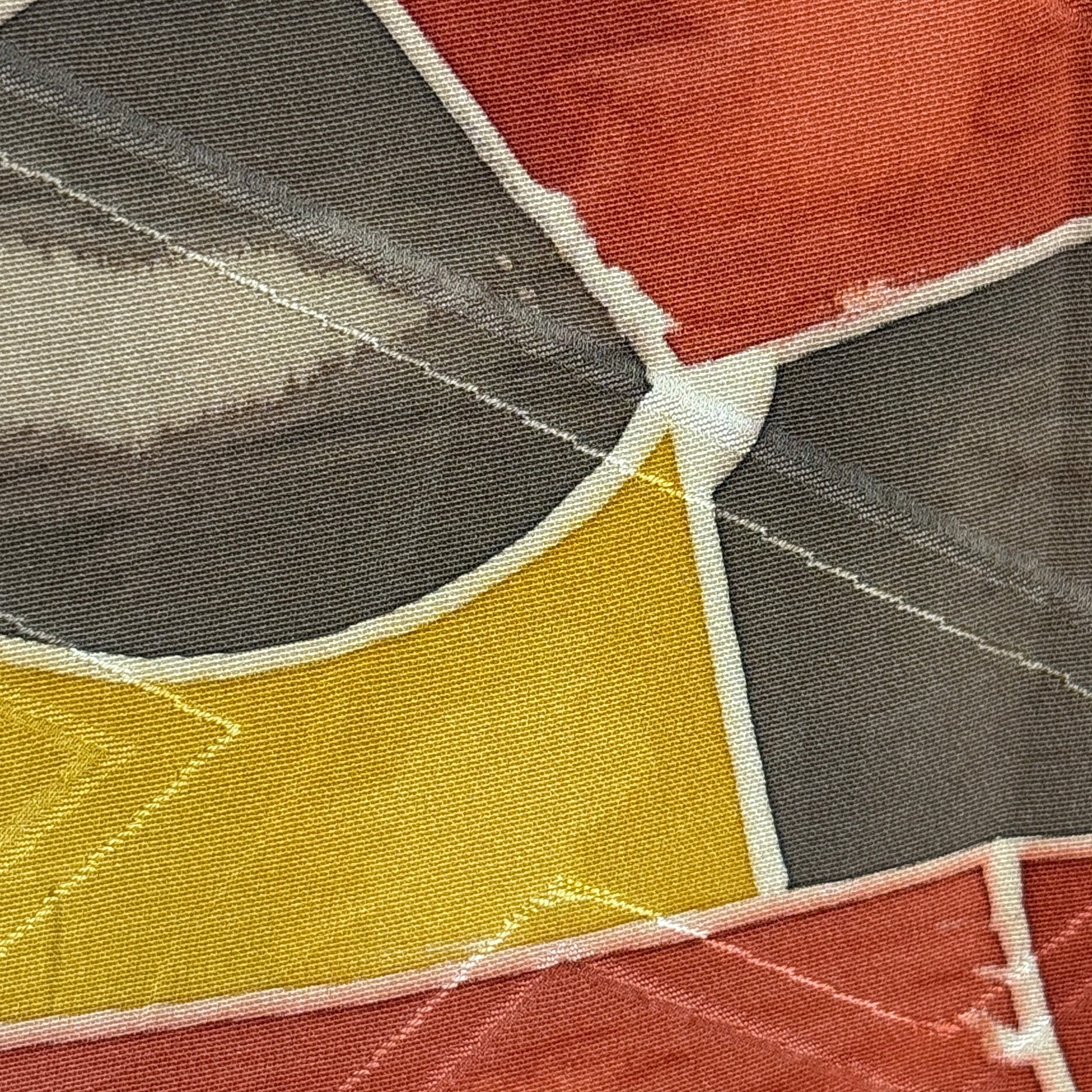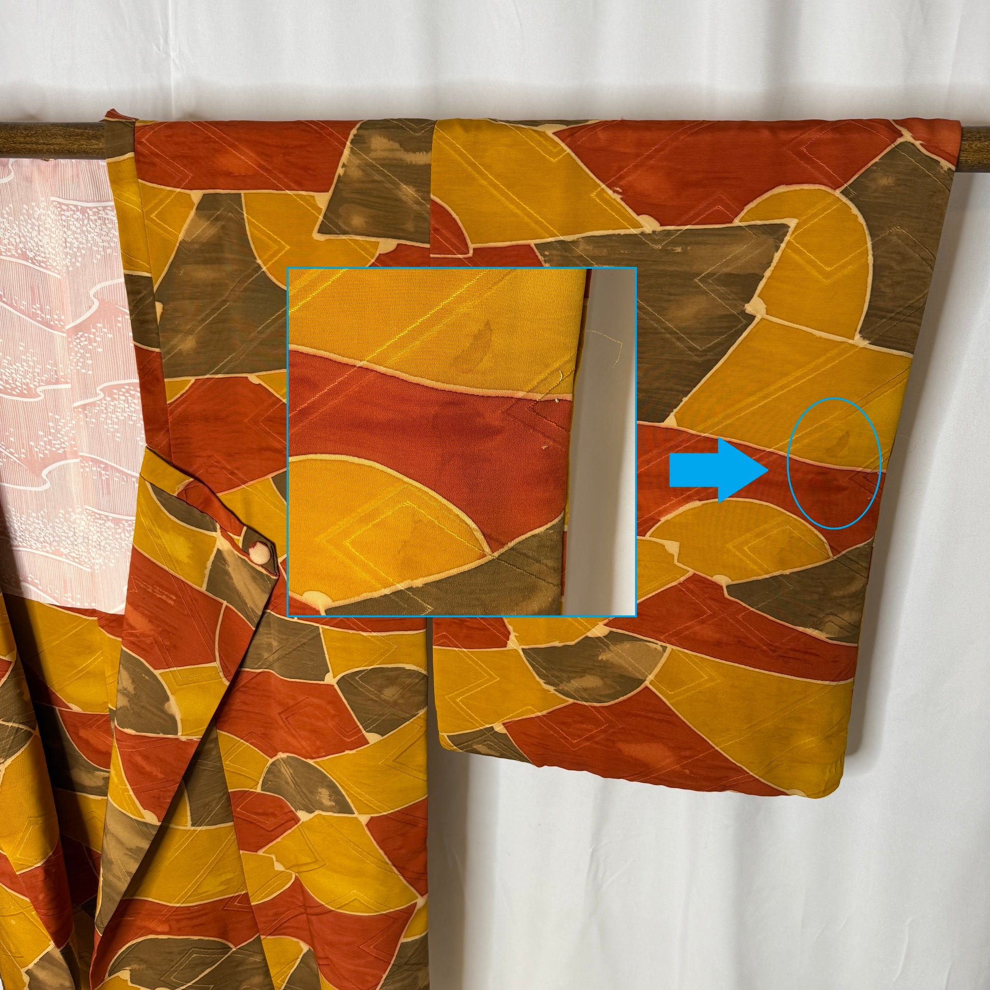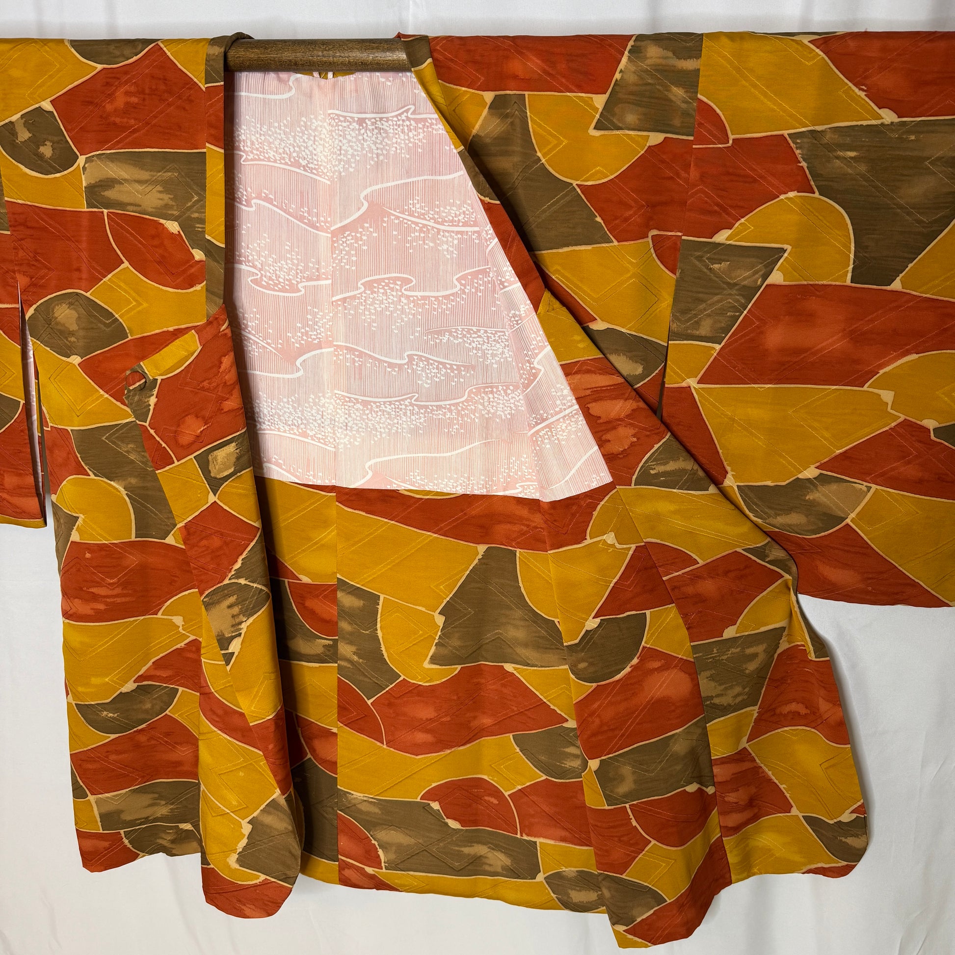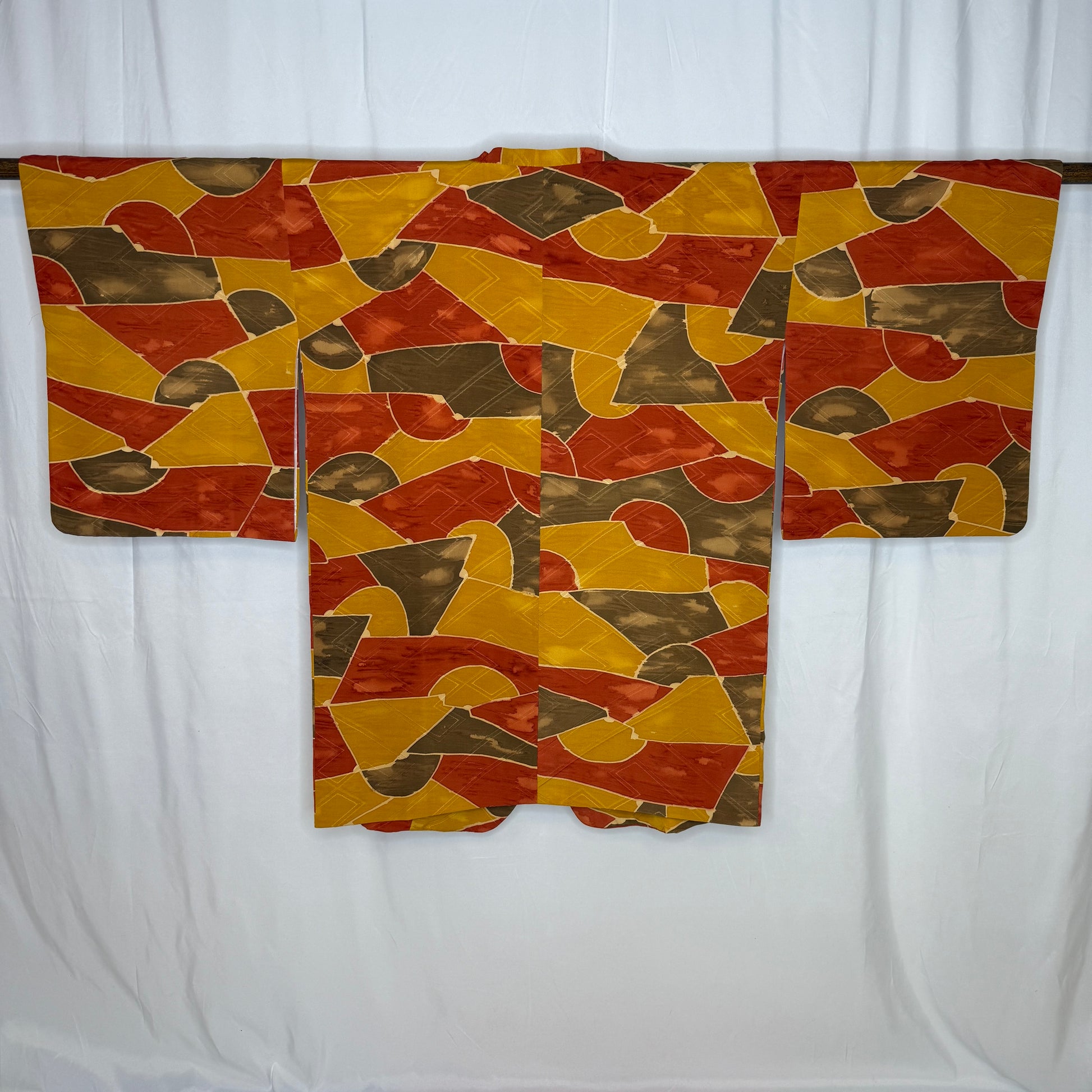 This jacket features large blocks of "retro kitchen colors" - steel gray, rust and harvest gold! - in a chunky, abstract mosaic pattern. The white lines separating the colors appear to be hand drawn. Look closely to see the sayagata (inclined crosses) jacquard weave in the silk.