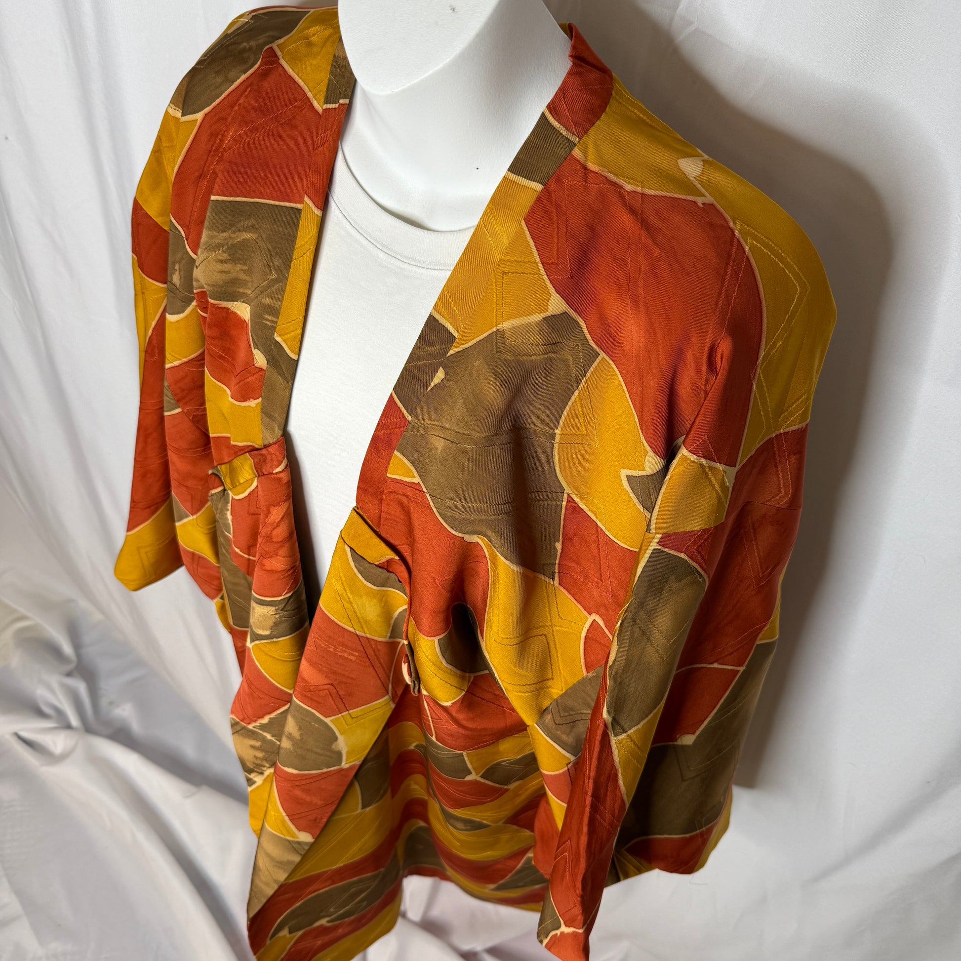 Each Japanique Jacket starts out as a vintage michiyuki, which is a narrow jacket with a deep, square neckline and snap closures, meant to be worn on top of a kimono. Most vintage michiyuki won't fit larger frames, so we modified the traditional garment slightly by removing the snaps and tacking the panels back to create lapels. The result is an open, flowing jacket that can fit sizes 10-16. Japanique Jackets can also be crossed over and belted on a smaller-sized person. These are all one-of-a-kind jackets, so sizing will vary slightly, see measurements given.