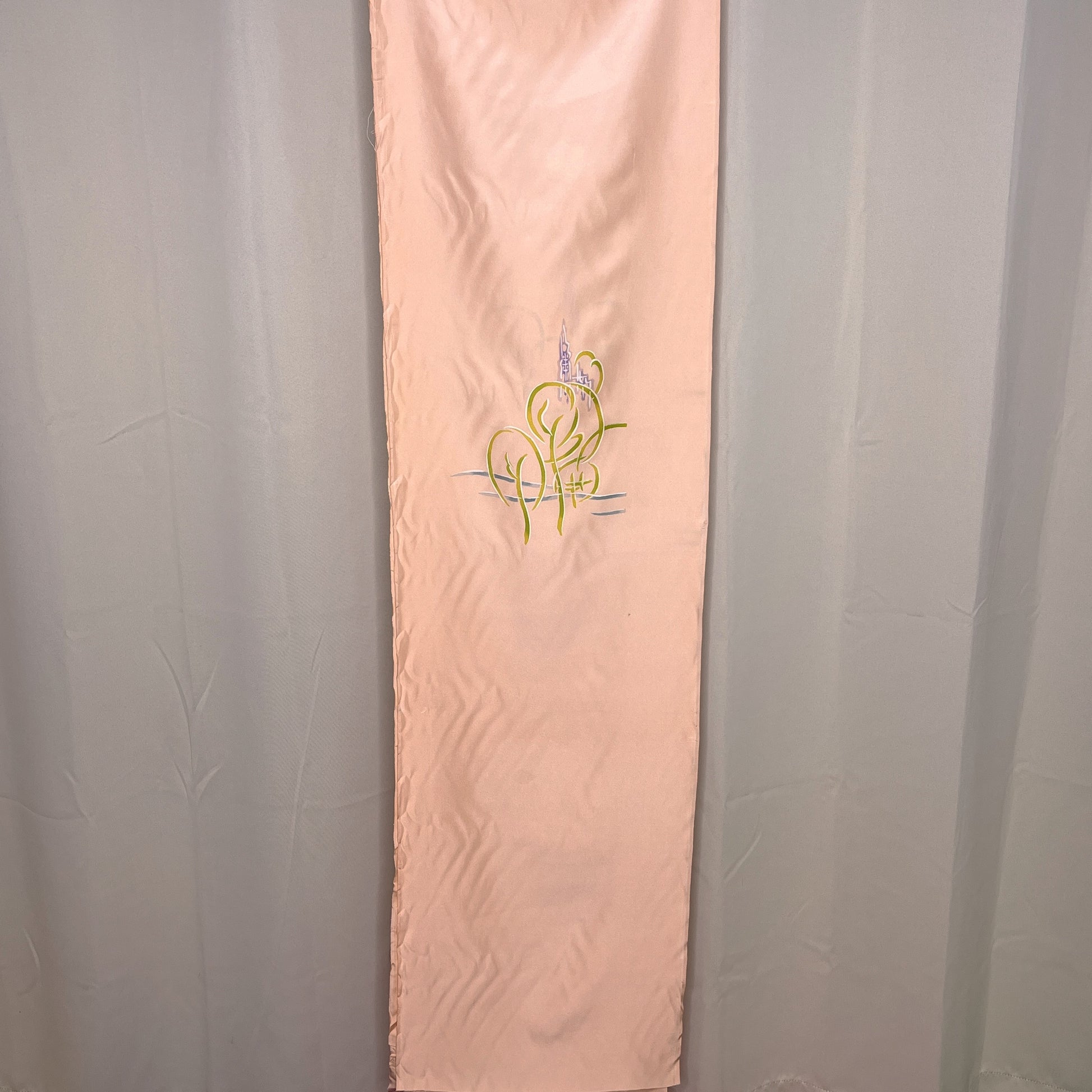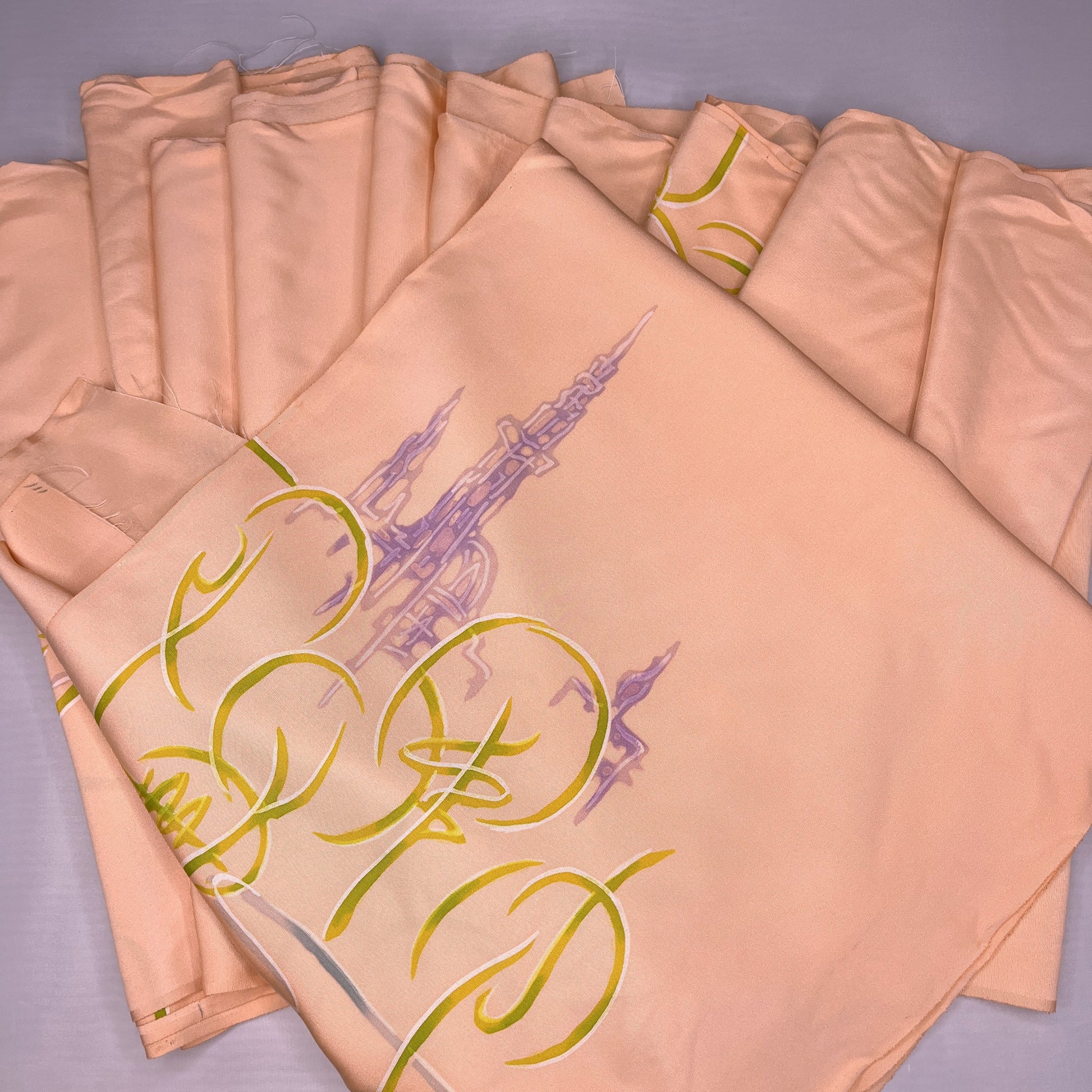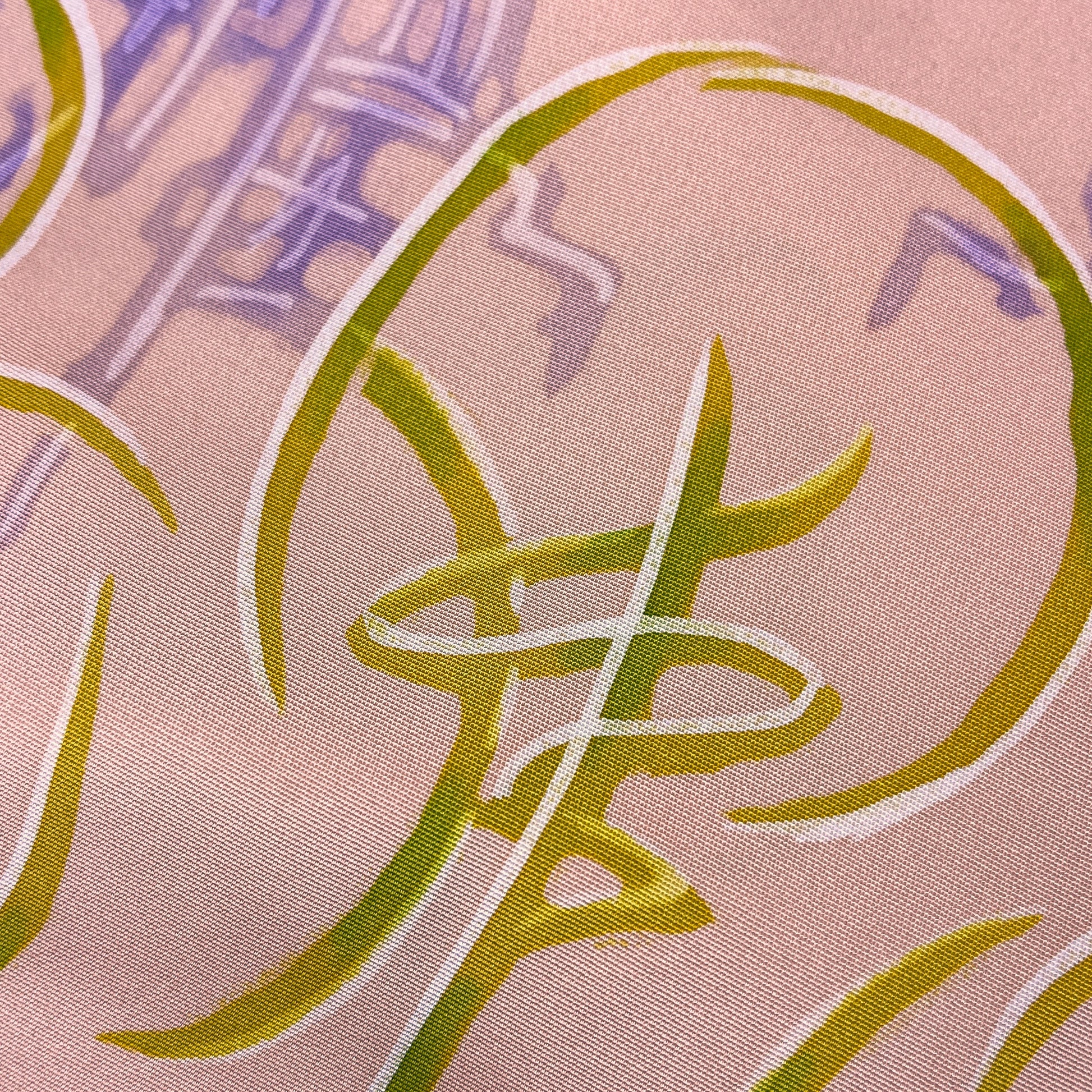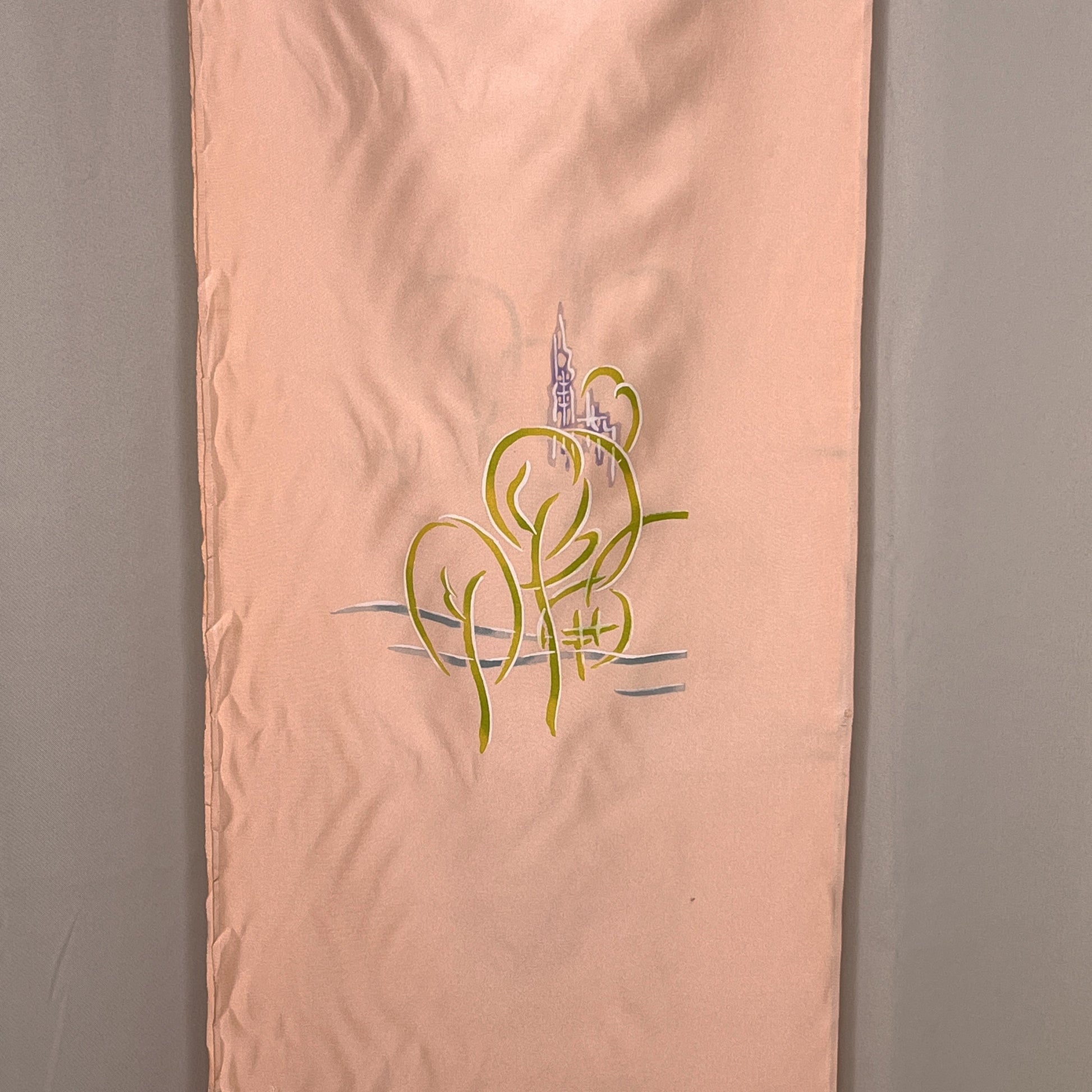 The pattern is an abstract urban scene, with chartreuse trees created with brushstrokes to the lavender tower (church spire? sky-scraper?) in the distance. All on a cantalope-colored background. The design appears in several places that would have appears at the front hemline and sleeves.