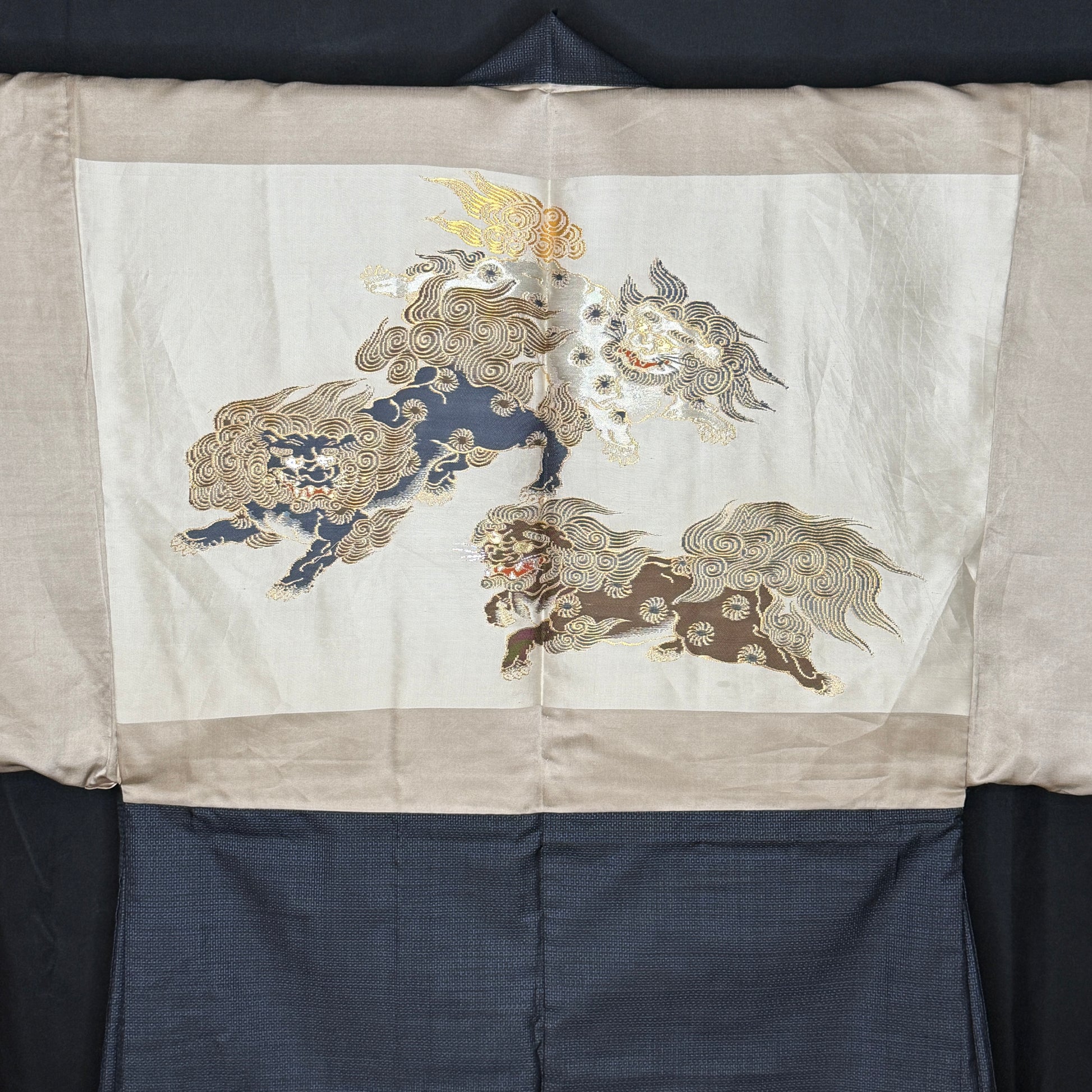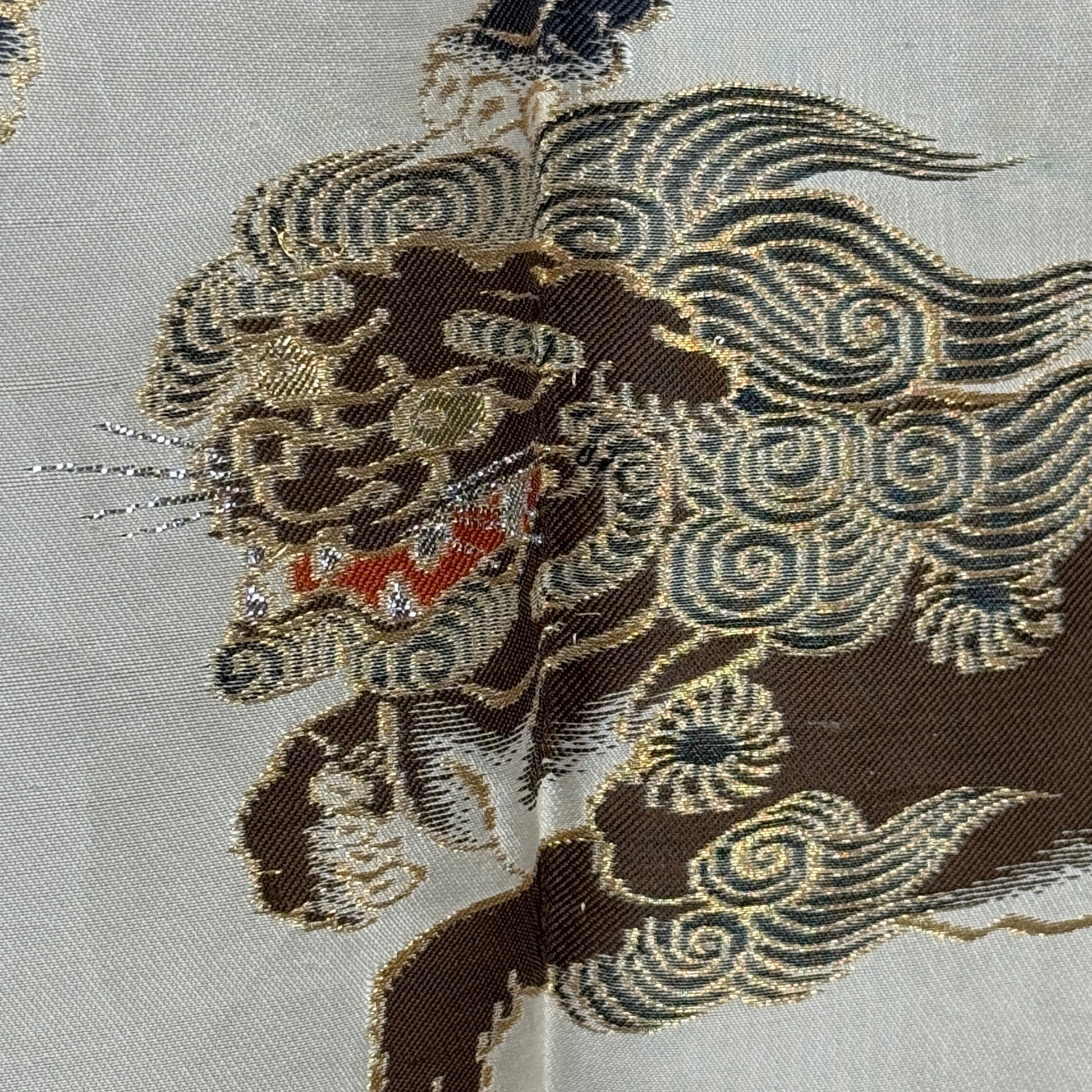 The lining of this man's kimono jacket embodies strength and protection through its magnificent woven shishi, or lion dogs (also fu dogs), their manes and tails like swirling clouds. A beautifully detailed scene in gold, cream, russet brown, navy blue, and gray. These mythical guardians symbolize courage and ward off evil.