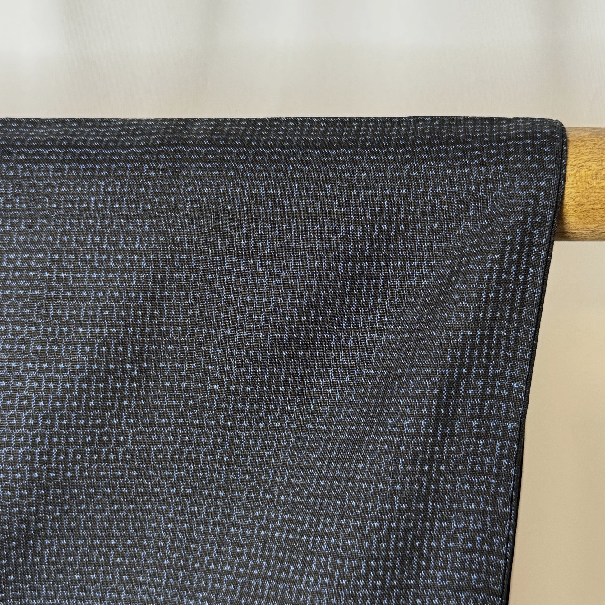 The outer jacket fabric is dark blue with an overall tiny geometric grid.