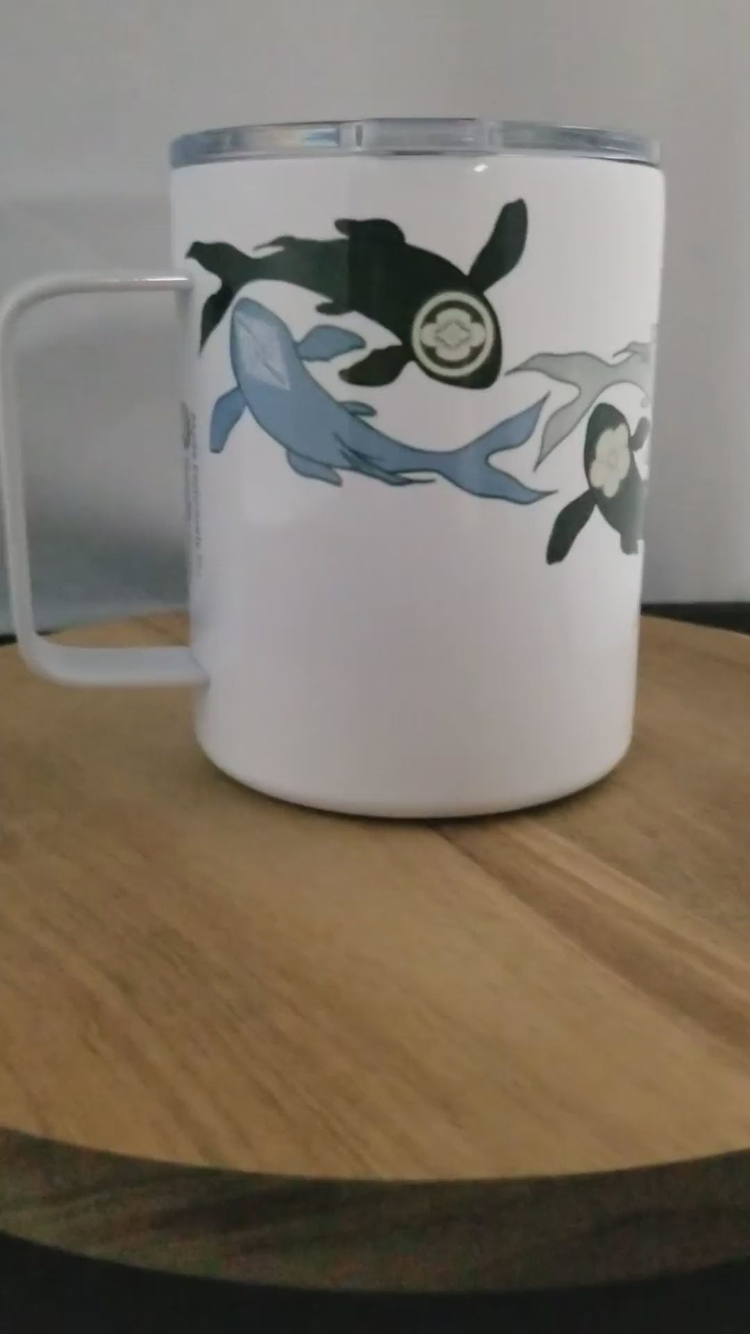 This 15oz mug is stainless steel, double-walled, and insulated with a snap on top with a sliding cover for the opening. These are made-to-order and will ship within four business days.