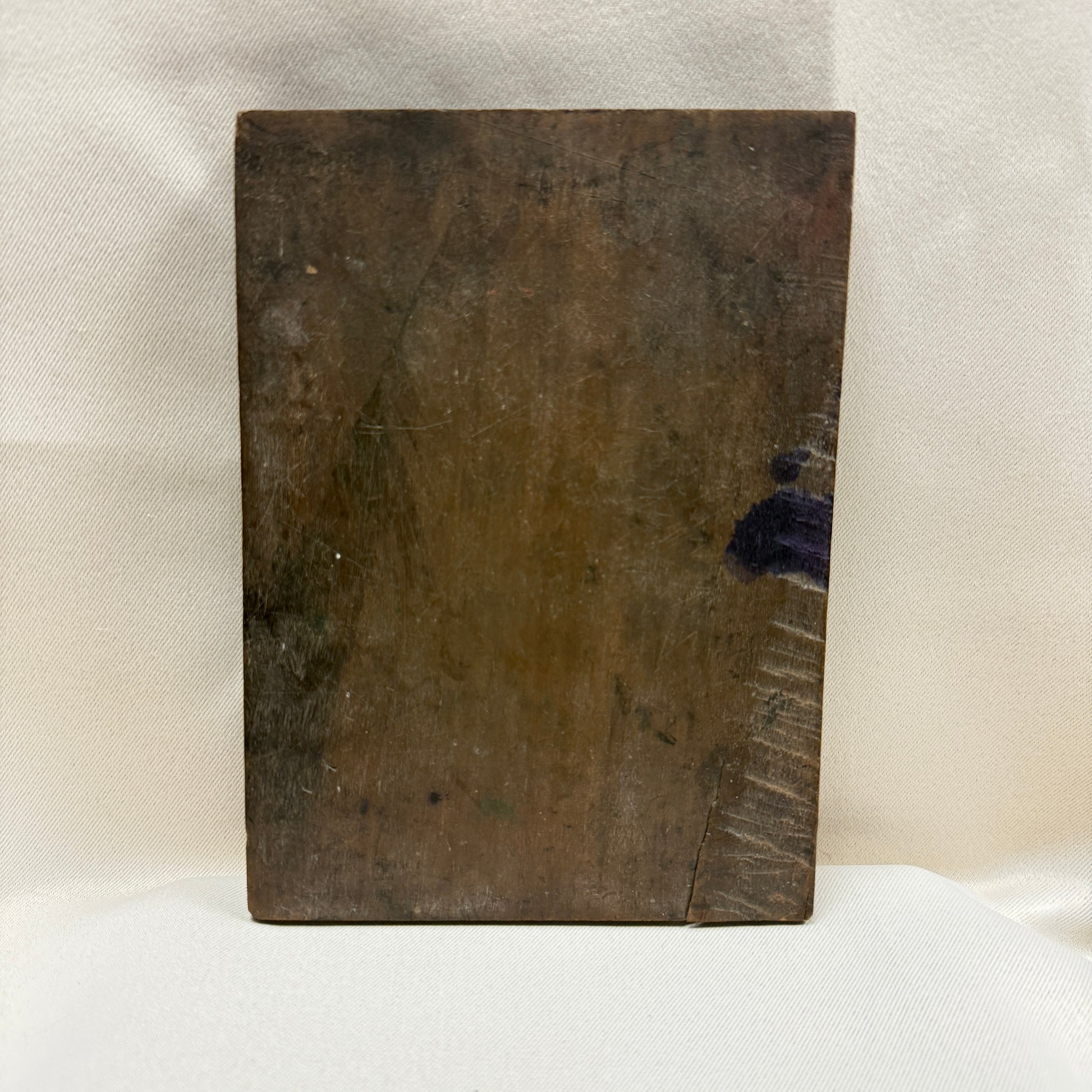 This carved Japanese woodblock depicts Daikokuten, one of the Seven Lucky Gods of good fortune. The smiling figure stands atop rice bales, holding the lucky mallet (uchide no kozuchi) and carrying a treasure sack -- traditional symbols of wealth and abundance.