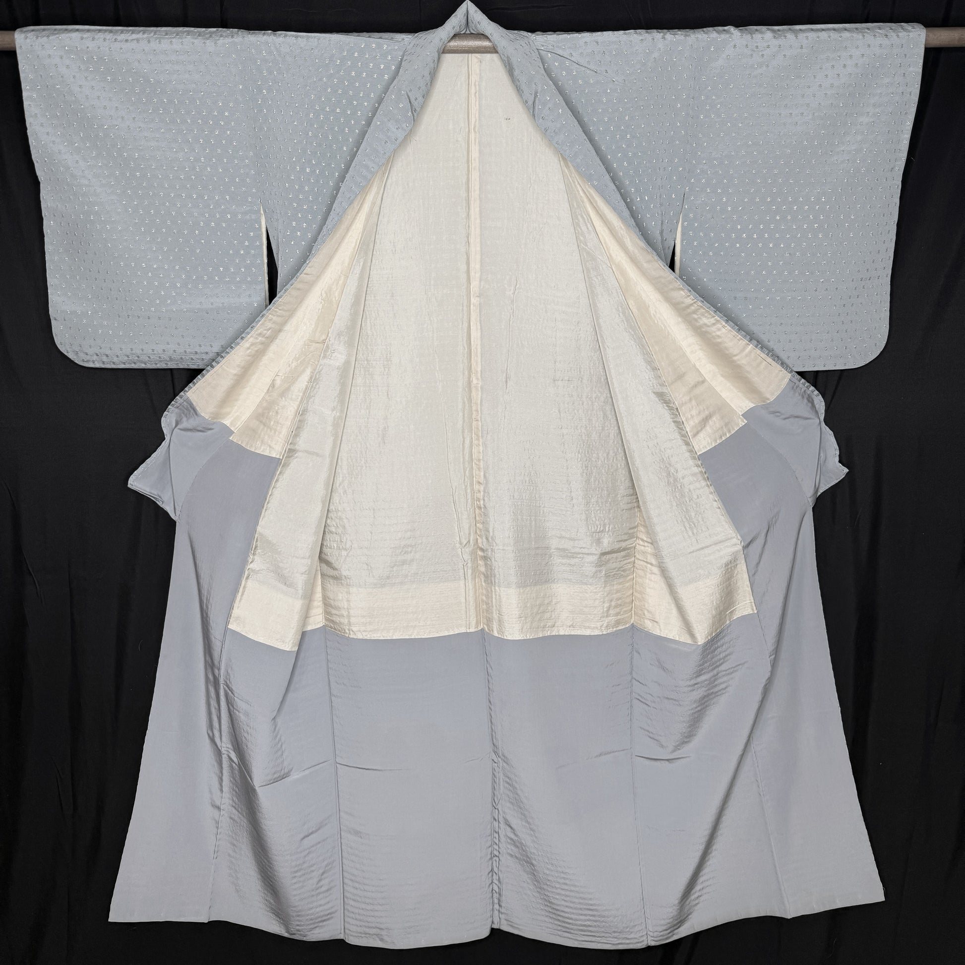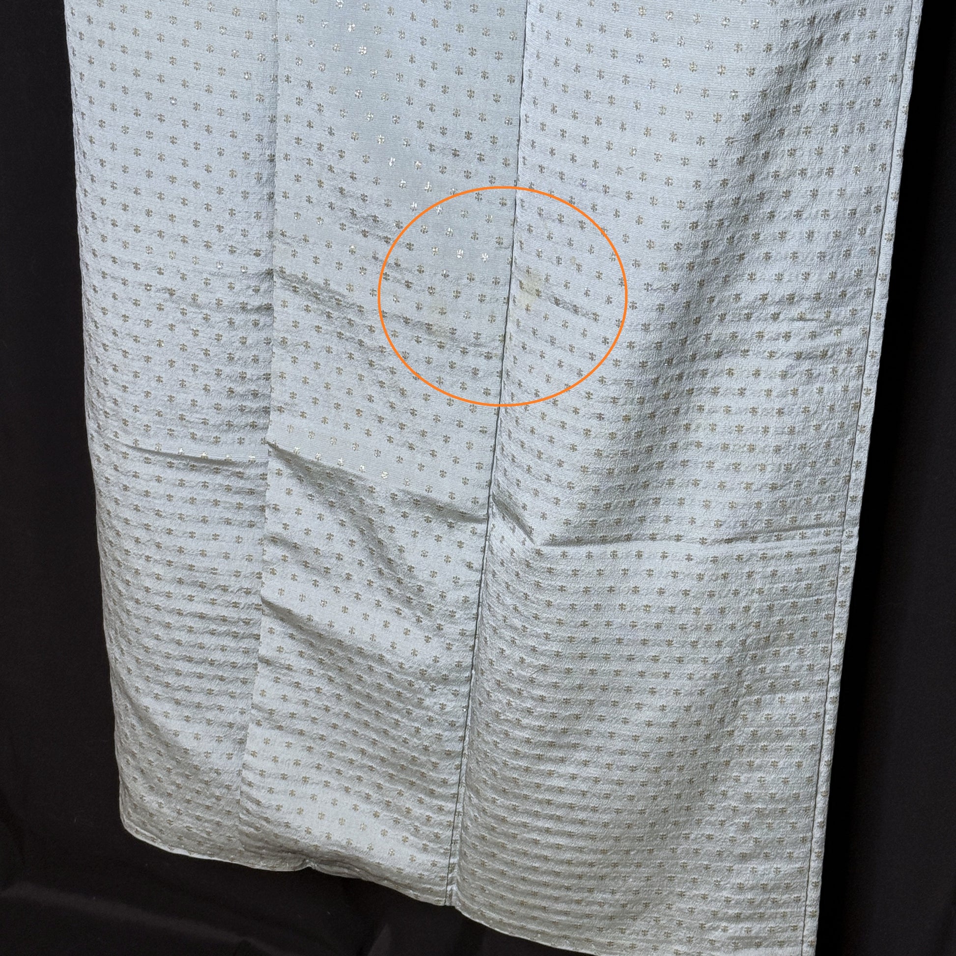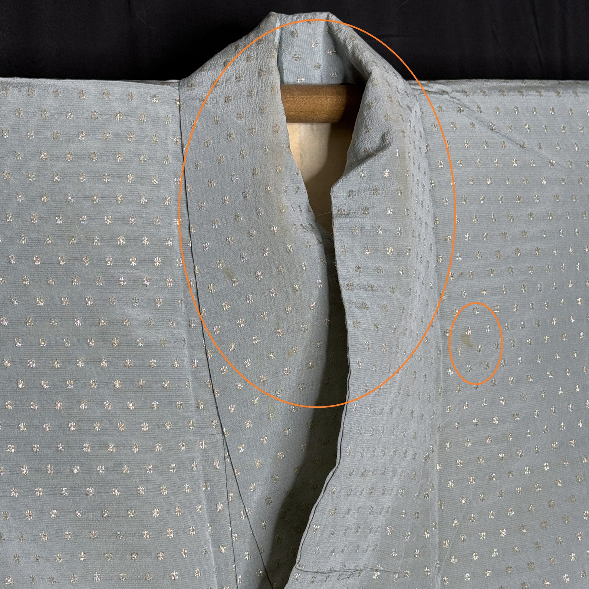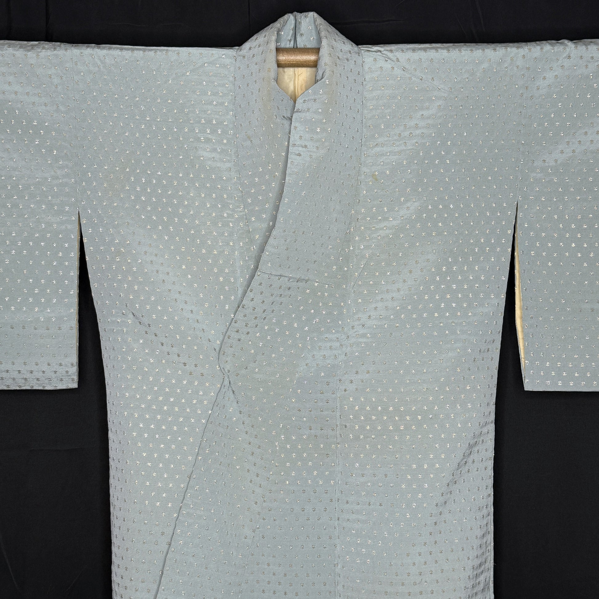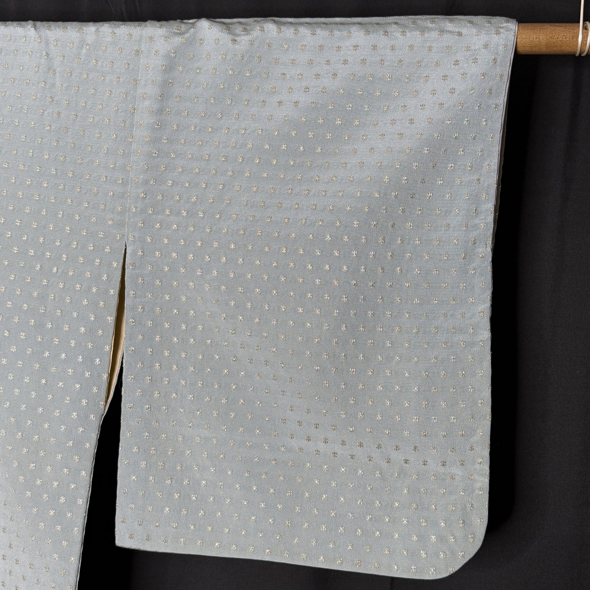 Subtle, refined, and quietly luminous, this kimono features a soft powder blue background scattered with delicate metallic gold motifs that shimmer gently as they catch the light. The textured weave adds depth and dimension that draws attention - creating an elegant, understated presence. Serene and special!