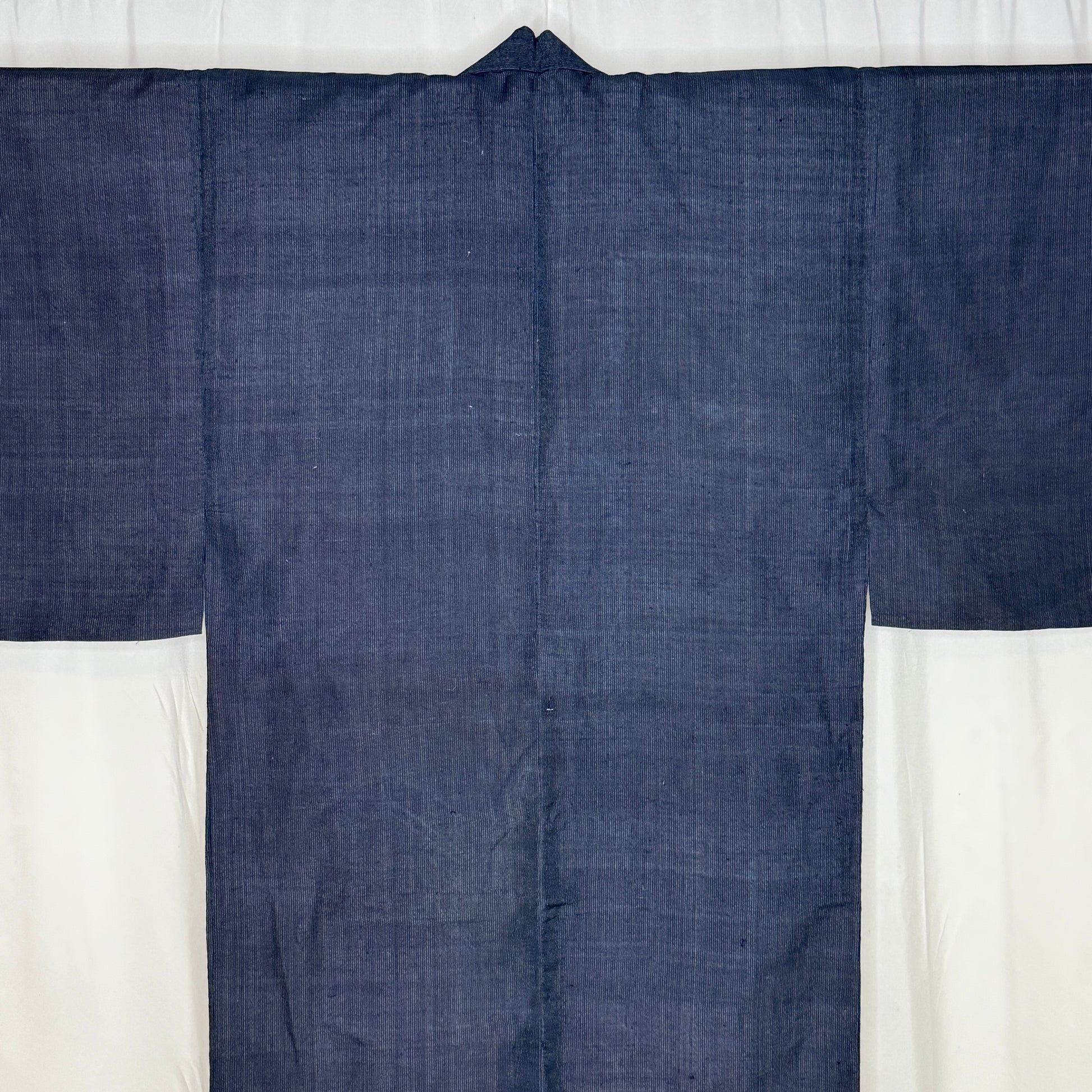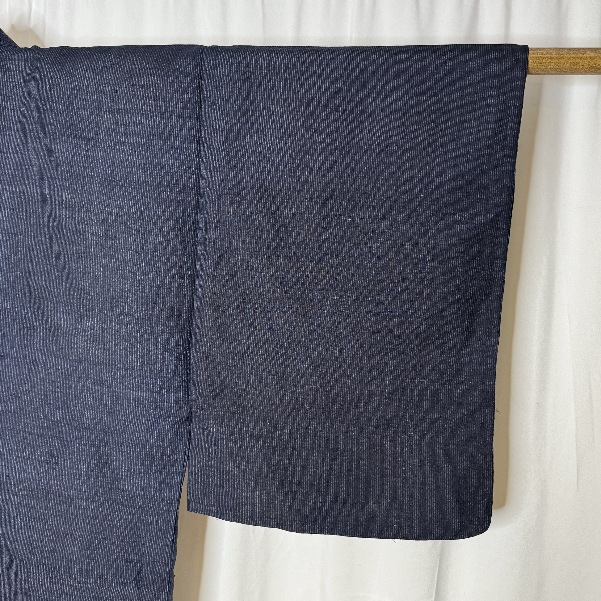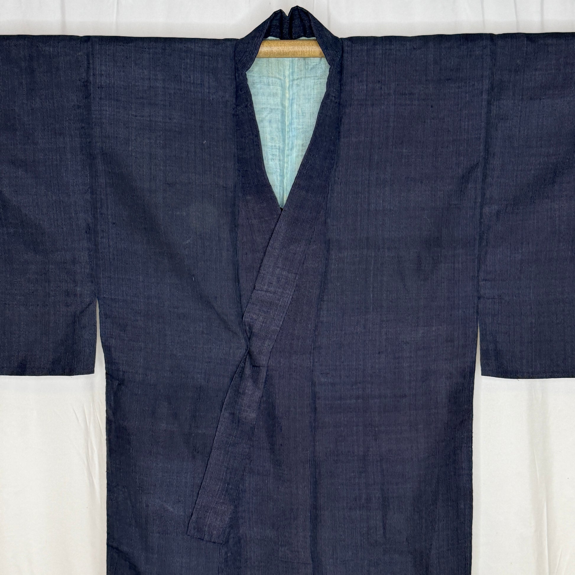 Soft-spoken and full of depth, this vintage men's kimono captures the character of Japanese sophistication. It features a narrow stripe weave that gives texture, while the pale blue partial lining at the shoulders adds a touch of quiet contrast. This kimono is meant for summer as the fabric is lightweight and slightly sheer.