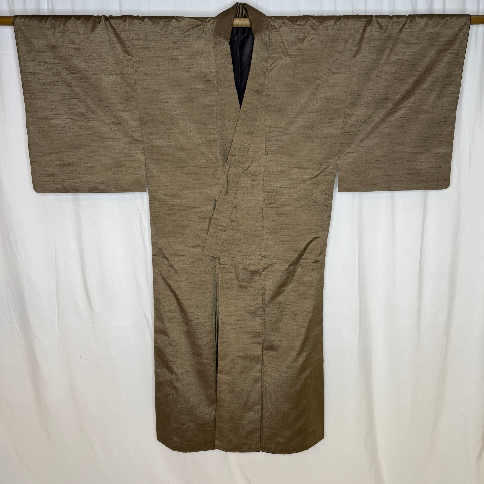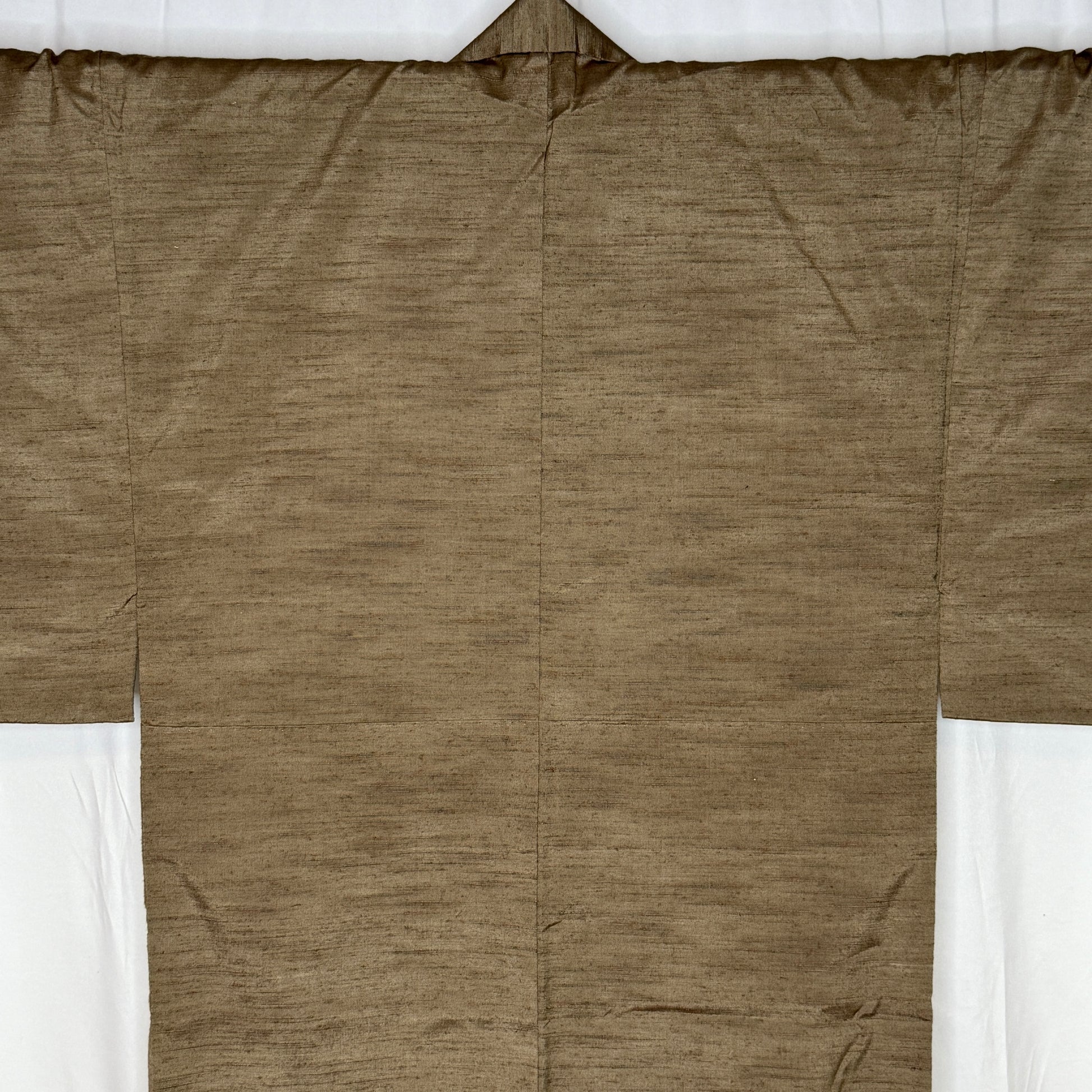 This elegant men's kimono exudes quiet refinement through its soft brown silk with a natural slub weave that catches the light with warm golden undertones. The understated surface variation gives it an earthy, organic feel, like tones of sunlit sand or weathered bronze. Fully lined in smooth brown silk.