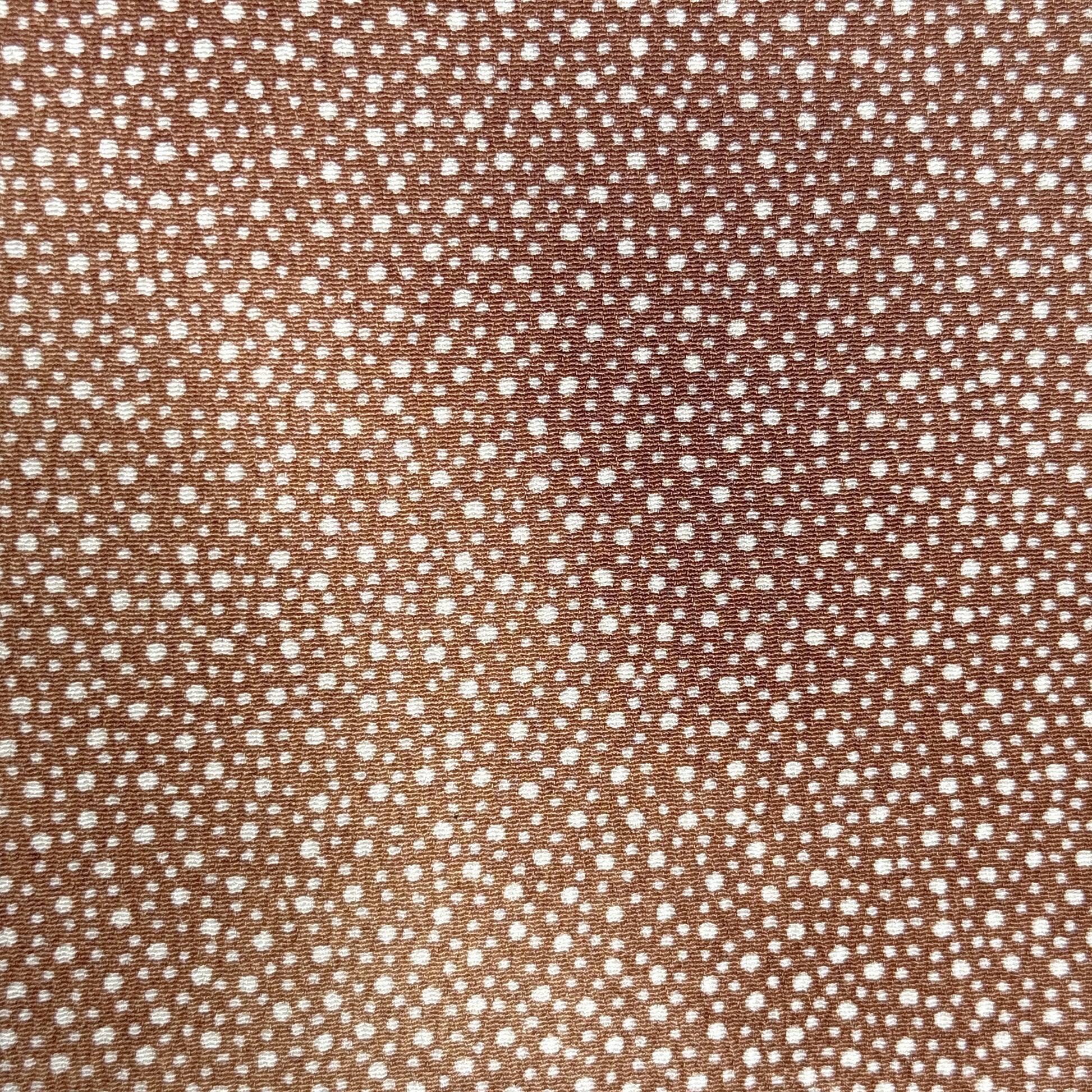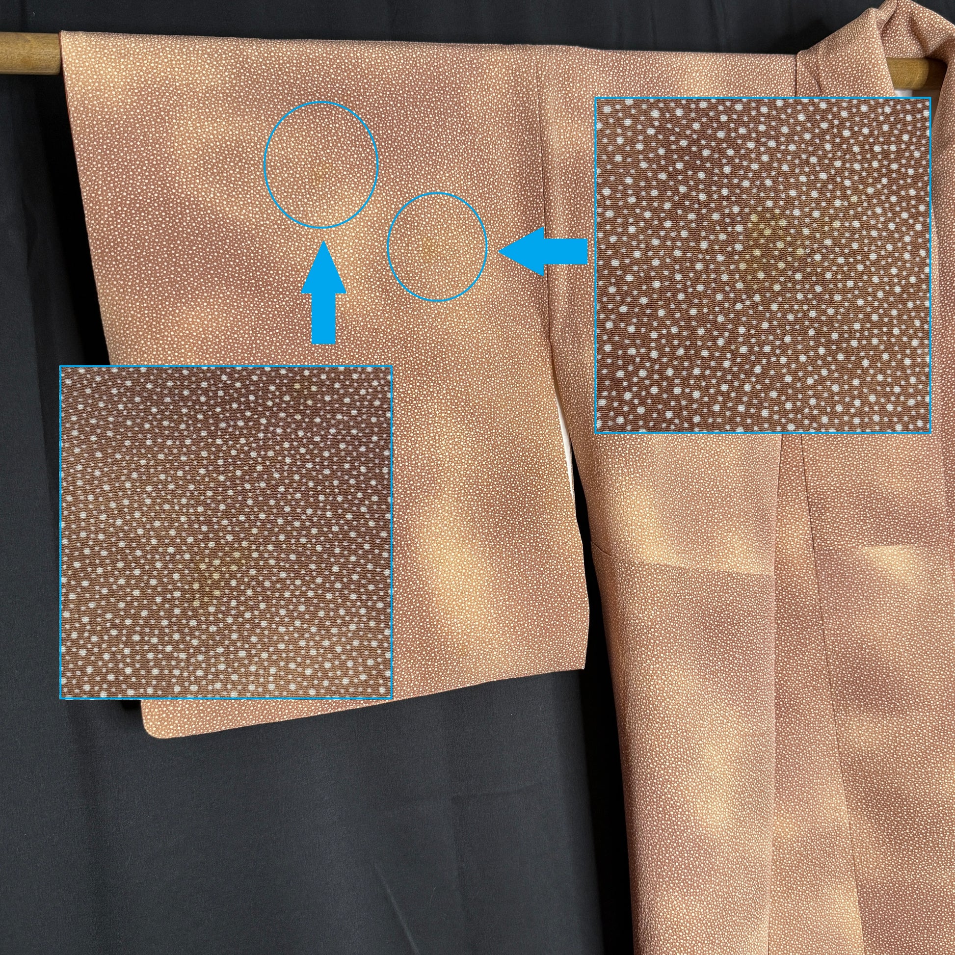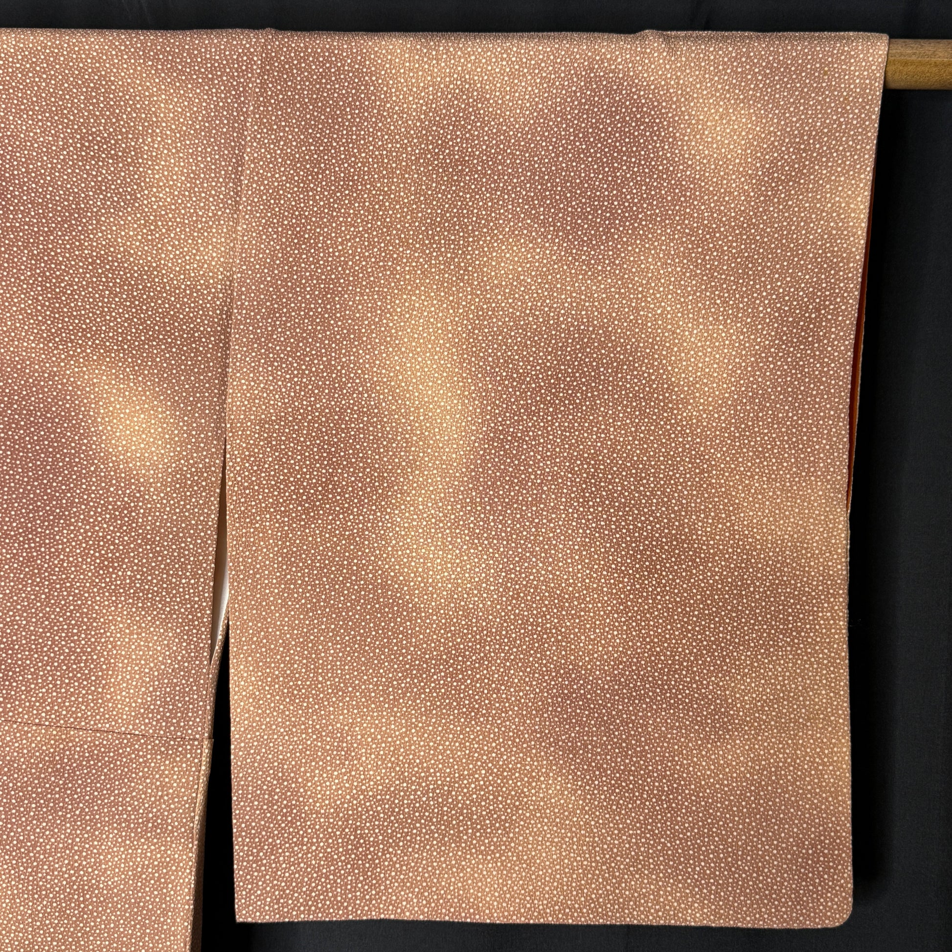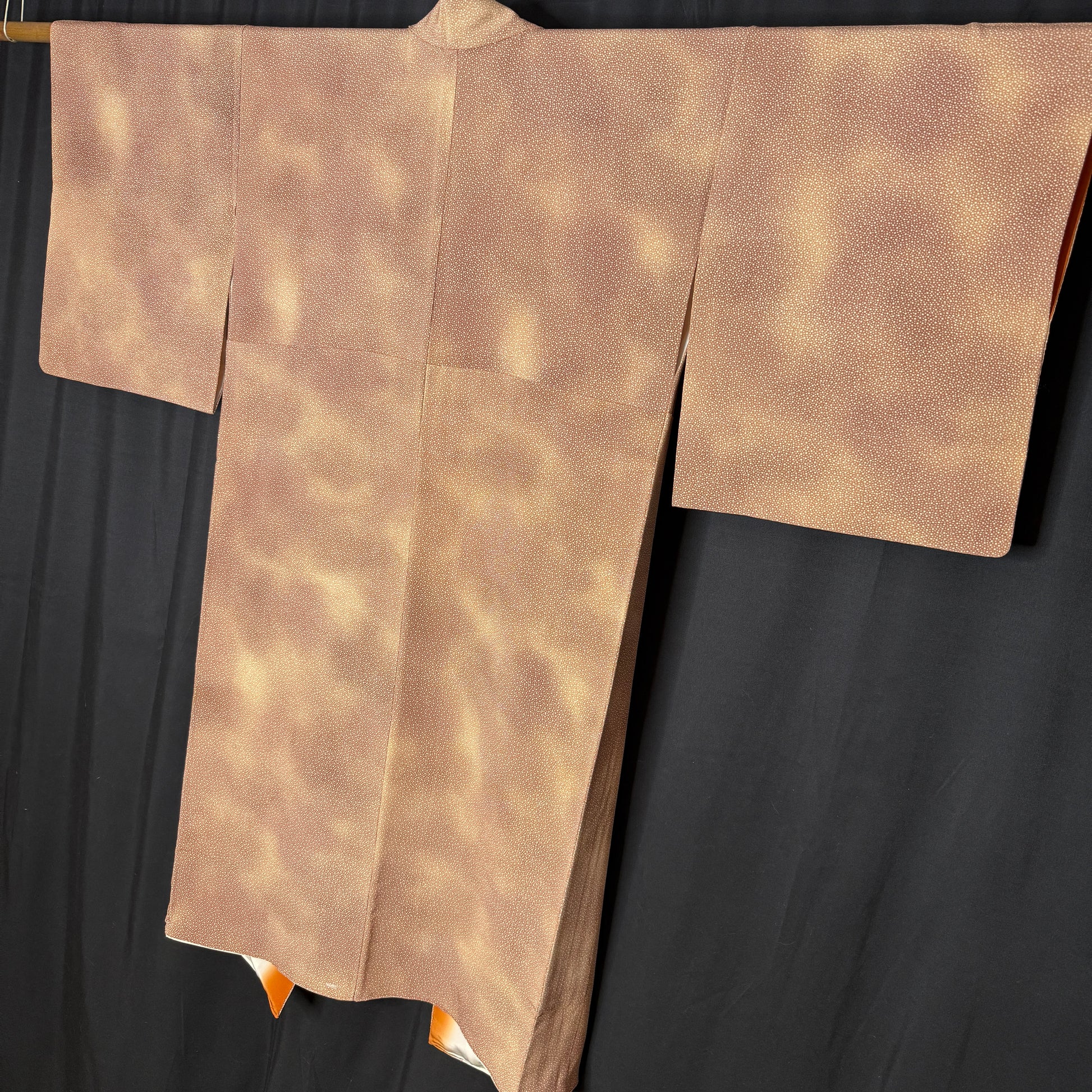 Warm, earthy tones and delicate patterning give this vintage kimono robe a quietly striking presence. The silk features a fine allover dotted komon (small repeat) design, creating subtle texture and visual depth. Look closely to see the speckled tone-on-tone jacquard that echoes the dotted snow-like pattern. The background has soft gradations, creating a hazy, overcast look in warm tan and caramel tones.