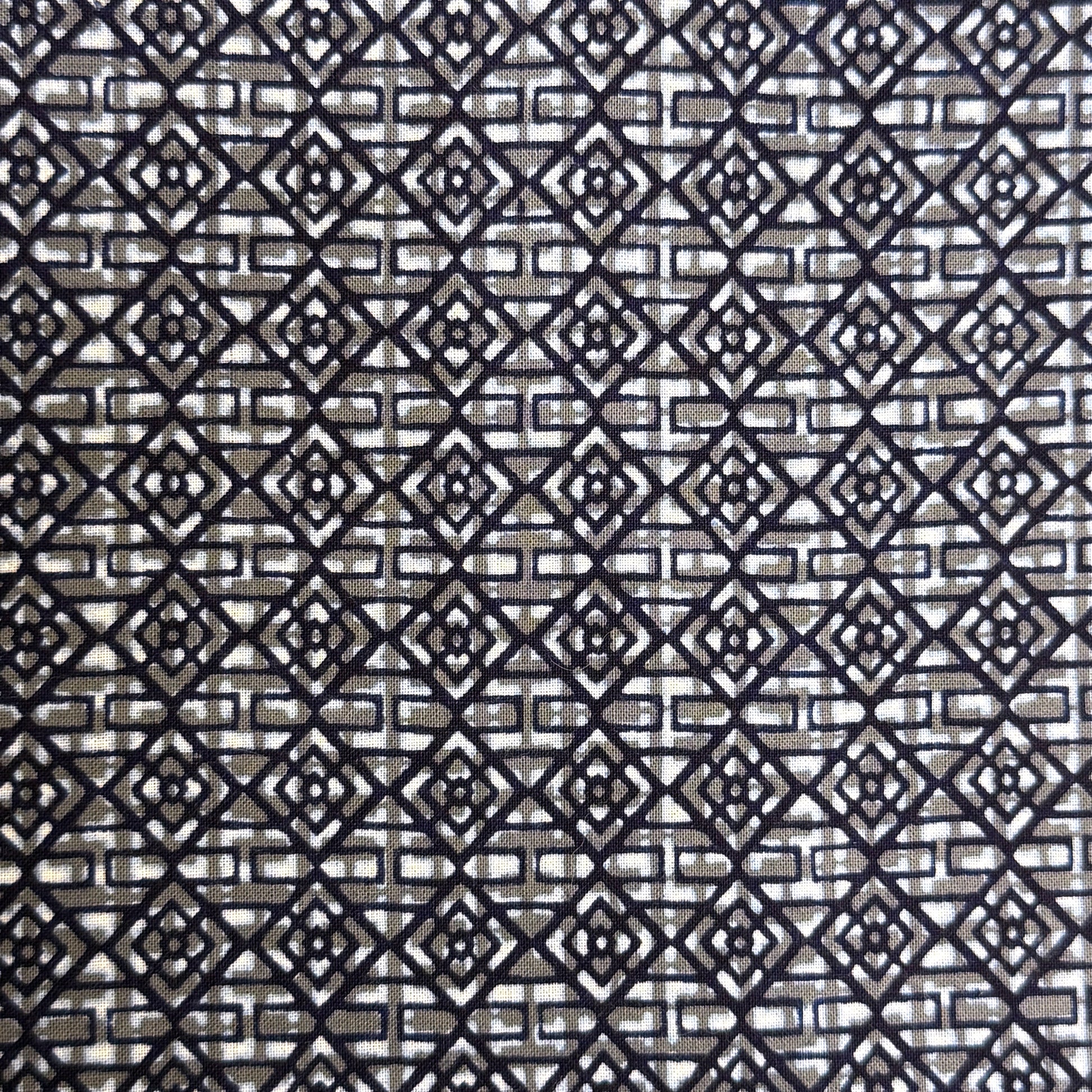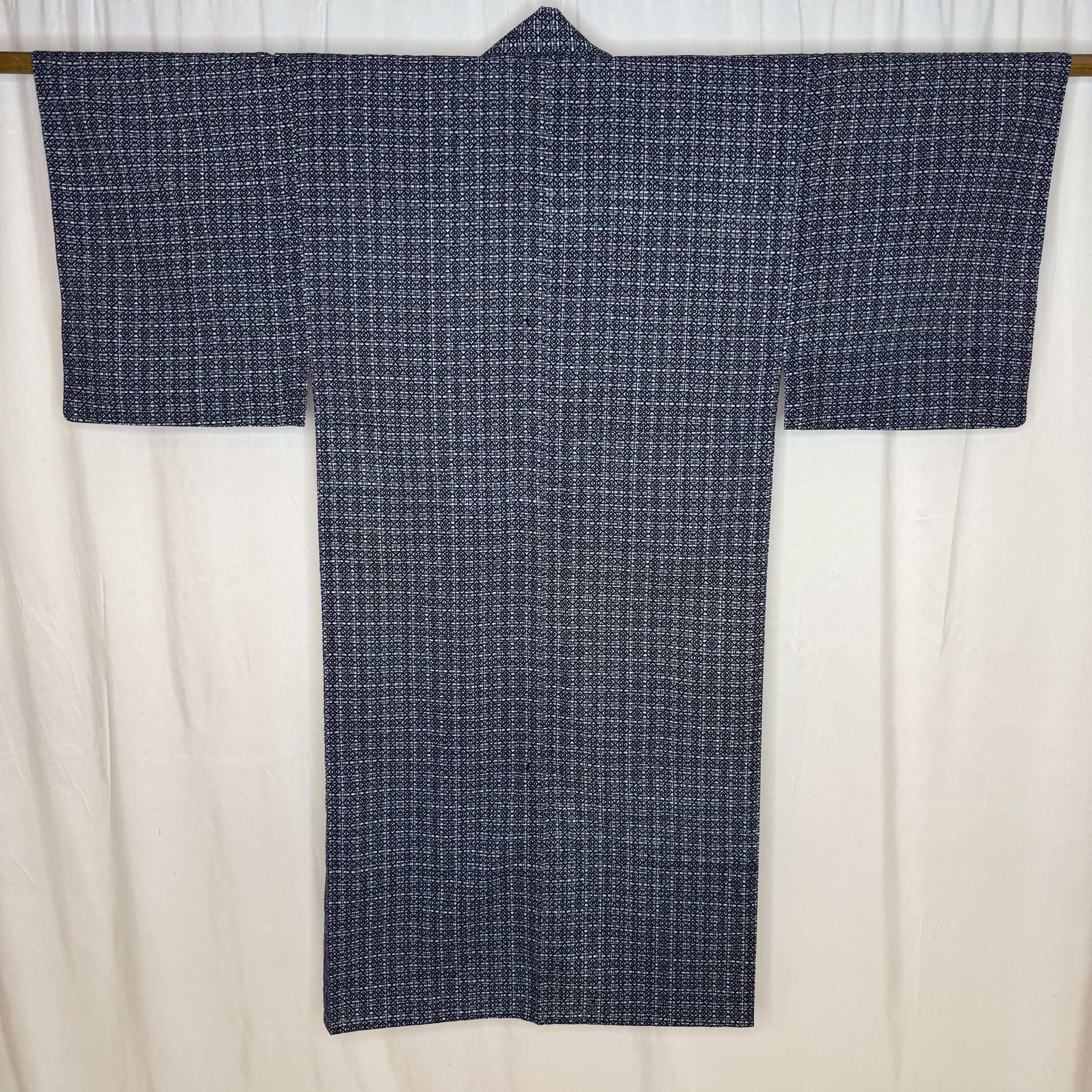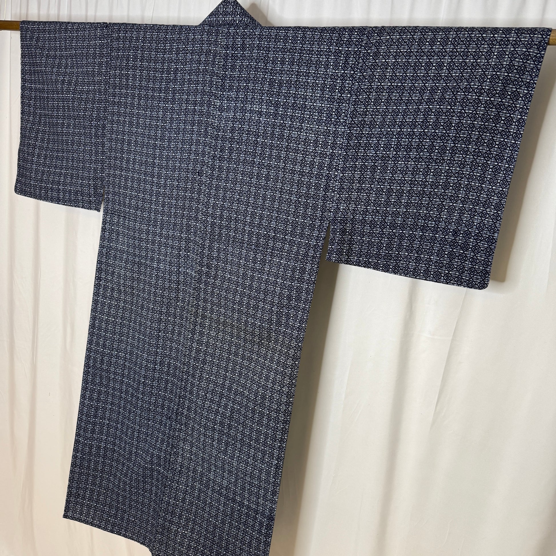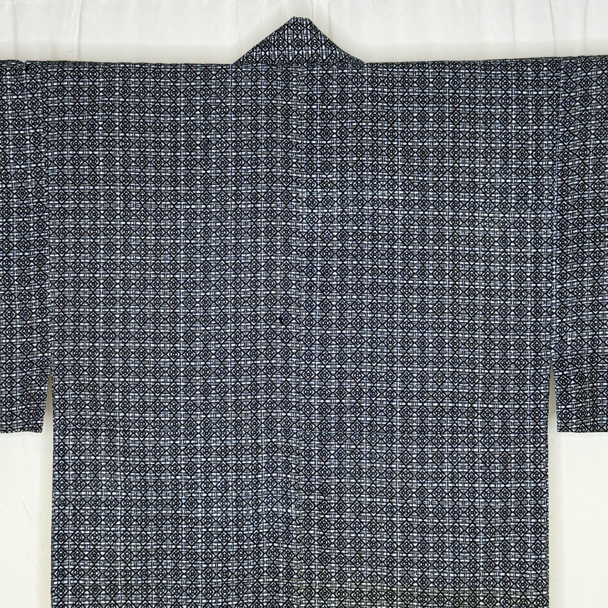This yukata pulls you in with the many intersecting and overlapping gray lines, with a layer of blue diamonds printed on top. Each diamond contains a square-petaled geometric flower. The all-over print creates a calm, architectural look that feels both traditional and modern, perfect for anyone who loves understated patterns and timeless Japanese craft.