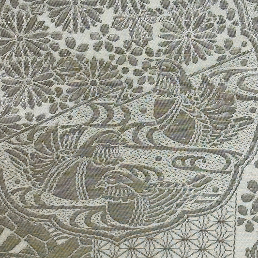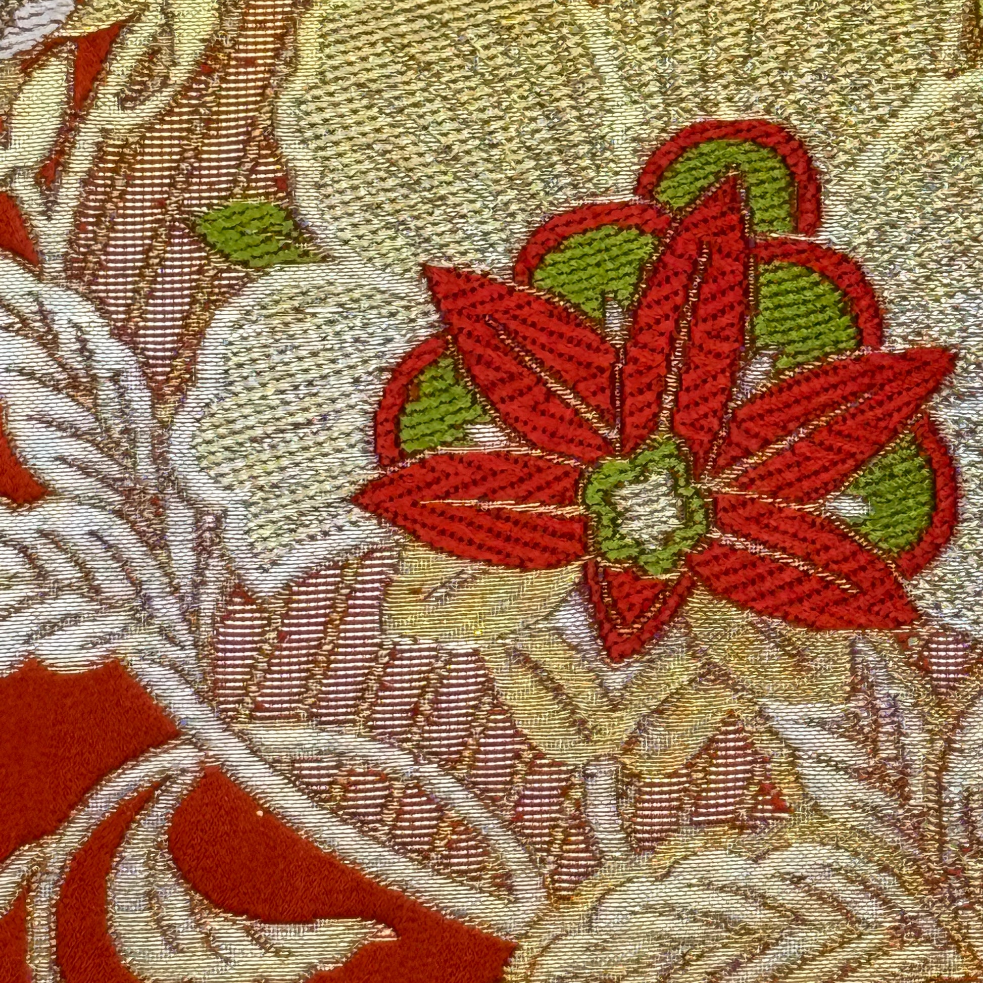 Bold and luminous, this tapestry captures the richness of red-orange silk paired with intricate gold weaving and striking florals. The vivid red tones symbolize celebration, good fortune, and vitality in Japanese culture, while the gold accents elevate the piece with a sense of formality and prosperity. The stylized flower, framed within layered patterns, evokes traditional seasonal blooms often associated with beauty and renewal.