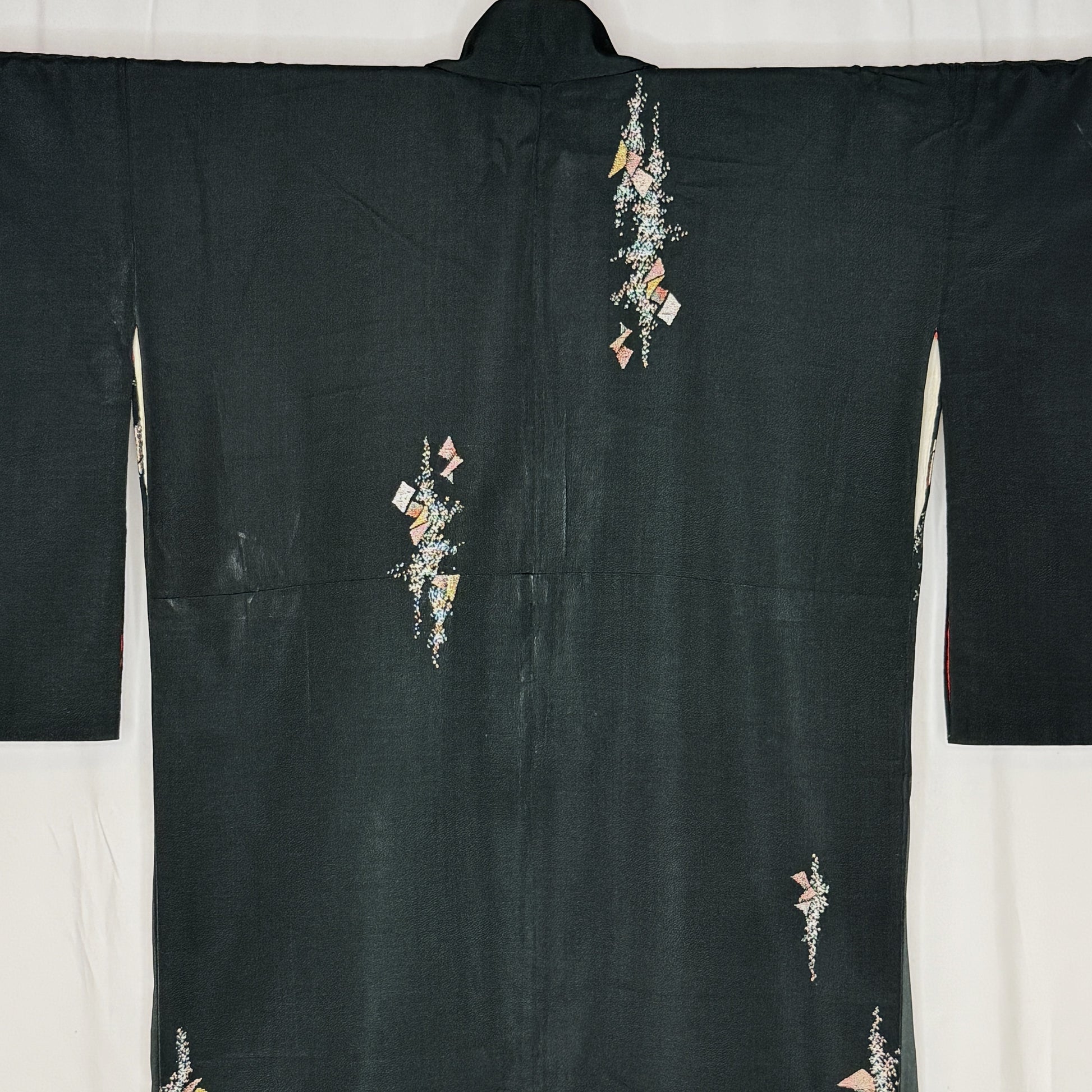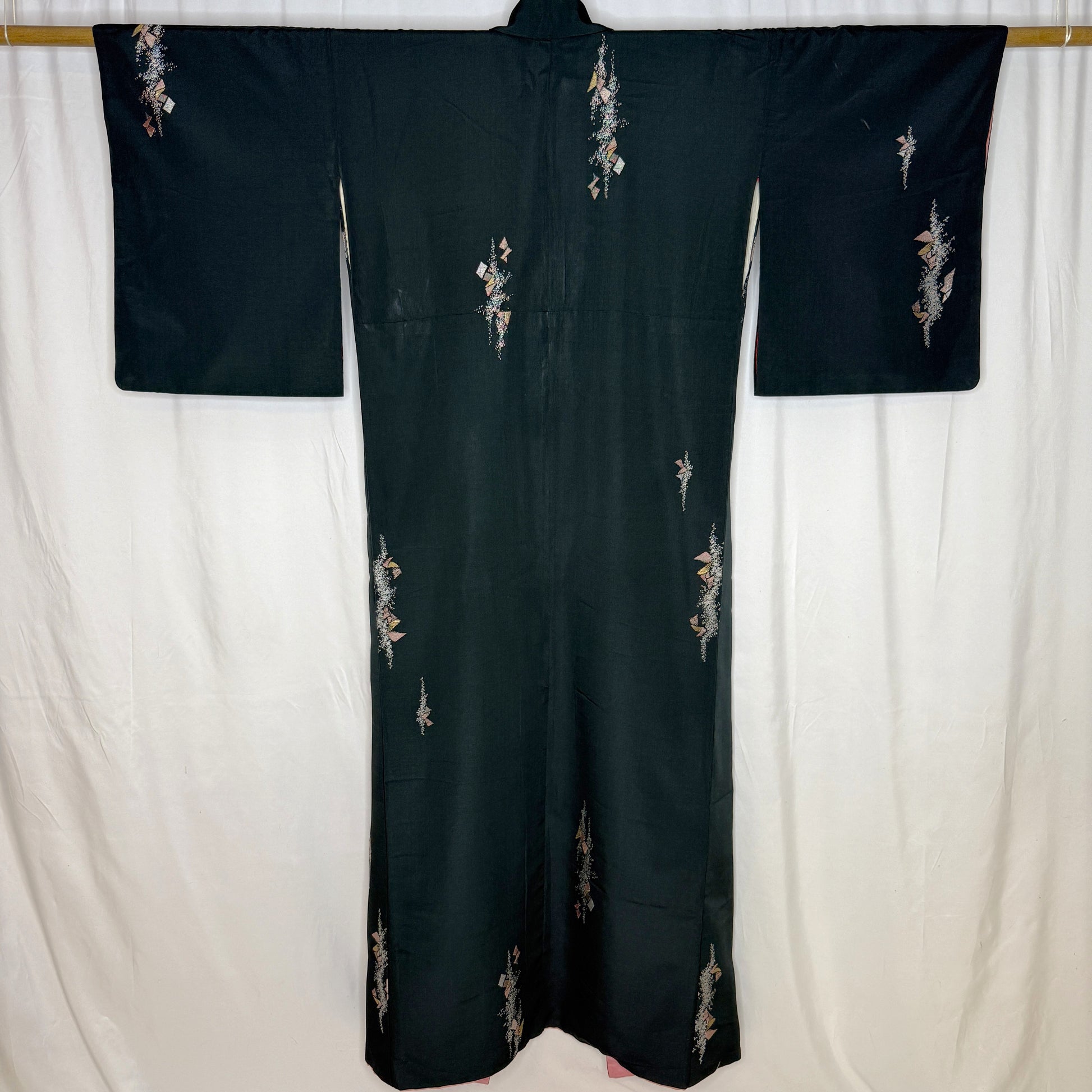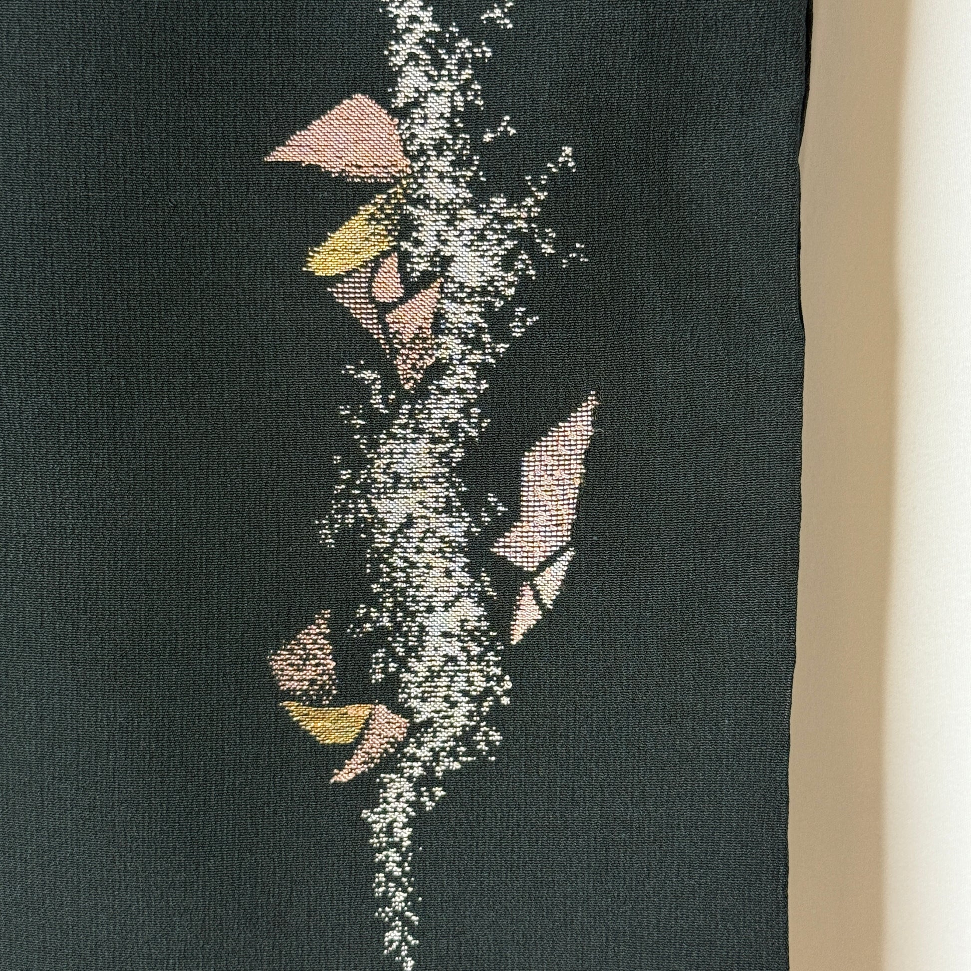 This dark green vintage kimono carries the quiet magic of winter woodlands, accented with soft streams of stylized floral sprigs that seems to drift like a gentle snowfall. Each motif is woven with touches of gold, blush pink, and silver that brighten the deep evergreen silk. The effect is subtle but full of charm, creating a refined holiday air.