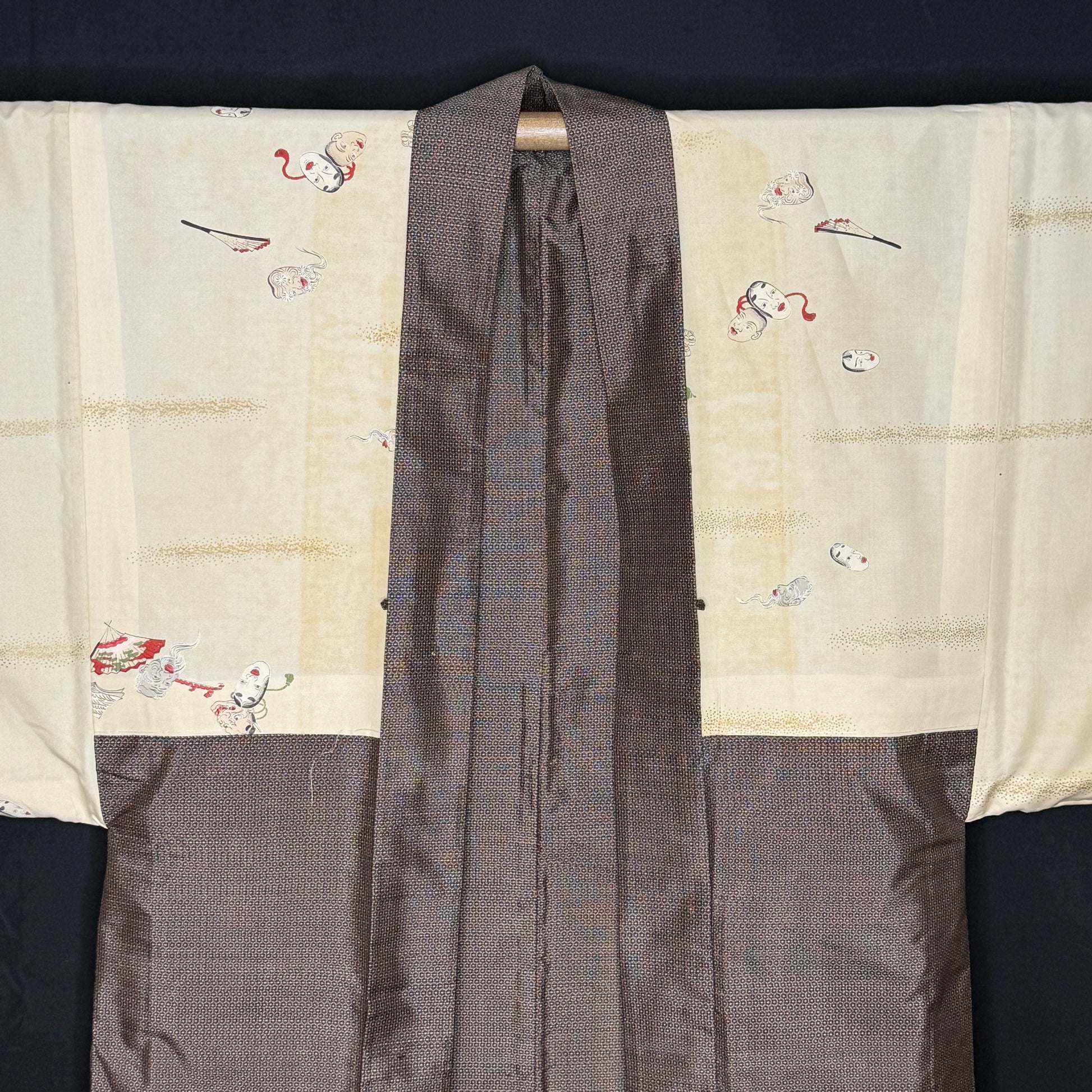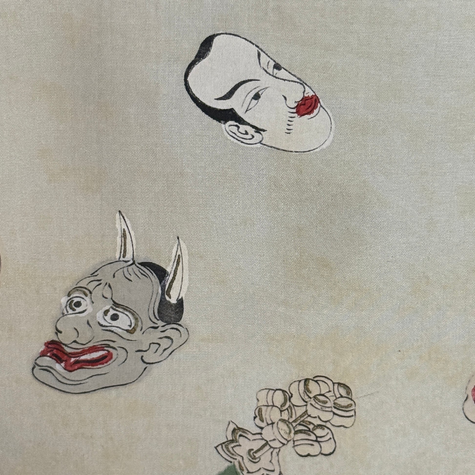 The lining of this man's kimono jacket captures the wit and spirit of traditional Japanese theater illustrated in delicate detail. Noh and Kyogen masks float across the pale background, interspersed with fans, scrolls, and soft clouds of gold brushwork. Each mask tells a story of laughter, mischief, and wisdom making this garment both elegant attire and a conversation piece.