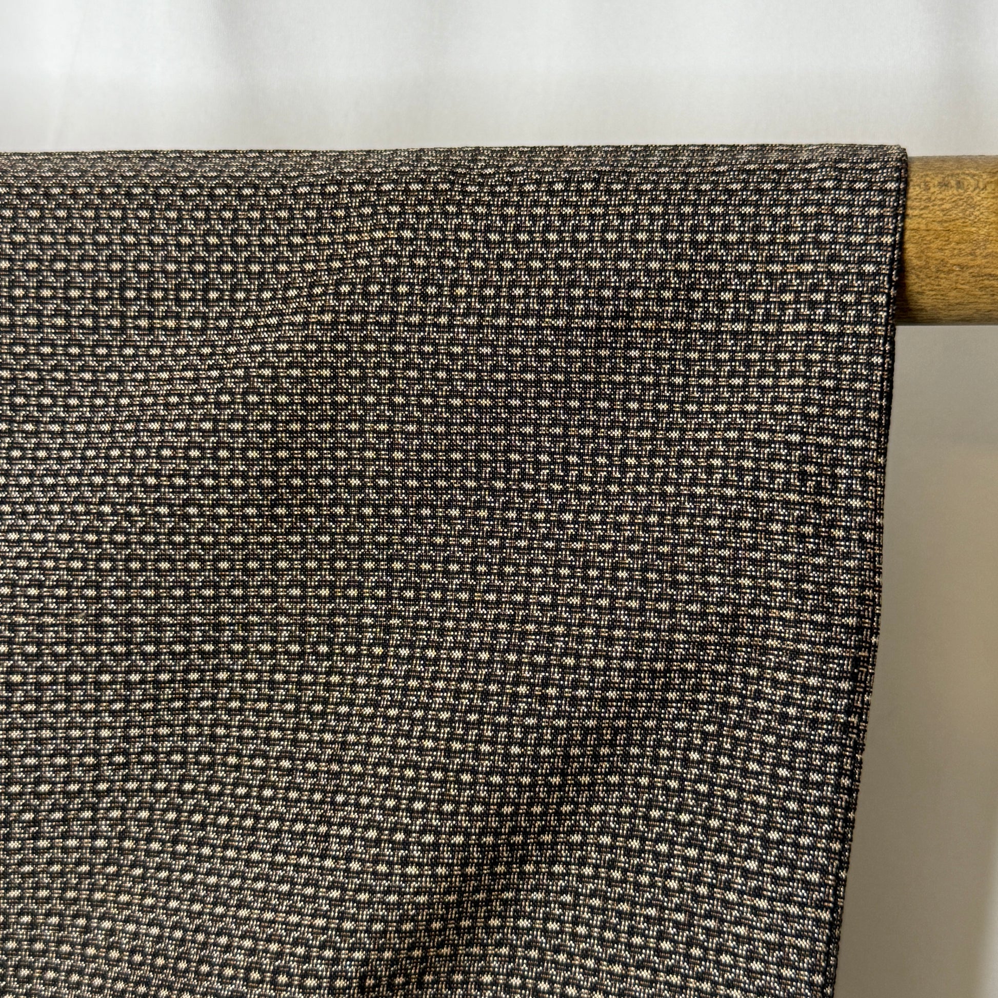 The outer jacket fabric is brown with an overall tiny geometric grid.